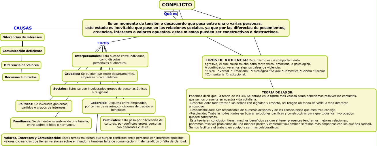 Este Cmap, tiene información relacionada con: EL CONFLICTO, Es un momento de tensión o desacuerdo que pasa entre una o varias personas, este estado es inevitable que pase en las relaciones sociales, ya que por las diferecias de pesamientos, creencias, intereses o valores opuestos. estos mismos pueden ser constructivos o destructivos. TIPOS Politicos: Se involucra gobiernos, partidos o grupos de intereses., Es un momento de tensión o desacuerdo que pasa entre una o varias personas, este estado es inevitable que pase en las relaciones sociales, ya que por las diferecias de pesamientos, creencias, intereses o valores opuestos. estos mismos pueden ser constructivos o destructivos. TIPOS Valores, Intereses y Comunicación: Estos temas muestran que surgen conflictos entre personas con intereses opuestos, valores o creencias que tienen versiones sobre el mundo, y tambien falta de comunicación, malentendidos o falta de claridad., Es un momento de tensión o desacuerdo que pasa entre una o varias personas, este estado es inevitable que pase en las relaciones sociales, ya que por las diferecias de pesamientos, creencias, intereses o valores opuestos. estos mismos pueden ser constructivos o destructivos. CAUSAS Comunicación deficiente, Es un momento de tensión o desacuerdo que pasa entre una o varias personas, este estado es inevitable que pase en las relaciones sociales, ya que por las diferecias de pesamientos, creencias, intereses o valores opuestos. estos mismos pueden ser constructivos o destructivos. CAUSAS Diferencias de intereses, CONFLICTO Qué es Es un momento de tensión o desacuerdo que pasa entre una o varias personas, este estado es inevitable que pase en las relaciones sociales, ya que por las diferecias de pesamientos, creencias, intereses o valores opuestos. estos mismos pueden ser constructivos o destructivos., Es un momento de tensión o desacuerdo que pasa entre una o varias personas, este estado es inevitable que pase en las relaciones sociales, ya que por las diferecias de pesamientos, creencias, intereses o valores opuestos. estos mismos pueden ser constructivos o destructivos. TIPOS Grupales: Se pueden dar entre departamentos, empresas o comunidades., Es un momento de tensión o desacuerdo que pasa entre una o varias personas, este estado es inevitable que pase en las relaciones sociales, ya que por las diferecias de pesamientos, creencias, intereses o valores opuestos. estos mismos pueden ser constructivos o destructivos. TIPOS Sociales: Estos se ven involucrados grupos de personas,étnicos o religiosos., Es un momento de tensión o desacuerdo que pasa entre una o varias personas, este estado es inevitable que pase en las relaciones sociales, ya que por las diferecias de pesamientos, creencias, intereses o valores opuestos. estos mismos pueden ser constructivos o destructivos. CAUSAS Recursos Limitados, Es un momento de tensión o desacuerdo que pasa entre una o varias personas, este estado es inevitable que pase en las relaciones sociales, ya que por las diferecias de pesamientos, creencias, intereses o valores opuestos. estos mismos pueden ser constructivos o destructivos. TIPOS Interpersonales: Esto sucede entre individuos, como disputas personales o laborales., Es un momento de tensión o desacuerdo que pasa entre una o varias personas, este estado es inevitable que pase en las relaciones sociales, ya que por las diferecias de pesamientos, creencias, intereses o valores opuestos. estos mismos pueden ser constructivos o destructivos. CAUSAS Diferencia de Valores, CONFLICTO ???? TIPOS DE VIOLENCIA: Este mismo es un comportamiento agresivo, el cual causa mucho daño tanto fisico, emocional o psicologico. A continuacion veremos algunos calses de violencia: *Fisica *Verbal * Emocional *Psicológica *Sexual *Domestica *Género *Escolar *Comunitaria *Institucional., Es un momento de tensión o desacuerdo que pasa entre una o varias personas, este estado es inevitable que pase en las relaciones sociales, ya que por las diferecias de pesamientos, creencias, intereses o valores opuestos. estos mismos pueden ser constructivos o destructivos. TIPOS Familiares: Se dan entre miembros de una familia, entre padres e hijos o hermanos., Es un momento de tensión o desacuerdo que pasa entre una o varias personas, este estado es inevitable que pase en las relaciones sociales, ya que por las diferecias de pesamientos, creencias, intereses o valores opuestos. estos mismos pueden ser constructivos o destructivos. TIPOS Laborales: Disputas entre empleados, por temas de salarios,condiciones de trabajo o beneficios., Es un momento de tensión o desacuerdo que pasa entre una o varias personas, este estado es inevitable que pase en las relaciones sociales, ya que por las diferecias de pesamientos, creencias, intereses o valores opuestos. estos mismos pueden ser constructivos o destructivos. CAUSAS Diferencias de intereses, Es un momento de tensión o desacuerdo que pasa entre una o varias personas, este estado es inevitable que pase en las relaciones sociales, ya que por las diferecias de pesamientos, creencias, intereses o valores opuestos. estos mismos pueden ser constructivos o destructivos. TIPOS Culturales: Esto paso por diferencias de culturas, por conflictos entres personas con diferentes cultura., CONFLICTO ???? TEORIA DE LAS 3R: Podemos decir que la teoria de las 3R, Se enfoca en la forma mas valiosa como deberiamos resolver los conflictos, que se nos presenta en nuestra vida cotidiana. -Respeto: Ante todo tratar a los demas con dignidad y respeto, asi tengan un modo de verla la vida diferente a nosotros. -Responsabilidad: Ser responsable de nuestras acciones y de las consecuencia que esto trae consigo. -Resolución: Trabajar todos juntos en buscar soluciones pacificas y constructivas para que todos los involucrados queden satisfechas. Esta teoria en conclusion tienen muchos beneficios ya que al tener presentes tendremos mejores relaciones, podremos resolver problemas de una manera 