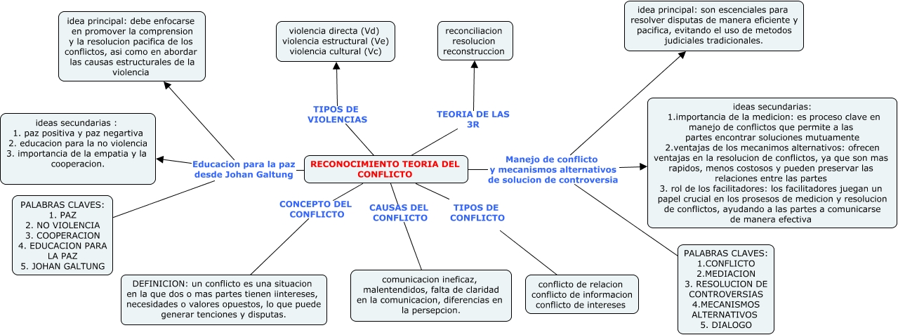 Este Cmap, tiene información relacionada con: Mapa conceptual, RECONOCIMIENTO TEORIA DEL CONFLICTO Educacion para la paz desde Johan Galtung PALABRAS CLAVES: 1. PAZ 2. NO VIOLENCIA 3. COOPERACION 4. EDUCACION PARA LA PAZ 5. JOHAN GALTUNG, RECONOCIMIENTO TEORIA DEL CONFLICTO CAUSAS DEL CONFLICTO comunicacion ineficaz, malentendidos, falta de claridad en la comunicacion, diferencias en la persepcion., RECONOCIMIENTO TEORIA DEL CONFLICTO Educacion para la paz desde Johan Galtung idea principal: debe enfocarse en promover la comprension y la resolucion pacifica de los conflictos, asi como en abordar las causas estructurales de la violencia, RECONOCIMIENTO TEORIA DEL CONFLICTO Manejo de conflicto y mecanismos alternativos de solucion de controversia PALABRAS CLAVES: 1.CONFLICTO 2.MEDIACION 3. RESOLUCION DE CONTROVERSIAS 4.MECANISMOS ALTERNATIVOS 5. DIALOGO, RECONOCIMIENTO TEORIA DEL CONFLICTO TEORIA DE LAS 3R reconciliacion resolucion reconstruccion, RECONOCIMIENTO TEORIA DEL CONFLICTO Manejo de conflicto y mecanismos alternativos de solucion de controversia idea principal: son escenciales para resolver disputas de manera eficiente y pacifica, evitando el uso de metodos judiciales tradicionales., RECONOCIMIENTO TEORIA DEL CONFLICTO TIPOS DE CONFLICTO conflicto de relacion conflicto de informacion conflicto de intereses, RECONOCIMIENTO TEORIA DEL CONFLICTO Educacion para la paz desde Johan Galtung ideas secundarias : 1. paz positiva y paz negartiva 2. educacion para la no violencia 3. importancia de la empatia y la cooperacion., RECONOCIMIENTO TEORIA DEL CONFLICTO TIPOS DE VIOLENCIAS violencia directa (Vd) violencia estructural (Ve) violencia cultural (Vc), RECONOCIMIENTO TEORIA DEL CONFLICTO CONCEPTO DEL CONFLICTO DEFINICION: un conflicto es una situacion en la que dos o mas partes tienen iintereses, necesidades o valores opuestos, lo que puede generar tenciones y disputas., RECONOCIMIENTO TEORIA DEL CONFLICTO Manejo de conflicto y mecanismos alternativos de solucion de controversia ideas secundarias: 1.importancia de la medicion: es proceso clave en manejo de conflictos que permite a las partes encontrar soluciones mutuamente 2.ventajas de los mecanimos alternativos: ofrecen ventajas en la resolucion de conflictos, ya que son mas rapidos, menos costosos y pueden preservar las relaciones entre las partes 3. rol de los facilitadores: los facilitadores juegan un papel crucial en los prosesos de medicion y resolucion de conflictos, ayudando a las partes a comunicarse de manera efectiva