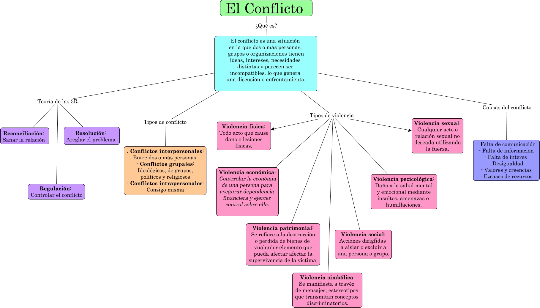 Este Cmap, tiene información relacionada con: conflicto, El conflicto es una situación en la que dos o más personas, grupos o organizaciones tienen ideas, intereses, necesidades distintas y parecen ser incompatibles, lo que genera una discusión o enfrentamiento. Tipos de violencia Violencia pscicológica: Daño a la salud mental y emocional mediante insultos, amenazas o humillaciones., El conflicto es una situación en la que dos o más personas, grupos o organizaciones tienen ideas, intereses, necesidades distintas y parecen ser incompatibles, lo que genera una discusión o enfrentamiento. Tipos de violencia Violencia social: Acciones dirigfidas a aislar o excluir a una persona o grupo., El conflicto es una situación en la que dos o más personas, grupos o organizaciones tienen ideas, intereses, necesidades distintas y parecen ser incompatibles, lo que genera una discusión o enfrentamiento. Tipos de violencia Violencia económica: Contrrolar la económia de una persona para asegurar dependencia financiera y ejercer control sobre ella., El conflicto es una situación en la que dos o más personas, grupos o organizaciones tienen ideas, intereses, necesidades distintas y parecen ser incompatibles, lo que genera una discusión o enfrentamiento. Tipos de violencia Violencia sexual: Cualquier acto o relación sexual no deseada utilizando la fuerza., El conflicto es una situación en la que dos o más personas, grupos o organizaciones tienen ideas, intereses, necesidades distintas y parecen ser incompatibles, lo que genera una discusión o enfrentamiento. Teoría de las 3R Regulación: Controlar el conflicto, El conflicto es una situación en la que dos o más personas, grupos o organizaciones tienen ideas, intereses, necesidades distintas y parecen ser incompatibles, lo que genera una discusión o enfrentamiento. Teoría de las 3R Reconciliación: Sanar la relación, El Conflicto ¿Qué es? El conflicto es una situación en la que dos o más personas, grupos o organizaciones tienen ideas, intereses, necesidades distintas y parecen ser incompatibles, lo que genera una discusión o enfrentamiento., El conflicto es una situación en la que dos o más personas, grupos o organizaciones tienen ideas, intereses, necesidades distintas y parecen ser incompatibles, lo que genera una discusión o enfrentamiento. Tipos de conflicto . Conflictos interpersonales: Entre dos o más personas - Conflictos grupales: Ideológicos, de grupos, politicos y religiosos - Conflictos intrapersonales: Consigo misma, El conflicto es una situación en la que dos o más personas, grupos o organizaciones tienen ideas, intereses, necesidades distintas y parecen ser incompatibles, lo que genera una discusión o enfrentamiento. Tipos de violencia Violencia fisica: Todo acto que cause daño o lesiones fisicas., El conflicto es una situación en la que dos o más personas, grupos o organizaciones tienen ideas, intereses, necesidades distintas y parecen ser incompatibles, lo que genera una discusión o enfrentamiento. Causas del conflicto - Falta de comunicación - Falta de información - Falta de interes . Desigualdad - Valores y creencias - Ezcases de recursos, El conflicto es una situación en la que dos o más personas, grupos o organizaciones tienen ideas, intereses, necesidades distintas y parecen ser incompatibles, lo que genera una discusión o enfrentamiento. Tipos de violencia Violencia patrimonial: Se refiere a la destrucción o perdida de bienes de vualquier elemento que pueda afectar afectar la supervivencia de la victima., El conflicto es una situación en la que dos o más personas, grupos o organizaciones tienen ideas, intereses, necesidades distintas y parecen ser incompatibles, lo que genera una discusión o enfrentamiento. Teoría de las 3R Resolución: Areglar el problema, El conflicto es una situación en la que dos o más personas, grupos o organizaciones tienen ideas, intereses, necesidades distintas y parecen ser incompatibles, lo que genera una discusión o enfrentamiento. Tipos de violencia Violencia simbólica: Se manifiesta a travéz de mensajes, estereotipos que transmitan conceptos discriminatorios.