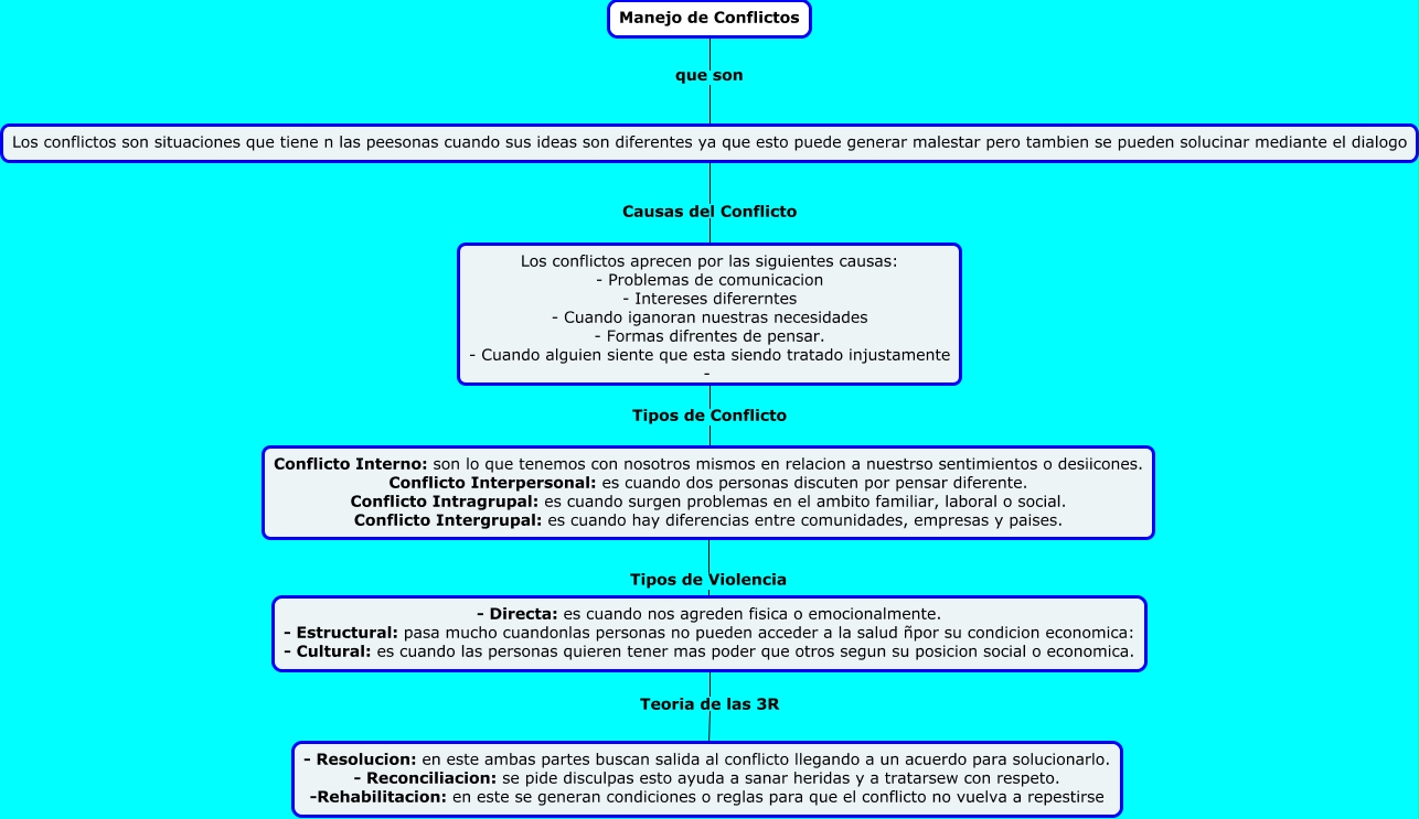 Este Cmap, tiene información relacionada con: Mapa conceptual Manejo de Conflictos, - Directa: es cuando nos agreden fisica o emocionalmente. - Estructural: pasa mucho cuandonlas personas no pueden acceder a la salud ñpor su condicion economica: - Cultural: es cuando las personas quieren tener mas poder que otros segun su posicion social o economica. Teoria de las 3R - Resolucion: en este ambas partes buscan salida al conflicto llegando a un acuerdo para solucionarlo. - Reconciliacion: se pide disculpas esto ayuda a sanar heridas y a tratarsew con respeto. -Rehabilitacion: en este se generan condiciones o reglas para que el conflicto no vuelva a repestirse, Manejo de Conflictos que son Los conflictos son situaciones que tiene n las peesonas cuando sus ideas son diferentes ya que esto puede generar malestar pero tambien se pueden solucinar mediante el dialogo, Los conflictos son situaciones que tiene n las peesonas cuando sus ideas son diferentes ya que esto puede generar malestar pero tambien se pueden solucinar mediante el dialogo Causas del Conflicto Los conflictos aprecen por las siguientes causas: - Problemas de comunicacion - Intereses difererntes - Cuando iganoran nuestras necesidades - Formas difrentes de pensar. - Cuando alguien siente que esta siendo tratado injustamente -, Conflicto Interno: son lo que tenemos con nosotros mismos en relacion a nuestrso sentimientos o desiicones. Conflicto Interpersonal: es cuando dos personas discuten por pensar diferente. Conflicto Intragrupal: es cuando surgen problemas en el ambito familiar, laboral o social. Conflicto Intergrupal: es cuando hay diferencias entre comunidades, empresas y paises. Tipos de Violencia - Directa: es cuando nos agreden fisica o emocionalmente. - Estructural: pasa mucho cuandonlas personas no pueden acceder a la salud ñpor su condicion economica: - Cultural: es cuando las personas quieren tener mas poder que otros segun su posicion social o economica., Los conflictos aprecen por las siguientes causas: - Problemas de comunicacion - Intereses difererntes - Cuando iganoran nuestras necesidades - Formas difrentes de pensar. - Cuando alguien siente que esta siendo tratado injustamente - Tipos de Conflicto Conflicto Interno: son lo que tenemos con nosotros mismos en relacion a nuestrso sentimientos o desiicones. Conflicto Interpersonal: es cuando dos personas discuten por pensar diferente. Conflicto Intragrupal: es cuando surgen problemas en el ambito familiar, laboral o social. Conflicto Intergrupal: es cuando hay diferencias entre comunidades, empresas y paises.