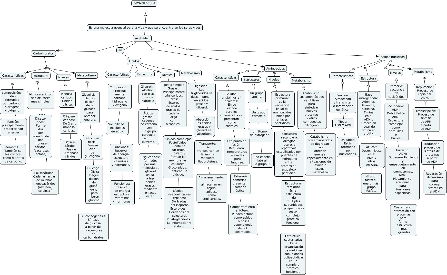 Este Cmap, tiene información relacionada con: mapa de biomolecula, Acidos nucleicos es Metabolismo, Estructura es Base nitrogenada: Adenina, Guanina, Citosina, Timina en el ADN y Uracilo en lugar de timina en el ARN., Estructura es Monosacáridos: son azucares mas simples., Carbohidratos en Estructura, Acidos nucleicos es Estructura, Alto punto de fusión: Requieren temperaturas elevadas para fundirse. ???? Estereoi- someria: presentan isomería óptica., Solubilidad: Insolubles en agua. ???? Funciones: Reservar de energía estructura vitaminas y hormonas., Disacá- ridos: Forma- dos por la unión de dos monosa- cáridos. (sacarosa, lactosa) ???? Polisacáridos: Cadenas largas de muchos monosacáridos. (almidón, celulosa ), Absorción: los ácidos grasos y glicerol se absorben. Transporte: se transportan en la sangre mediante lipoproteínas., lípidos simples Grasas: Principalmente triglicéridos. Ceras: Esteres de ácidos grasos de cadena larga con alcoholes. ???? Lípidos complejos Fosfolípidos: Contiene un grupo fosfato y forman las membranas celulares. Glucolípidos: Contiene un glúcido., Solidos cristalinos e i ncoloros: En su estado puro los aminoácidos se presentan como cristales. ???? Alto punto de fusión: Requieren temperaturas elevadas para fundirse., Metabolismo es Replicación: Proceso de copia del ADN., Lípidos complejos Fosfolípidos: Contiene un grupo fosfato y forman las membranas celulares. Glucolípidos: Contiene un glúcido. ???? Lípidos insaponificables Terpenos: Derivadas del isopreno Esteroides: Derivadas del colesterol. Prostaglandinas: La inflamación y el dolor, Primario: secuencia de nucleótidos. ???? Secundario: ADN: Doble hélice. ARN: Estructura complejos como horquillas o bucles., Acidos nucleicos es Niveles, Traducción: proceso de síntesis de proteínas a partir de ADN. ???? Reparación: Mecanismo para corregir errores en el ADN., Anabolismo: Los aminoácidos se utilizan para sintetizar nuevas proteínas y otros compuestos nitrógeno. ???? Catabolismo: Los aminoácidos se degradan para obtener energía especialmente en situaciones de ayuno o estrés metabólico., Oligosa- cáridos: De 2 a lo monosa- cáridos. Polisa- cáridos: Mas de 10 monosa- cáridos., Lipidos Características, Acidos nucleicos es Características