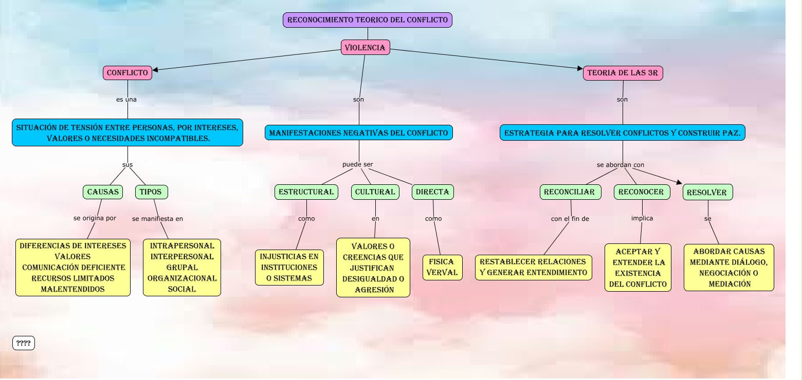 Este Cmap, tiene información relacionada con: Mapa conceptual, reconocimiento teorico del conflicto ???? VIOLENCIA, CONFLICTO es una Situación de tensión entre personas, por intereses, valores o necesidades incompatibles., tipos se manifiesta en intrapersonal interpersonal grupal organizacional social, Manifestaciones negativas del conflicto puede ser estructural, resolver se abordar causas mediante diálogo, negociación o mediación, reconocer implica aceptar y entender la existencia del conflicto, Manifestaciones negativas del conflicto puede ser cultural, cultural en valores o creencias que justifican desigualdad o agresión, reconciliar con el fin de restablecer relaciones y generar entendimiento, TEORIA DE LAS 3R son Estrategia para resolver conflictos y construir paz., VIOLENCIA son Manifestaciones negativas del conflicto, directa como fisica verval, reconocimiento teorico del conflicto ???? TEORIA DE LAS 3R, Estrategia para resolver conflictos y construir paz. se abordan con reconciliar, Manifestaciones negativas del conflicto puede ser directa, Situación de tensión entre personas, por intereses, valores o necesidades incompatibles. sus Causas, reconocimiento teorico del conflicto ???? CONFLICTO, Causas se origina por diferencias de intereses valores comunicación deficiente recursos limitados malentendidos, Situación de tensión entre personas, por intereses, valores o necesidades incompatibles. sus tipos, Estrategia para resolver conflictos y construir paz. se abordan con resolver