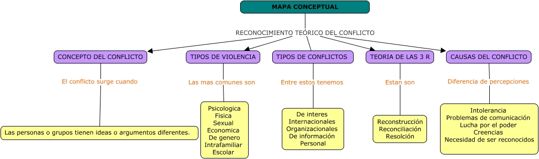 Este Cmap, tiene información relacionada con: MAPA CONCEPTUAL, MAPA CONCEPTUAL RECONOCIMIENTO TEÓRICO DEL CONFLICTO TIPOS DE VIOLENCIA, MAPA CONCEPTUAL RECONOCIMIENTO TEÓRICO DEL CONFLICTO CAUSAS DEL CONFLICTO, MAPA CONCEPTUAL RECONOCIMIENTO TEÓRICO DEL CONFLICTO TEORIA DE LAS 3 R, CONCEPTO DEL CONFLICTO El conflicto surge cuando Las personas o grupos tienen ideas o argumentos diferentes., MAPA CONCEPTUAL RECONOCIMIENTO TEÓRICO DEL CONFLICTO TIPOS DE CONFLICTOS, TEORIA DE LAS 3 R Estan son Reconstrucción Reconciliación Resolción, TIPOS DE VIOLENCIA Las mas comunes son Psicologica Fisica Sexual Economica De genero Intrafamiliar Escolar, TIPOS DE CONFLICTOS Entre estos tenemos De interes Internacionales Organizacionales De información Personal, CAUSAS DEL CONFLICTO Diferencia de percepciones Intolerancia Problemas de comunicación Lucha por el poder Creencias Necesidad de ser reconocidos, MAPA CONCEPTUAL RECONOCIMIENTO TEÓRICO DEL CONFLICTO CONCEPTO DEL CONFLICTO