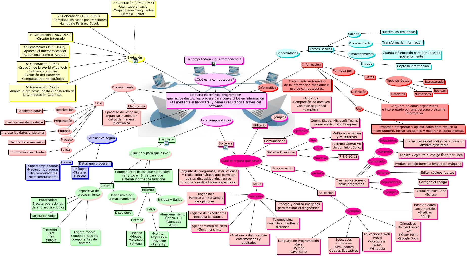 Este Cmap, tiene información relacionada con: Mapa Conceptual Dianeth Cueva 125A-MEDICINA, Información Formada por Datos, 7,8,9,10,11 Windows Sistema Operativo, Sistema Operativo ¿Qué es y para qué sirve? Software, Diagnóstico -Permite el intercambio de opiniones. Funciones Salud, Crear aplicaciones o otros programas permite Programación, -Analizan y diagnostican enfermedades y resultados Funciones Salud, Aplicaciones Web -Prezzi -Wordpress -Wikis -Wikipedia Ejemplos Aplicación, Zoom, Skype, Microsoft Teams correo electrónico, Telegram ejemplos Comunicación, Interno Dispositivo de procesamiento Procesador: Ejecuta operaciones de aritmética y lógica, Tareas Básicas Almacenamiento Guarda información para ser utilizada posteriormente, Corrigen el código Depuradores Crear aplicaciones o otros programas, Hardware ¿Qué es y para qué sirve? Interno, Une las piezas del código para crear un archivo ejecutable Enlazadores Crear aplicaciones o otros programas, Telemedicina -Permite consultas a distancia Funciones Salud, Lenguaje de Programación -Java -Python -Java Script Ejemplos Aplicación, Ciclo Proceso Electrónico o mecánico, Interno Dispositivo de procesamiento Memorias: RAM ROM EPROM, Máquina electrónica programable que recibe daatos, los procesa para convertirlos en información útil mediante el hardware, y genera resultados a través del software. ¿Qué es la computadora? La computadora y sus componentes, Utilitario Ejemplos -Antivirus -Compresión de archivos -Copia de seguridad -Limpieza, Salud ¿Qué es y para qué sirve? Software