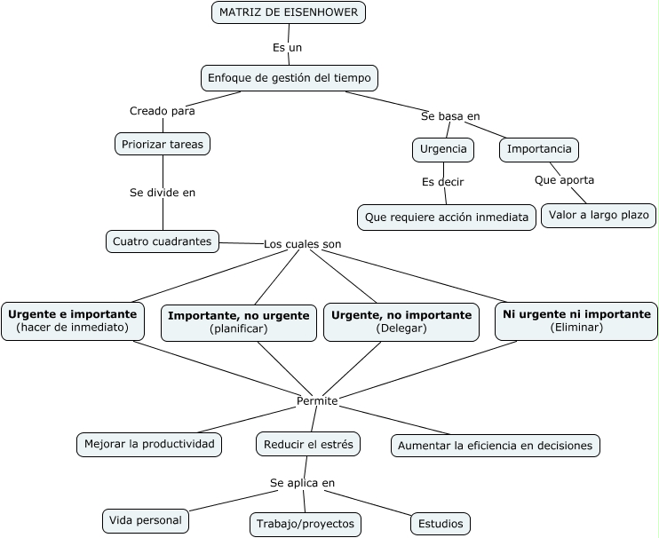 Este Cmap, tiene información relacionada con: Matriz Eisenhower, Enfoque de gestión del tiempo Se basa en Importancia, Cuatro cuadrantes Los cuales son Ni urgente ni importante (Eliminar), Importante, no urgente (planificar) Permite Mejorar la productividad, Reducir el estrés Se aplica en Estudios, Importante, no urgente (planificar) Permite Aumentar la eficiencia en decisiones, Reducir el estrés Se aplica en Trabajo/proyectos, Importancia Que aporta Valor a largo plazo, Ni urgente ni importante (Eliminar) Permite Mejorar la productividad, Urgente, no importante (Delegar) Permite Aumentar la eficiencia en decisiones, Ni urgente ni importante (Eliminar) Permite Reducir el estrés, Urgencia Es decir Que requiere acción inmediata, Reducir el estrés Se aplica en Vida personal, Urgente, no importante (Delegar) Permite Reducir el estrés, Urgente e importante (hacer de inmediato) Permite Aumentar la eficiencia en decisiones, Cuatro cuadrantes Los cuales son Urgente, no importante (Delegar), Enfoque de gestión del tiempo Creado para Priorizar tareas, Cuatro cuadrantes Los cuales son Importante, no urgente (planificar), Cuatro cuadrantes Los cuales son Urgente e importante (hacer de inmediato), Priorizar tareas Se divide en Cuatro cuadrantes, MATRIZ DE EISENHOWER Es un Enfoque de gestión del tiempo