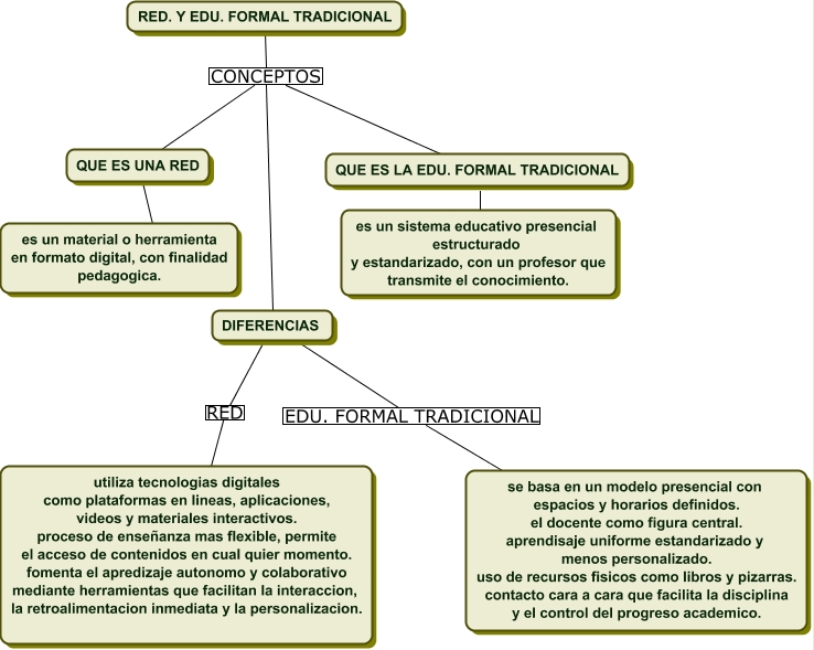 Este Cmap, tiene información relacionada con: mac v1, es un material o herramienta en formato digital, con finalidad pedagogica. ???? QUE ES UNA RED, RED. Y EDU. FORMAL TRADICIONAL CONCEPTOS QUE ES LA EDU. FORMAL TRADICIONAL, DIFERENCIAS RED utiliza tecnologias digitales como plataformas en lineas, aplicaciones, videos y materiales interactivos. proceso de enseñanza mas flexible, permite el acceso de contenidos en cual quier momento. fomenta el apredizaje autonomo y colaborativo mediante herramientas que facilitan la interaccion, la retroalimentacion inmediata y la personalizacion., QUE ES LA EDU. FORMAL TRADICIONAL ???? es un sistema educativo presencial estructurado y estandarizado, con un profesor que transmite el conocimiento., RED. Y EDU. FORMAL TRADICIONAL CONCEPTOS QUE ES UNA RED, RED. Y EDU. FORMAL TRADICIONAL CONCEPTOS DIFERENCIAS, DIFERENCIAS EDU. FORMAL TRADICIONAL se basa en un modelo presencial con espacios y horarios definidos. el docente como figura central. aprendisaje uniforme estandarizado y menos personalizado. uso de recursos fisicos como libros y pizarras. contacto cara a cara que facilita la disciplina y el control del progreso academico.