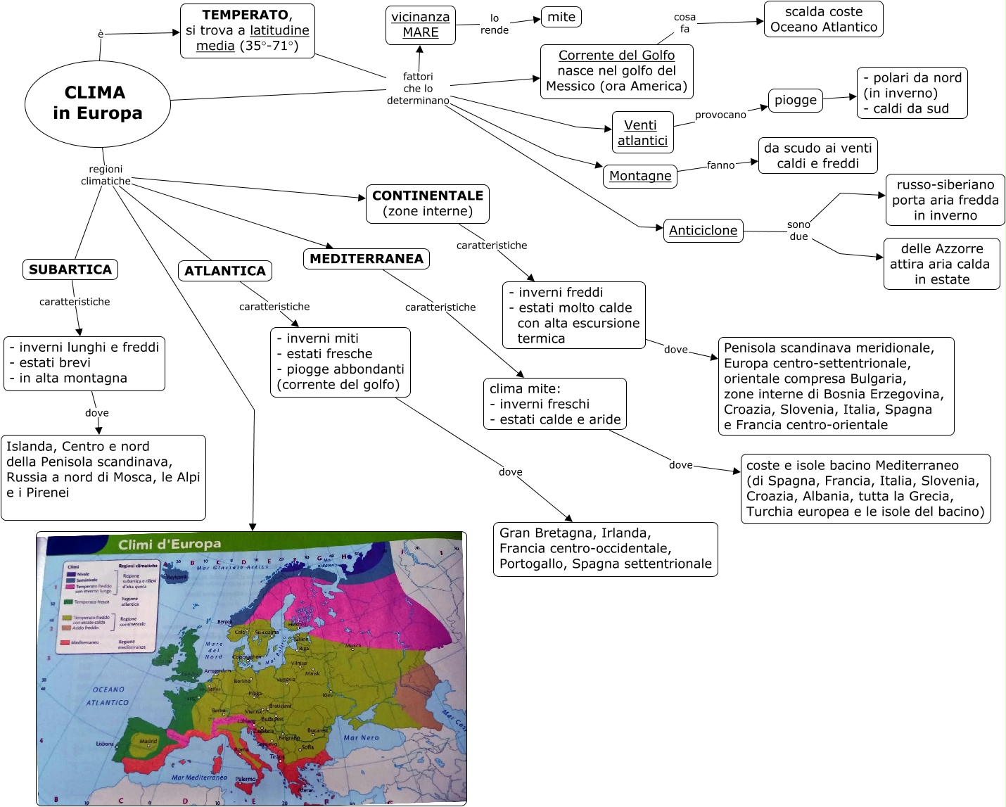Questa Cmap, creata con IHMC CmapTools, contiene informazioni relative a: CLIMA in Europa, CLIMA in Europa regioni climatiche ATLANTICA, CLIMA in Europa regioni climatiche, SUBARTICA caratteristiche - inverni lunghi e freddi - estati brevi - in alta montagna, CLIMA in Europa regioni climatiche SUBARTICA, vicinanza MARE lo rende mite, ATLANTICA caratteristiche - inverni miti - estati fresche - piogge abbondanti (corrente del golfo), Anticiclone sono due russo-siberiano porta aria fredda in inverno, CLIMA in Europa fattori che lo determinano Montagne, CONTINENTALE (zone interne) caratteristiche - inverni freddi - estati molto calde con alta escursione termica, TEMPERATO, si trova a latitudine media (35°-71°) fattori che lo determinano vicinanza MARE, Montagne fanno da scudo ai venti caldi e freddi, piogge ???? - polari da nord (in inverno) - caldi da sud, clima mite: - inverni freschi - estati calde e aride dove coste e isole bacino Mediterraneo (di Spagna, Francia, Italia, Slovenia, Croazia, Albania, tutta la Grecia, Turchia europea e le isole del bacino), - inverni miti - estati fresche - piogge abbondanti (corrente del golfo) dove Gran Bretagna, Irlanda, Francia centro-occidentale, Portogallo, Spagna settentrionale, CLIMA in Europa fattori che lo determinano Corrente del Golfo nasce nel golfo del Messico (ora America), Anticiclone sono due delle Azzorre attira aria calda in estate, Corrente del Golfo nasce nel golfo del Messico (ora America) cosa fa scalda coste Oceano Atlantico, TEMPERATO, si trova a latitudine media (35°-71°) fattori che lo determinano Venti atlantici, CLIMA in Europa regioni climatiche CONTINENTALE (zone interne), CLIMA in Europa è TEMPERATO, si trova a latitudine media (35°-71°)