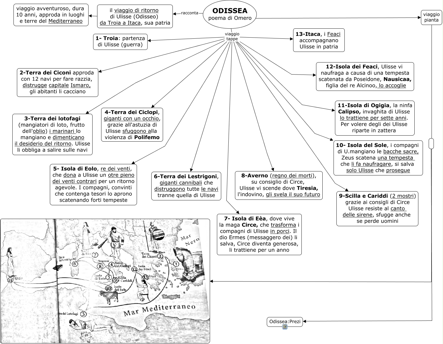 Questa Cmap, creata con IHMC CmapTools, contiene informazioni relative a: ODISSEA_viaggio_sintesi, ODISSEA poema di Omero viaggio tappe 1- Troia: partenza di Ulisse (guerra), ODISSEA poema di Omero viaggio tappe 4-Terra dei Ciclopi, giganti con un occhio, grazie all'astuzia di Ulisse sfuggono alla violenza di Polifemo, Odissea:Prezi, viaggio pianta, ODISSEA poema di Omero viaggio tappe 9-Scilla e Cariddi (2 mostri) grazie ai consigli di Circe Ulisse resiste al canto delle sirene, sfugge anche se perde uomini, ODISSEA poema di Omero viaggio tappe 3-Terra dei lotofagi (mangiatori di loto, frutto dell'oblio) i marinari lo mangiano e dimenticano il desiderio del ritorno. Ulisse li obbliga a salire sulle navi, ODISSEA poema di Omero racconta il viaggio di ritorno di Ulisse (Odisseo) da Troia a Itaca, sua patria, ODISSEA poema di Omero viaggio tappe 6-Terra dei Lestrigoni, giganti cannibali che distruggono tutte le navi tranne quella di Ulisse, ODISSEA poema di Omero viaggio tappe 11-Isola di Ogigia, la ninfa Calipso, invaghita di Ulisse lo trattiene per sette anni. Per volere degli dei Ulisse riparte in zattera, ODISSEA poema di Omero viaggio tappe 2-Terra dei Ciconi approda con 12 navi per fare razzia, distrugge capitale Ismaro, gli abitanti li cacciano, ODISSEA poema di Omero viaggio tappe 10- Isola del Sole, i compagni di U.mangiano le bacche sacre, Zeus scatena una tempesta che li fa naufragare, si salva solo Ulisse che prosegue, ODISSEA poema di Omero viaggio tappe 12-Isola dei Feaci, Ulisse vi naufraga a causa di una tempesta scatenata da Poseidone, Nausicaa, figlia del re Alcinoo, lo accoglie, ODISSEA poema di Omero viaggio tappe 13-Itaca, i Feaci accompagnano Ulisse in patria, ODISSEA poema di Omero viaggio tappe 8-Averno (regno dei morti), su consiglio di Circe, Ulisse vi scende dove Tiresia, l'indovino, gli svela il suo futuro, ODISSEA poema di Omero ???? viaggio pianta, il viaggio di ritorno di Ulisse (Odisseo) da Troia a Itaca, sua patria ???? viaggio avventuroso, dura 10 anni, approda in luoghi e terre del Mediterraneo, ODISSEA poema di Omero viaggio tappe 5- Isola di Eolo, re dei venti, che dona a Ulisse un otre pieno dei venti contrari per un ritorno agevole. I compagni, convinti che contenga tesori lo aprono scatenando forti tempeste, ODISSEA poema di Omero viaggio tappe 7- Isola di Eèa, dove vive la maga Circe, che trasforma i compagni di Ulisse in porci. Il dio Ermes (messaggero dei) li salva, Circe diventa generosa, li trattiene per un anno