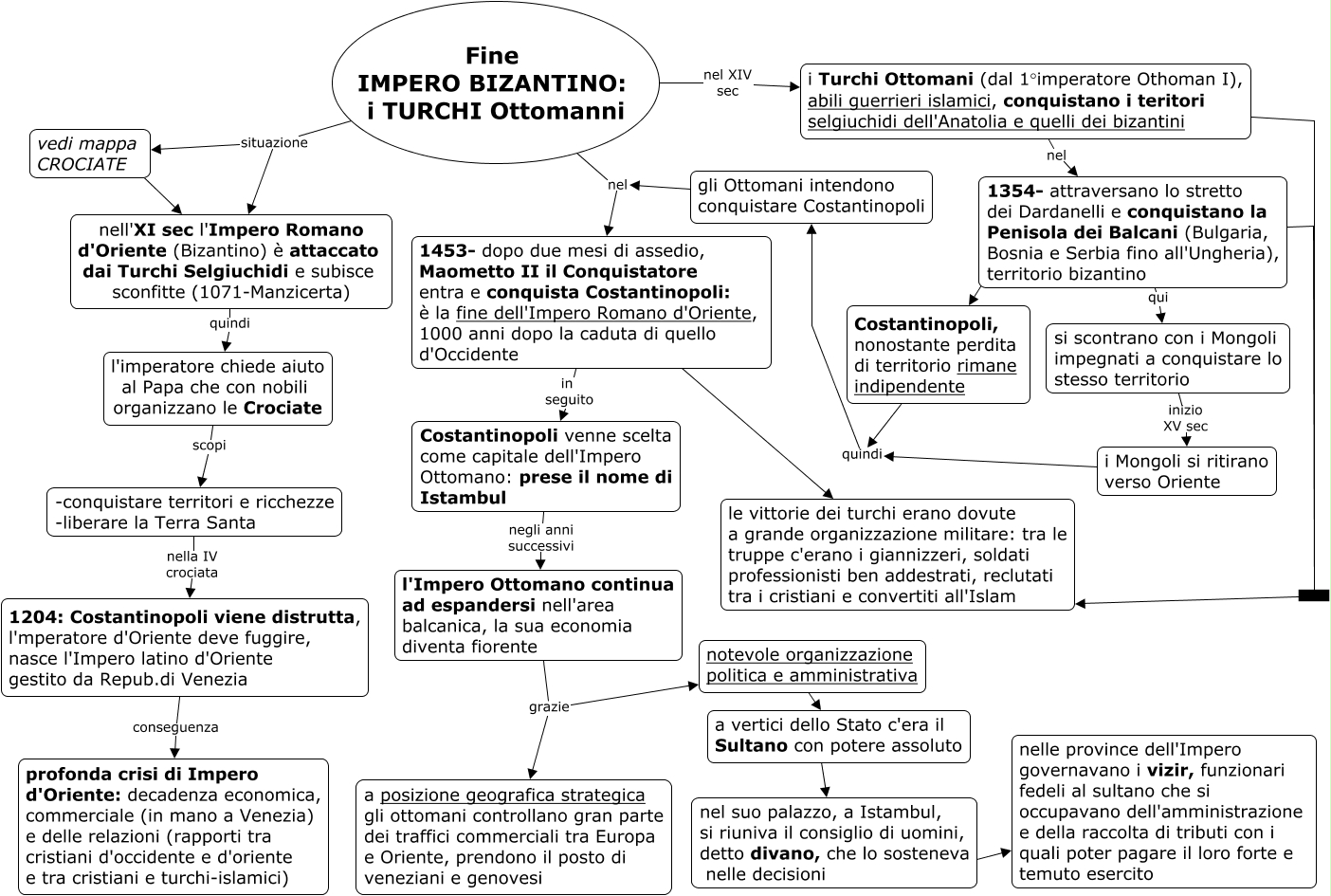 Questa Cmap, creata con IHMC CmapTools, contiene informazioni relative a: fine IMP_Bizantino_Ottomani, 1354- attraversano lo stretto dei Dardanelli e conquistano la Penisola dei Balcani (Bulgaria, Bosnia e Serbia fino all'Ungheria), territorio bizantino ???? Costantinopoli, nonostante perdita di territorio rimane indipendente, Fine IMPERO BIZANTINO: i TURCHI Ottomanni nel XIV sec i Turchi Ottomani (dal 1°imperatore Othoman I), abili guerrieri islamici, conquistano i teritori selgiuchidi dell'Anatolia e quelli dei bizantini, l'Impero Ottomano continua ad espandersi nell'area balcanica, la sua economia diventa fiorente grazie notevole organizzazione politica e amministrativa, i Turchi Ottomani (dal 1°imperatore Othoman I), abili guerrieri islamici, conquistano i teritori selgiuchidi dell'Anatolia e quelli dei bizantini nel 1354- attraversano lo stretto dei Dardanelli e conquistano la Penisola dei Balcani (Bulgaria, Bosnia e Serbia fino all'Ungheria), territorio bizantino, nell'XI sec l'Impero Romano d'Oriente (Bizantino) è attaccato dai Turchi Selgiuchidi e subisce sconfitte (1071-Manzicerta) quindi l'imperatore chiede aiuto al Papa che con nobili organizzano le Crociate, 1354- attraversano lo stretto dei Dardanelli e conquistano la Penisola dei Balcani (Bulgaria, Bosnia e Serbia fino all'Ungheria), territorio bizantino qui si scontrano con i Mongoli impegnati a conquistare lo stesso territorio, a vertici dello Stato c'era il Sultano con potere assoluto ???? nel suo palazzo, a Istambul, si riuniva il consiglio di uomini, detto divano, che lo sosteneva nelle decisioni, nel suo palazzo, a Istambul, si riuniva il consiglio di uomini, detto divano, che lo sosteneva nelle decisioni ???? nelle province dell'Impero governavano i vizir, funzionari fedeli al sultano che si occupavano dell'amministrazione e della raccolta di tributi con i quali poter pagare il loro forte e temuto esercito, 1354- attraversano lo stretto dei Dardanelli e conquistano la Penisola dei Balcani (Bulgaria, Bosnia e Serbia fino all'Ungheria), territorio bizantino ???? le vittorie dei turchi erano dovute a grande organizzazione militare: tra le truppe c'erano i giannizzeri, soldati professionisti ben addestrati, reclutati tra i cristiani e convertiti all'Islam, Fine IMPERO BIZANTINO: i TURCHI Ottomanni situazione vedi mappa CROCIATE, Fine IMPERO BIZANTINO: i TURCHI Ottomanni nel 1453- dopo due mesi di assedio, Maometto II il Conquistatore entra e conquista Costantinopoli: è la fine dell'Impero Romano d'Oriente, 1000 anni dopo la caduta di quello d'Occidente, l'imperatore chiede aiuto al Papa che con nobili organizzano le Crociate scopi -conquistare territori e ricchezze -liberare la Terra Santa, 1453- dopo due mesi di assedio, Maometto II il Conquistatore entra e conquista Costantinopoli: è la fine dell'Impero Romano d'Oriente, 1000 anni dopo la caduta di quello d'Occidente in seguito Costantinopoli venne scelta come capitale dell'Impero Ottomano: prese il nome di Istambul, Costantinopoli venne scelta come capitale dell'Impero Ottomano: prese il nome di Istambul negli anni successivi l'Impero Ottomano continua ad espandersi nell'area balcanica, la sua economia diventa fiorente, 1453- dopo due mesi di assedio, Maometto II il Conquistatore entra e conquista Costantinopoli: è la fine dell'Impero Romano d'Oriente, 1000 anni dopo la caduta di quello d'Occidente ??? le vittorie dei turchi erano dovute a grande organizzazione militare: tra le truppe c'erano i giannizzeri, soldati professionisti ben addestrati, reclutati tra i cristiani e convertiti all'Islam, i Turchi Ottomani (dal 1°imperatore Othoman I), abili guerrieri islamici, conquistano i teritori selgiuchidi dell'Anatolia e quelli dei bizantini ???? le vittorie dei turchi erano dovute a grande organizzazione militare: tra le truppe c'erano i giannizzeri, soldati professionisti ben addestrati, reclutati tra i cristiani e convertiti all'Islam, Fine IMPERO BIZANTINO: i TURCHI Ottomanni situazione nell'XI sec l'Impero Romano d'Oriente (Bizantino) è attaccato dai Turchi Selgiuchidi e subisce sconfitte (1071-Manzicerta), gli Ottomani intendono conquistare Costantinopoli nel 1453- dopo due mesi di assedio, Maometto II il Conquistatore entra e conquista Costantinopoli: è la fine dell'Impero Romano d'Oriente, 1000 anni dopo la caduta di quello d'Occidente, notevole organizzazione politica e amministrativa ???? a vertici dello Stato c'era il Sultano con potere assoluto, si scontrano con i Mongoli impegnati a conquistare lo stesso territorio inizio XV sec i Mongoli si ritirano verso Oriente