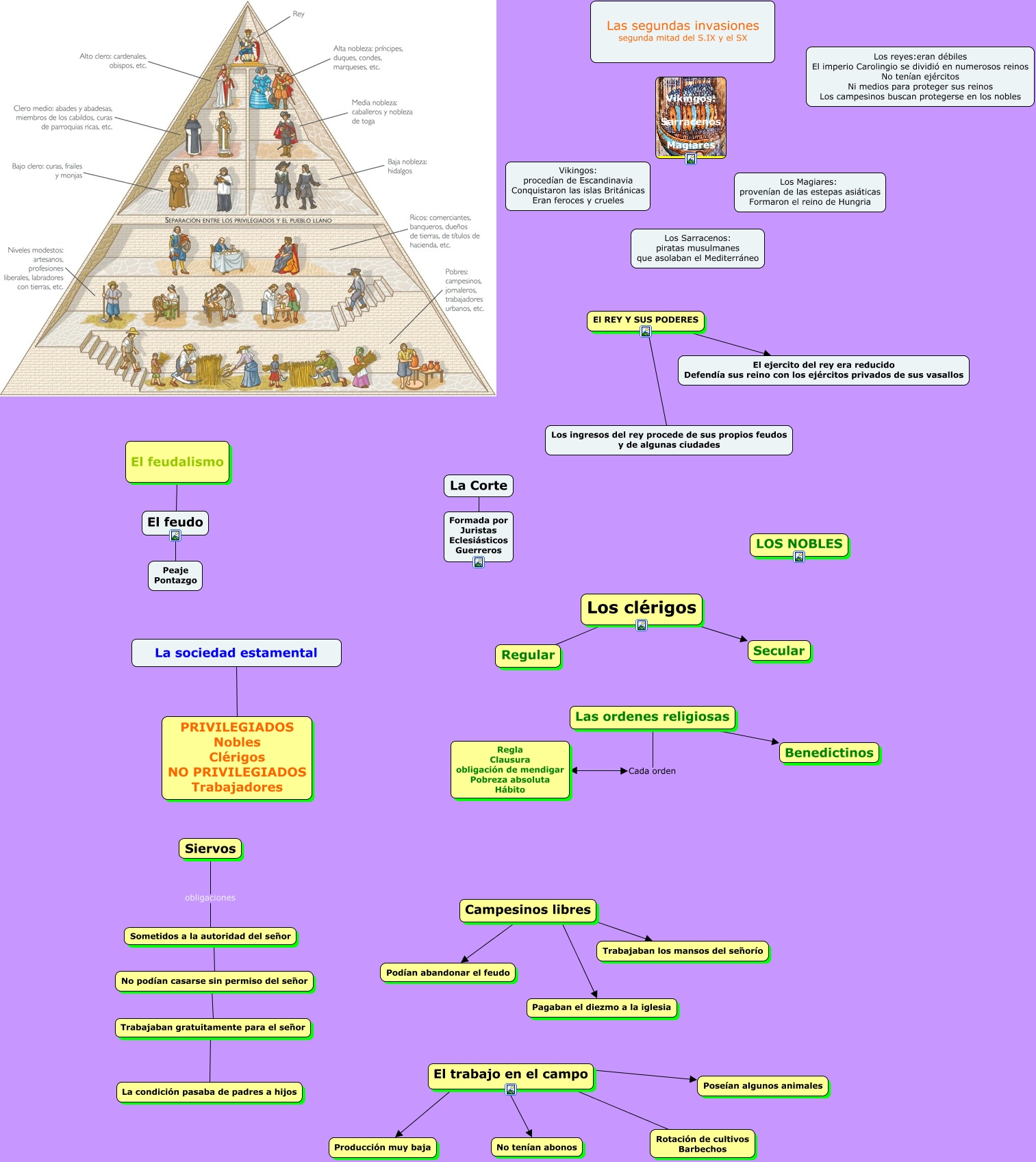 Este Cmap, tiene información relacionada con: La sociedad feudal.cmap, El trabajo en el campo ???? Producción muy baja, Trabajaban gratuitamente para el señor ???? La condición pasaba de padres a hijos, Siervos obligaciones Sometidos a la autoridad del señor, Los clérigos Secular, Las ordenes religiosas Benedictinos, Los clérigos Regular, El trabajo en el campo ???? Rotación de cultivos Barbechos, La sociedad estamental PRIVILEGIADOS Nobles Clérigos NO PRIVILEGIADOS Trabajadores, Campesinos libres ???? Podían abandonar el feudo, Sometidos a la autoridad del señor ???? No podían casarse sin permiso del señor, Campesinos libres ???? Trabajaban los mansos del señorío, El trabajo en el campo ???? No tenían abonos, Las ordenes religiosas Cada orden Regla Clausura obligación de mendigar Pobreza absoluta Hábito, El REY Y SUS PODERES El ejercito del rey era reducido Defendía sus reino con los ejércitos privados de sus vasallos, No podían casarse sin permiso del señor ???? Trabajaban gratuitamente para el señor, El feudalismo El feudo, El feudo Peaje Pontazgo, La Corte Formada por Juristas Eclesiásticos Guerreros, El REY Y SUS PODERES Los ingresos del rey procede de sus propios feudos y de algunas ciudades, El trabajo en el campo ???? Poseían algunos animales