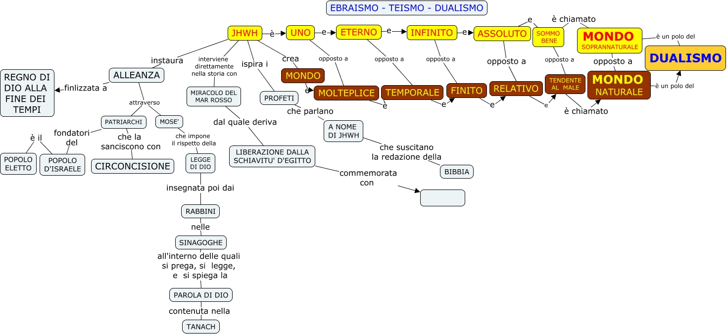 Questa Cmap, creata con IHMC CmapTools, contiene informazioni relative a: EBRAISMO - TEISMO - DUALISMO NUOVO, SINAGOGHE all'interno delle quali si prega, si legge, e si spiega la PAROLA DI DIO, A NOME DI JHWH che suscitano la redazione della BIBBIA, MOSE' che impone il rispetto della LEGGE DI DIO, JHWH ispira i PROFETI, TENDENTE AL MALE è chiamato MONDO NATURALE, INFINITO e ASSOLUTO, ASSOLUTO e SOMMO BENE, FINITO e RELATIVO, UNO opposto a MOLTEPLICE, PROFETI che parlano A NOME DI JHWH, SOMMO BENE è chiamato MONDO SOPRANNATURALE, JHWH è UNO, LIBERAZIONE DALLA SCHIAVITU' D'EGITTO commemorata con, PATRIARCHI che la sanciscono con CIRCONCISIONE, INFINITO opposto a FINITO, MONDO NATURALE è un polo del DUALISMO, MOLTEPLICE è TEMPORALE, MONDO SOPRANNATURALE è un polo del DUALISMO, MONDO SOPRANNATURALE opposto a MONDO NATURALE, PATRIARCHI fondatori del POPOLO D'ISRAELE