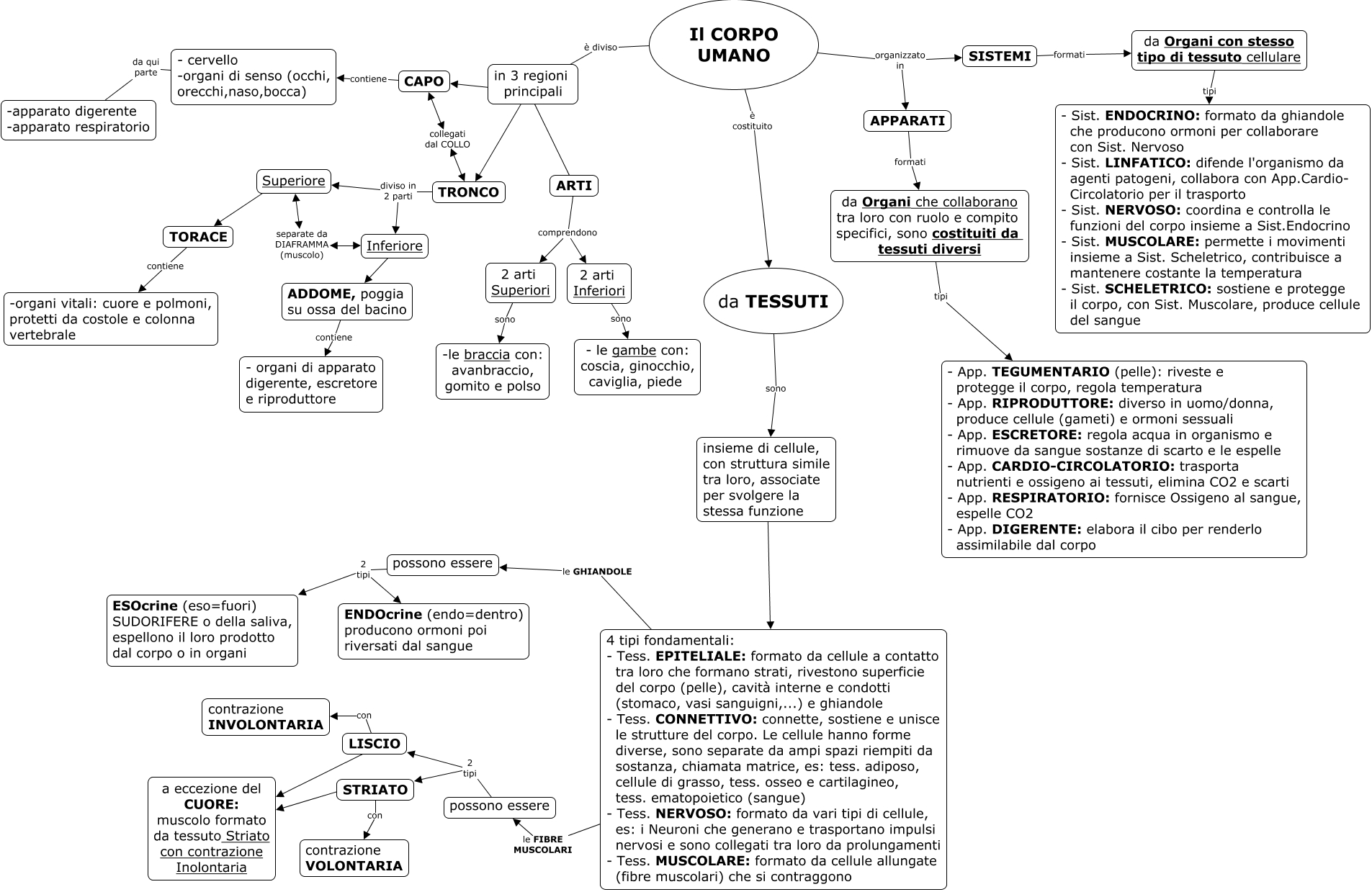 Questa Cmap, creata con IHMC CmapTools, contiene informazioni relative a: Il Corpo Umano, LISCIO con contrazione INVOLONTARIA, 2 arti Inferiori sono - le gambe con: coscia, ginocchio, caviglia, piede, SISTEMI formati da Organi con stesso tipo di tessuto cellulare, ADDOME, poggia su ossa del bacino contiene - organi di apparato digerente, escretore e riproduttore, Il CORPO UMANO è costituito da TESSUTI, TRONCO diviso in 2 parti Superiore, Superiore ???? TORACE, CAPO collegati dal COLLO TRONCO, LISCIO ???? a eccezione del CUORE: muscolo formato da tessuto Striato con contrazione Inolontaria, possono essere 2 tipi STRIATO, insieme di cellule, con struttura simile tra loro, associate per svolgere la stessa funzione ???? 4 tipi fondamentali: - Tess. EPITELIALE: formato da cellule a contatto tra loro che formano strati, rivestono superficie del corpo (pelle), cavità interne e condotti (stomaco, vasi sanguigni,...) e ghiandole - Tess. CONNETTIVO: connette, sostiene e unisce le strutture del corpo. Le cellule hanno forme diverse, sono separate da ampi spazi riempiti da sostanza, chiamata matrice, es: tess. adiposo, cellule di grasso, tess. osseo e cartilagineo, tess. ematopoietico (sangue) - Tess. NERVOSO: formato da vari tipi di cellule, es: i Neuroni che generano e trasportano impulsi nervosi e sono collegati tra loro da prolungamenti - Tess. MUSCOLARE: formato da cellule allungate (fibre muscolari) che si contraggono, 2 arti Superiori sono -le braccia con: avanbraccio, gomito e polso, Inferiore ???? ADDOME, poggia su ossa del bacino, TORACE contiene -organi vitali: cuore e polmoni, protetti da costole e colonna vertebrale, Il CORPO UMANO organizzato in APPARATI, possono essere 2 tipi ENDOcrine (endo=dentro) producono ormoni poi riversati dal sangue, TRONCO diviso in 2 parti Inferiore, in 3 regioni principali ???? CAPO, - cervello -organi di senso (occhi, orecchi,naso,bocca) da qui parte -apparato digerente -apparato respiratorio, ARTI comprendono 2 arti Superiori