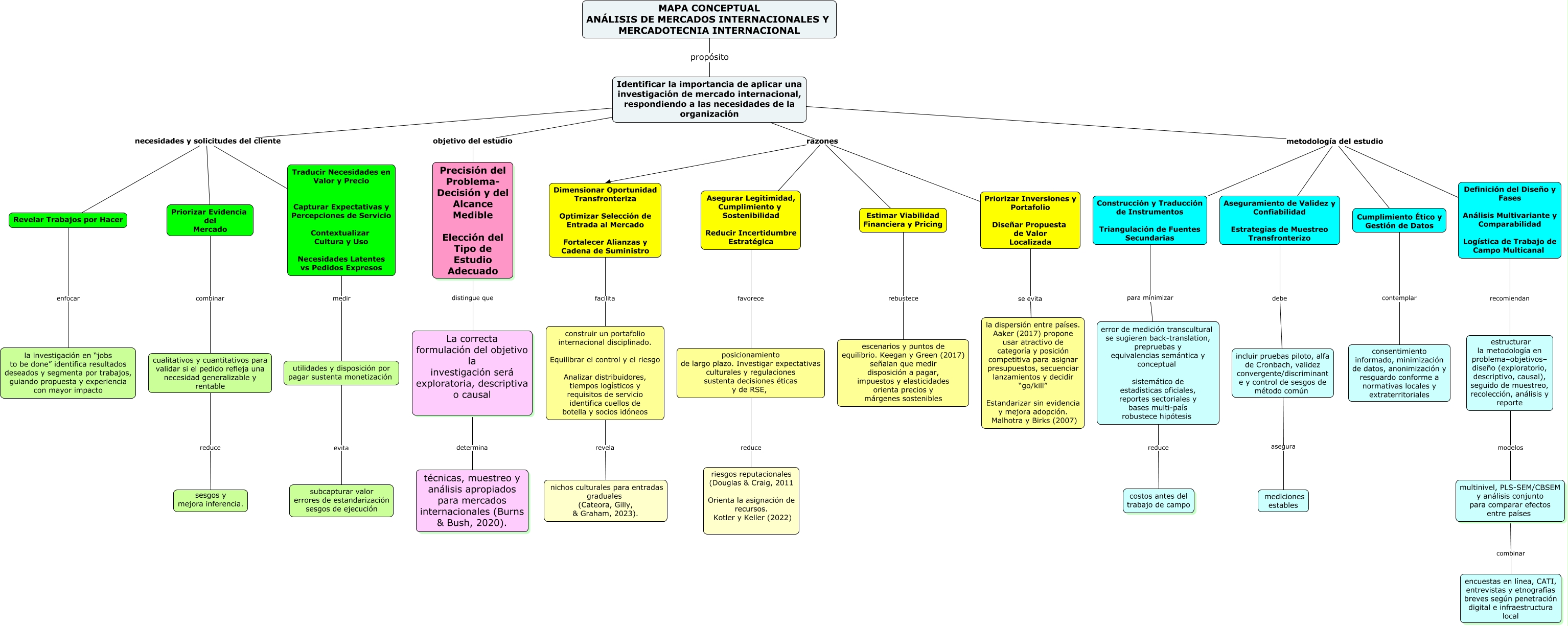 Este Cmap, tiene información relacionada con: MAPA CONCEPTUAL, Priorizar Inversiones y Portafolio Diseñar Propuesta de Valor Localizada se evita la dispersión entre países. Aaker (2017) propone usar atractivo de categoría y posición competitiva para asignar presupuestos, secuenciar lanzamientos y decidir “go/kill” Estandarizar sin evidencia y mejora adopción. Malhotra y Birks (2007), Identificar la importancia de aplicar una investigación de mercado internacional, respondiendo a las necesidades de la organización razones Dimensionar Oportunidad Transfronteriza Optimizar Selección de Entrada al Mercado Fortalecer Alianzas y Cadena de Suministro, Revelar Trabajos por Hacer enfocar la investigación en “jobs to be done” identifica resultados deseados y segmenta por trabajos, guiando propuesta y experiencia con mayor impacto, Definición del Diseño y Fases Análisis Multivariante y Comparabilidad Logística de Trabajo de Campo Multicanal recomiendan estructurar la metodología en problema–objetivos– diseño (exploratorio, descriptivo, causal), seguido de muestreo, recolección, análisis y reporte, Estimar Viabilidad Financiera y Pricing rebustece escenarios y puntos de equilibrio. Keegan y Green (2017) señalan que medir disposición a pagar, impuestos y elasticidades orienta precios y márgenes sostenibles, construir un portafolio internacional disciplinado. Equilibrar el control y el riesgo Analizar distribuidores, tiempos logísticos y requisitos de servicio identifica cuellos de botella y socios idóneos revela nichos culturales para entradas graduales (Cateora, Gilly, & Graham, 2023)., Identificar la importancia de aplicar una investigación de mercado internacional, respondiendo a las necesidades de la organización razones Estimar Viabilidad Financiera y Pricing, Identificar la importancia de aplicar una investigación de mercado internacional, respondiendo a las necesidades de la organización metodología del estudio Construcción y Traducción de Instrumentos Triangulación de Fuentes Secundarias, Identificar la importancia de aplicar una investigación de mercado internacional, respondiendo a las necesidades de la organización razones Asegurar Legitimidad, Cumplimiento y Sostenibilidad Reducir Incertidumbre Estratégica, Asegurar Legitimidad, Cumplimiento y Sostenibilidad Reducir Incertidumbre Estratégica favorece posicionamiento de largo plazo. Investigar expectativas culturales y regulaciones sustenta decisiones éticas y de RSE,, Precisión del Problema- Decisión y del Alcance Medible Elección del Tipo de Estudio Adecuado distingue que La correcta formulación del objetivo la investigación será exploratoria, descriptiva o causal, multinivel, PLS-SEM/CBSEM y análisis conjunto para comparar efectos entre países combinar encuestas en línea, CATI, entrevistas y etnografías breves según penetración digital e infraestructura local, utilidades y disposición por pagar sustenta monetización evita subcapturar valor errores de estandarización sesgos de ejecución, MAPA CONCEPTUAL ANÁLISIS DE MERCADOS INTERNACIONALES Y MERCADOTECNIA INTERNACIONAL propósito Identificar la importancia de aplicar una investigación de mercado internacional, respondiendo a las necesidades de la organización, Identificar la importancia de aplicar una investigación de mercado internacional, respondiendo a las necesidades de la organización necesidades y solicitudes del cliente Revelar Trabajos por Hacer, Traducir Necesidades en Valor y Precio Capturar Expectativas y Percepciones de Servicio Contextualizar Cultura y Uso Necesidades Latentes vs Pedidos Expresos medir utilidades y disposición por pagar sustenta monetización, Identificar la importancia de aplicar una investigación de mercado internacional, respondiendo a las necesidades de la organización metodología del estudio Aseguramiento de Validez y Confiabilidad Estrategias de Muestreo Transfronterizo, Identificar la importancia de aplicar una investigación de mercado internacional, respondiendo a las necesidades de la organización necesidades y solicitudes del cliente Traducir Necesidades en Valor y Precio Capturar Expectativas y Percepciones de Servicio Contextualizar Cultura y Uso Necesidades Latentes vs Pedidos Expresos, error de medición transcultural se sugieren back-translation, prepruebas y equivalencias semántica y conceptual sistemático de estadísticas oficiales, reportes sectoriales y bases multi-país robustece hipótesis reduce costos antes del trabajo de campo, Identificar la importancia de aplicar una investigación de mercado internacional, respondiendo a las necesidades de la organización metodología del estudio Cumplimiento Ético y Gestión de Datos