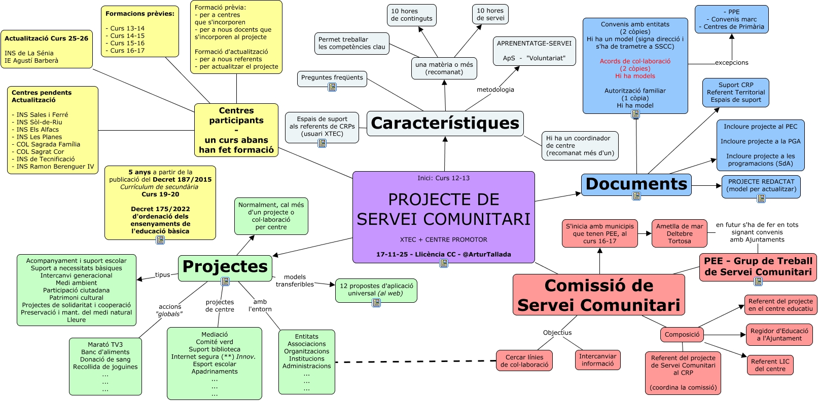 Aquest mapa conceptual conté informació relacionada amb: Servei Comunitari - 2025, Comissió de Servei Comunitari Objectius Cercar línies de col·laboració, Inici: Curs 12-13 PROJECTE DE SERVEI COMUNITARI XTEC + CENTRE PROMOTOR 17-11-25 - Llicència CC - @ArturTallada Documents, Composició Referent del projecte en el centre educatiu, Convenis amb entitats (2 còpies) Hi ha un model (signa direcció i s'ha de trametre a SSCC) Acords de col·laboració (2 còpies) Hi ha models Autorització familiar (1 còpia) Hi ha model excepcions - PPE - Convenis marc - Centres de Primària, una matèria o més (recomanat) Permet treballar les competències clau, Inici: Curs 12-13 PROJECTE DE SERVEI COMUNITARI XTEC + CENTRE PROMOTOR 17-11-25 - Llicència CC - @ArturTallada Comissió de Servei Comunitari, Documents Suport CRP Referent Territorial Espais de suport, Composició Referent del projecte de Servei Comunitari al CRP (coordina la comissió), Característiques metodologia APRENENTATGE-SERVEI ApS - "Voluntariat", Ametlla de mar Deltebre Tortosa en futur s'ha de fer en tots signant convenis amb Ajuntaments PEE - Grup de Treball de Servei Comunitari, Centres participants - un curs abans han fet formació Actualització Curs 25-26 INS de La Sénia IE Agustí Barberà, Característiques ???? Espais de suport als referents de CRPs (usuari XTEC), Composició Referent LIC del centre, Característiques Hi ha un coordinador de centre (recomanat més d'un), S'inicia amb municipis que tenen PEE, al curs 16-17 Ametlla de mar Deltebre Tortosa, Característiques una matèria o més (recomanat), Documents Incloure projecte al PEC Incloure projecte a la PGA Incloure projecte a les programacions (SdA), Centres participants - un curs abans han fet formació Centres pendents Actualització - INS Sales i Ferré - INS Sòl-de-Riu - INS Els Alfacs - INS Les Planes - COL Sagrada Família - COL Sagrat Cor - INS de Tecnificació - INS Ramon Berenguer IV, Comissió de Servei Comunitari Objectius Intercanviar informació, Inici: Curs 12-13 PROJECTE DE SERVEI COMUNITARI XTEC + CENTRE PROMOTOR 17-11-25 - Llicència CC - @ArturTallada Centres participants - un curs abans han fet formació