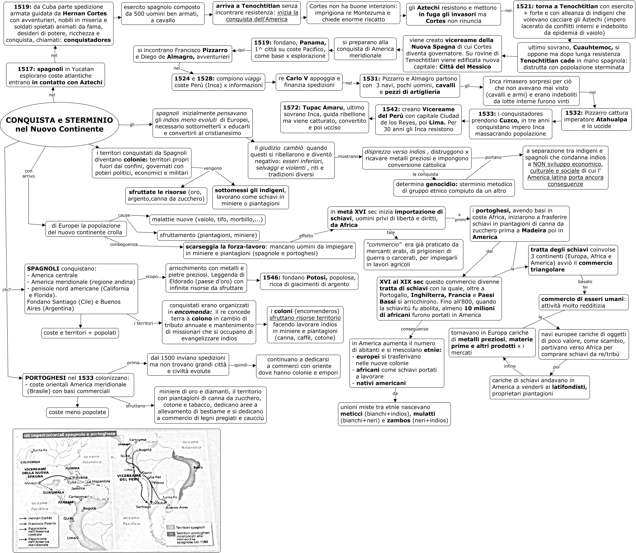 Questa Cmap, creata con IHMC CmapTools, contiene informazioni relative a: Conquista e sterminio_Nuovo Continente_ok, viene creato vicereame della Nuova Spagna di cui Cortes diventa governatore. Su rovine di Tenochtitlan viene edificata nuova capitale: Città del Messico ???? si preparano alla conquista di America meridionale, i territori conquistati da Spagnoli diventano colonie: territori propri fuori dai confini, governati con poteri politici, economici e militari vengono sottomessi gli indigeni, lavorano come schiavi in miniere o piantagioni, scarseggia la forza-lavoro: mancano uomini da impiegare in miniere e piantagioni (spagnole e portoghesi) effetto in metà XVI sec inizia importazione di schiavi, uomini privi di libertà e diritti, da Africa, CONQUISTA e STERMINIO nel Nuovo Continente ??? i territori conquistati da Spagnoli diventano colonie: territori propri fuori dai confini, governati con poteri politici, economici e militari, CONQUISTA e STERMINIO nel Nuovo Continente chi? SPAGNOLI conquistano: - America centrale - America meridionale (regione andina) - penisole nord americane (California e Florida). Fondano Santiago (Cile) e Buenos Aires (Argentina), spagnoli inizialmente pensavano gli indios meno evoluti di Europei, necessario sottometterli x educarli e convertirli al cristianesimo ???? il giudizio cambiò quando questi si ribellarono e diventò negativo: esseri inferiori, selvaggi e violenti, riti e tradizioni diversi, SPAGNOLI conquistano: - America centrale - America meridionale (regione andina) - penisole nord americane (California e Florida). Fondano Santiago (Cile) e Buenos Aires (Argentina) scopo arricchimento con metalli e pietre preziosi. Leggenda di Eldorado (paese d'oro) con infinite risorse da sfruttare, 1519: fondano, Panama, 1^ città su coste Pacifico, come base x esplorazione qui si incontrano Francisco Pizzarro e Diego de Almagro, avventurieri, di Europei la popolazione del nuovo continente crolla cause malattie nuove (vaiolo, tifo, morbillo,...), ultimo sovrano, Cuauhtemoc, si oppone ma dopo lunga resistenza Tenochtitlan cade in mano spagnola: distrutta con popolazione sterminata ???? viene creato vicereame della Nuova Spagna di cui Cortes diventa governatore. Su rovine di Tenochtitlan viene edificata nuova capitale: Città del Messico, cariche di schiavi andavano in America a venderli ai latifondisti, proprietari piantagioni infine tornavano in Europa cariche di metalli preziosi, materie prime e altri prodotti x i mercati, 1521: torna a Tenochtitlan con esercito + forte e con alleanza di indigeni che volevano cacciare gli Aztechi (impero lacerato da conflitti interni e indebolito da epidemia di vaiolo) ???? ultimo sovrano, Cuauhtemoc, si oppone ma dopo lunga resistenza Tenochtitlan cade in mano spagnola: distrutta con popolazione sterminata, il giudizio cambiò quando questi si ribellarono e diventò negativo: esseri inferiori, selvaggi e violenti, riti e tradizioni diversi mostrano disprezzo verso indios, distruggono x ricavare metalli preziosi e impongono conversione cattolica, di Europei la popolazione del nuovo continente crolla conseguenza scarseggia la forza-lavoro: mancano uomini da impiegare in miniere e piantagioni (spagnole e portoghesi), determina genocidio: sterminio metodico di gruppo etnico compiuto da un altro portano a separazione tra indigeni e spagnoli che condanna indios a NON sviluppo economico, culturale e sociale di cui l' America latina porta ancora conseguenze, arricchimento con metalli e pietre preziosi. Leggenda di Eldorado (paese d'oro) con infinite risorse da sfruttare ???? 1546: fondano Potosi, popolosa, ricca di giacimenti di argento, XVI al XIX sec questo commercio divenne tratta di schiavi con la quale, oltre a Portogallo, Inghilterra, Francia e Paesi Bassi si arricchirono. Fino all'800, quando la schiavitù fu abolita, almeno 10 milioni di africani furono portati in America la tratta degli schiavi coinvolse 3 continenti (Europa, Africa e America) avviò il commercio triangolare, disprezzo verso indios, distruggono x ricavare metalli preziosi e impongono conversione cattolica portano a separazione tra indigeni e spagnoli che condanna indios a NON sviluppo economico, culturale e sociale di cui l' America latina porta ancora conseguenze, si preparano alla conquista di America meridionale ???? 1519: fondano, Panama, 1^ città su coste Pacifico, come base x esplorazione, CONQUISTA e STERMINIO nel Nuovo Continente nel 1517: spagnoli in Yucatan esplorano coste atlantiche entrano in contatto con Aztechi