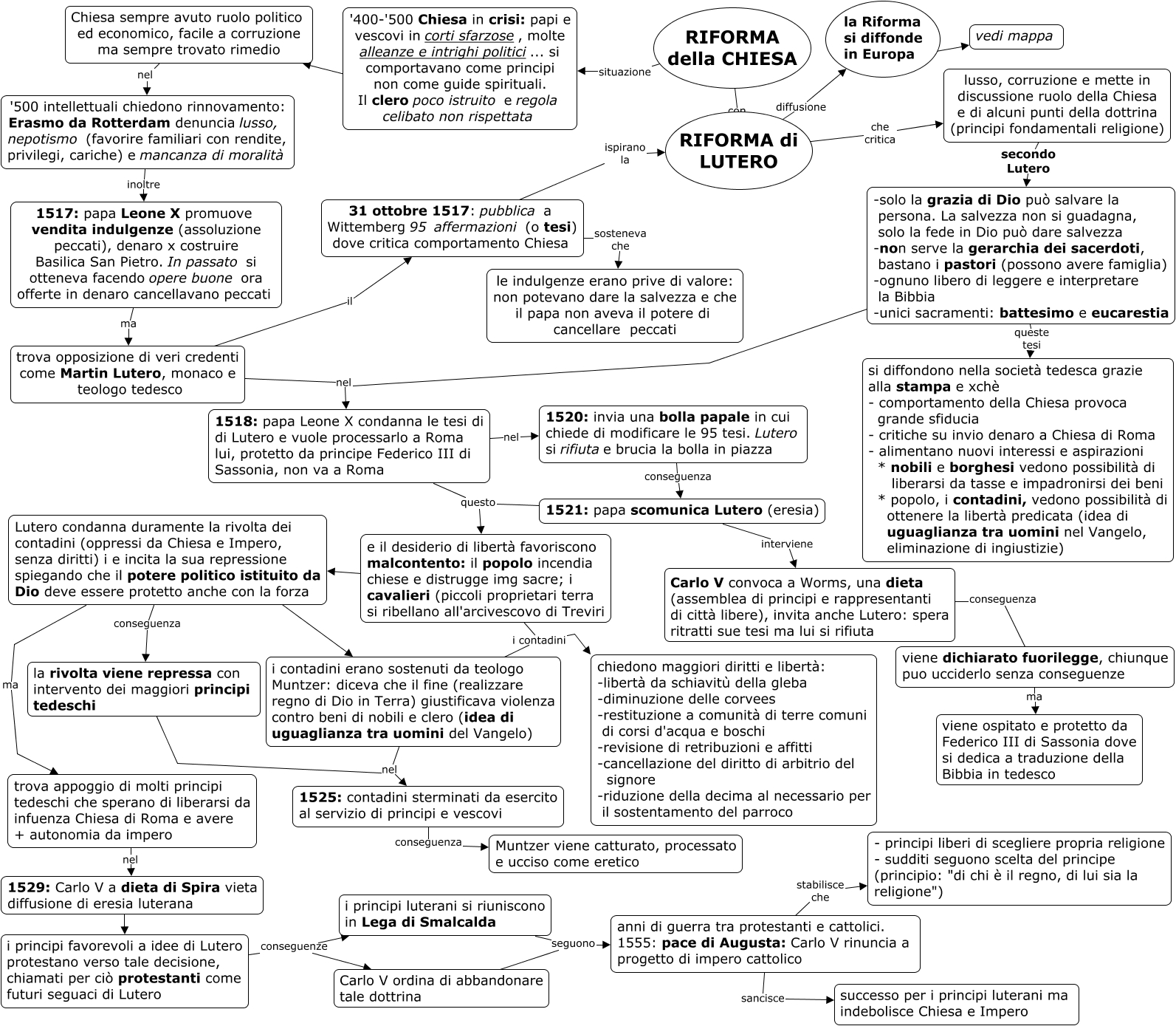 Questa Cmap, creata con IHMC CmapTools, contiene informazioni relative a: RiformaChiesa_Lutero, trova opposizione di veri credenti come Martin Lutero, monaco e teologo tedesco nel 1518: papa Leone X condanna le tesi di di Lutero e vuole processarlo a Roma lui, protetto da principe Federico III di Sassonia, non va a Roma, la rivolta viene repressa con intervento dei maggiori principi tedeschi nel 1525: contadini sterminati da esercito al servizio di principi e vescovi, RIFORMA della CHIESA con RIFORMA di LUTERO, e il desiderio di libertà favoriscono malcontento: il popolo incendia chiese e distrugge img sacre; i cavalieri (piccoli proprietari terra si ribellano all'arcivescovo di Treviri i contadini chiedono maggiori diritti e libertà: -libertà da schiavitù della gleba -diminuzione delle corvees -restituzione a comunità di terre comuni di corsi d'acqua e boschi -revisione di retribuzioni e affitti -cancellazione del diritto di arbitrio del signore -riduzione della decima al necessario per il sostentamento del parroco, i principi favorevoli a idee di Lutero protestano verso tale decisione, chiamati per ciò protestanti come futuri seguaci di Lutero conseguenze Carlo V ordina di abbandonare tale dottrina, Lutero condanna duramente la rivolta dei contadini (oppressi da Chiesa e Impero, senza diritti) i e incita la sua repressione spiegando che il potere politico istituito da Dio deve essere protetto anche con la forza ma trova appoggio di molti principi tedeschi che sperano di liberarsi da infuenza Chiesa di Roma e avere + autonomia da impero, i principi luterani si riuniscono in Lega di Smalcalda seguono anni di guerra tra protestanti e cattolici. 1555: pace di Augusta: Carlo V rinuncia a progetto di impero cattolico, RIFORMA di LUTERO che critica lusso, corruzione e mette in discussione ruolo della Chiesa e di alcuni punti della dottrina (principi fondamentali religione), trova opposizione di veri credenti come Martin Lutero, monaco e teologo tedesco il 31 ottobre 1517: pubblica a Wittemberg 95 affermazioni (o tesi) dove critica comportamento Chiesa, Chiesa sempre avuto ruolo politico ed economico, facile a corruzione ma sempre trovato rimedio nel '500 intellettuali chiedono rinnovamento: Erasmo da Rotterdam denuncia lusso, nepotismo (favorire familiari con rendite, privilegi, cariche) e mancanza di moralità, 1529: Carlo V a dieta di Spira vieta diffusione di eresia luterana ???? i principi favorevoli a idee di Lutero protestano verso tale decisione, chiamati per ciò protestanti come futuri seguaci di Lutero, RIFORMA della CHIESA situazione '400-'500 Chiesa in crisi: papi e vescovi in corti sfarzose, molte alleanze e intrighi politici... si comportavano come principi non come guide spirituali. Il clero poco istruito e regola celibato non rispettata, 1525: contadini sterminati da esercito al servizio di principi e vescovi conseguenza Muntzer viene catturato, processato e ucciso come eretico, anni di guerra tra protestanti e cattolici. 1555: pace di Augusta: Carlo V rinuncia a progetto di impero cattolico sancisce successo per i principi luterani ma indebolisce Chiesa e Impero, la Riforma si diffonde in Europa ???? vedi mappa, e il desiderio di libertà favoriscono malcontento: il popolo incendia chiese e distrugge img sacre; i cavalieri (piccoli proprietari terra si ribellano all'arcivescovo di Treviri ???? Lutero condanna duramente la rivolta dei contadini (oppressi da Chiesa e Impero, senza diritti) i e incita la sua repressione spiegando che il potere politico istituito da Dio deve essere protetto anche con la forza, 1517: papa Leone X promuove vendita indulgenze (assoluzione peccati), denaro x costruire Basilica San Pietro. In passato si otteneva facendo opere buone ora offerte in denaro cancellavano peccati ma trova opposizione di veri credenti come Martin Lutero, monaco e teologo tedesco, 1518: papa Leone X condanna le tesi di di Lutero e vuole processarlo a Roma lui, protetto da principe Federico III di Sassonia, non va a Roma nel 1520: invia una bolla papale in cui chiede di modificare le 95 tesi. Lutero si rifiutae brucia la bolla in piazza, 1520: invia una bolla papale in cui chiede di modificare le 95 tesi. Lutero si rifiutae brucia la bolla in piazza conseguenza 1521: papa scomunica Lutero (eresia), RIFORMA di LUTERO diffusione la Riforma si diffonde in Europa