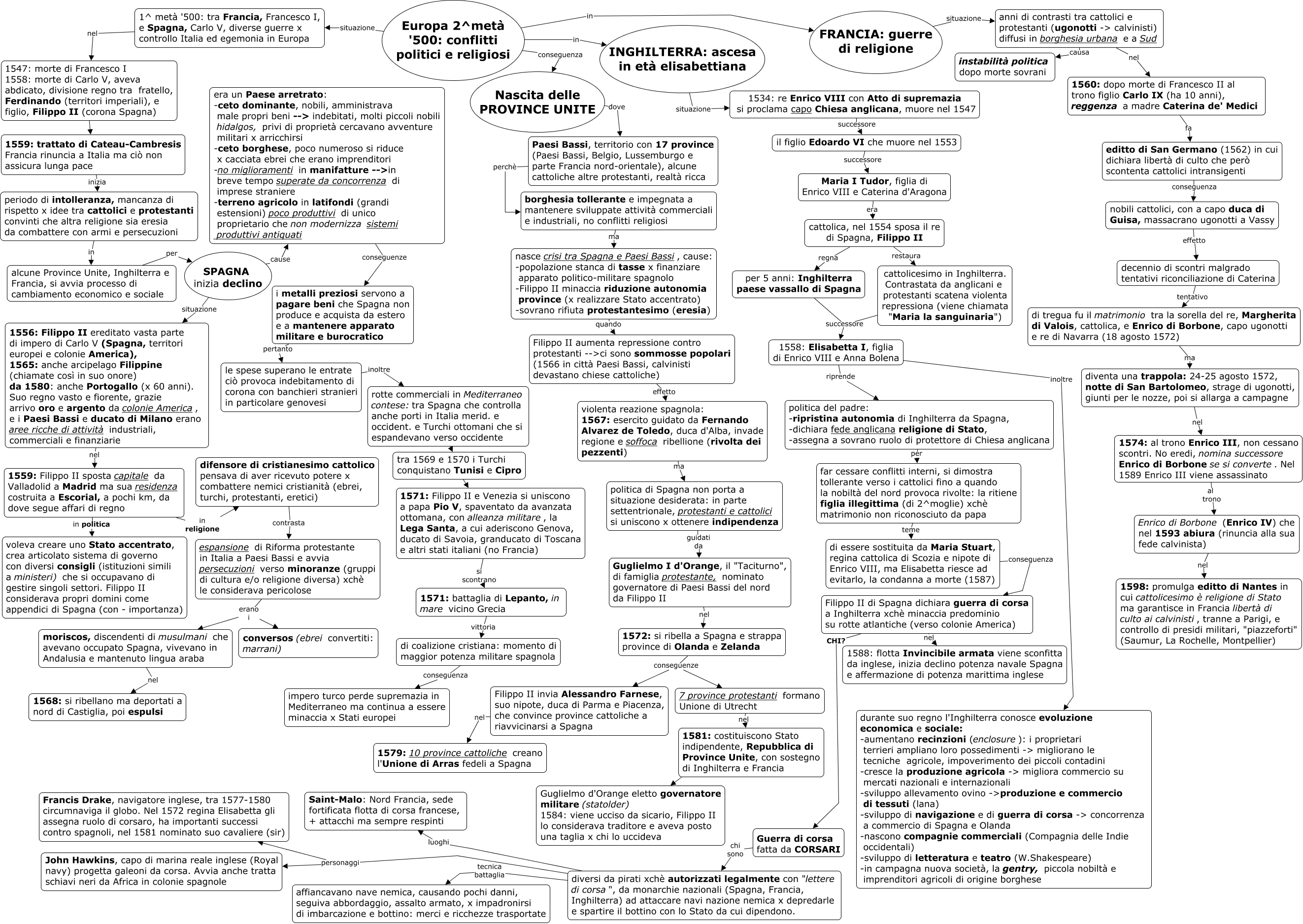 Questa Cmap, creata con IHMC CmapTools, contiene informazioni relative a: Europa1550_conflitti_pol-rel_115, SPAGNA inizia declino cause era un Paese arretrato: -ceto dominante, nobili, amministrava male propri beni --> indebitati, molti piccoli nobili hidalgos, privi di proprietà cercavano avventure militari x arricchirsi -ceto borghese, poco numeroso si riduce x cacciata ebrei che erano imprenditori -no miglioramenti in manifatture -->in breve tempo superate da concorrenza di imprese straniere -terreno agricolo in latifondi (grandi estensioni) poco produttivi di unico proprietario che non modernizza sistemi produttivi antiquati, Maria I Tudor, figlia di Enrico VIII e Caterina d'Aragona era cattolica, nel 1554 sposa il re di Spagna, Filippo II, di essere sostituita da Maria Stuart, regina cattolica di Scozia e nipote di Enrico VIII, ma Elisabetta riesce ad evitarlo, la condanna a morte (1587) conseguenza Filippo II di Spagna dichiara guerra di corsa a Inghilterra xchè minaccia predominio su rotte atlantiche (verso colonie America), difensore di cristianesimo cattolico pensava di aver ricevuto potere x combattere nemici cristianità (ebrei, turchi, protestanti, eretici) contrasta espansione di Riforma protestante in Italia a Paesi Bassi e avvia persecuzioni verso minoranze (gruppi di cultura e/o religione diversa) xchè le considerava pericolose, periodo di intolleranza, mancanza di rispetto x idee tra cattolici e protestanti convinti che altra religione sia eresia da combattere con armi e persecuzioni in alcune Province Unite, Inghilterra e Francia, si avvia processo di cambiamento economico e sociale, SPAGNA inizia declino situazione 1556: Filippo II ereditato vasta parte di impero di Carlo V (Spagna, territori europei e colonie America), 1565: anche arcipelago Filippine (chiamate così in suo onore) da 1580: anche Portogallo (x 60 anni). Suo regno vasto e fiorente, grazie arrivo oro e argento da colonie America, e i Paesi Bassi e ducato di Milano erano aree ricche di attività industriali, commerciali e finanziarie, 1571: Filippo II e Venezia si uniscono a papa Pio V, spaventato da avanzata ottomana, con alleanza militare, la Lega Santa, a cui aderiscono Genova, ducato di Savoia, granducato di Toscana e altri stati italiani (no Francia) si scontrano 1571: battaglia di Lepanto, in mare vicino Grecia, diversi da pirati xchè autorizzati legalmente con "lettere di corsa", da monarchie nazionali (Spagna, Francia, Inghilterra) ad attaccare navi nazione nemica x depredarle e spartire il bottino con lo Stato da cui dipendono. tecnica battaglia affiancavano nave nemica, causando pochi danni, seguiva abbordaggio, assalto armato, x impadronirsi di imbarcazione e bottino: merci e ricchezze trasportate, di tregua fu il matrimonio tra la sorella del re, Margherita di Valois, cattolica, e Enrico di Borbone, capo ugonotti e re di Navarra (18 agosto 1572) ma diventa una trappola: 24-25 agosto 1572, notte di San Bartolomeo, strage di ugonotti, giunti per le nozze, poi si allarga a campagne, Guglielmo I d'Orange, il "Taciturno", di famiglia protestante, nominato governatore di Paesi Bassi del nord da Filippo II nel 1572: si ribella a Spagna e strappa province di Olanda e Zelanda, Nascita delle PROVINCE UNITE dove Paesi Bassi, territorio con 17 province (Paesi Bassi, Belgio, Lussemburgo e parte Francia nord-orientale), alcune cattoliche altre protestanti, realtà ricca, Europa 2^metà '500: conflitti politici e religiosi situazione 1^ metà '500: tra Francia, Francesco I, e Spagna, Carlo V, diverse guerre x controllo Italia ed egemonia in Europa, Paesi Bassi, territorio con 17 province (Paesi Bassi, Belgio, Lussemburgo e parte Francia nord-orientale), alcune cattoliche altre protestanti, realtà ricca perchè borghesia tollerante e impegnata a mantenere sviluppate attività commerciali e industriali, no conflitti religiosi, Filippo II invia Alessandro Farnese, suo nipote, duca di Parma e Piacenza, che convince province cattoliche a riavvicinarsi a Spagna nel 1579: 10 province cattoliche creano l'Unione di Arras fedeli a Spagna, nasce crisi tra Spagna e Paesi Bassi, cause: -popolazione stanca di tasse x finanziare apparato politico-militare spagnolo -Filippo II minaccia riduzione autonomia province (x realizzare Stato accentrato) -sovrano rifiuta protestantesimo (eresia) quando Filippo II aumenta repressione contro protestanti -->ci sono sommosse popolari (1566 in città Paesi Bassi, calvinisti devastano chiese cattoliche), 1547: morte di Francesco I 1558: morte di Carlo V, aveva abdicato, divisione regno tra fratello, Ferdinando (territori imperiali), e figlio, Filippo II (corona Spagna) ???? 1559: trattato di Cateau-Cambresis Francia rinuncia a Italia ma ciò non assicura lunga pace, politica di Spagna non porta a situazione desiderata: in parte settentrionale, protestanti e cattolici si uniscono x ottenere indipendenza guidati da Guglielmo I d'Orange, il "Taciturno", di famiglia protestante, nominato governatore di Paesi Bassi del nord da Filippo II, 1558: Elisabetta I, figlia di Enrico VIII e Anna Bolena inoltre durante suo regno l'Inghilterra conosce evoluzione economica e sociale: -aumentano recinzioni (enclosure): i proprietari terrieri ampliano loro possedimenti -> migliorano le tecniche agricole, impoverimento dei piccoli contadini -cresce la produzione agricola -> migliora commercio su mercati nazionali e internazionali -sviluppo allevamento ovino ->produzione e commercio di tessuti (lana) -sviluppo di navigazione e di guerra di corsa -> concorrenza a commercio di Spagna e Olanda -nascono compagnie commerciali (Compagnia delle Indie occidentali) -sviluppo di letteratura e teatro (W.Shakespeare) -in campagna nuova società, la gentry, piccola nobiltà e imprenditori agricoli di origine borghese, 1571: battaglia di Lepanto, in mare vicino Grecia vittoria di coalizione cristiana: momento di maggior potenza militare spagnola, di coalizione cristiana: momento di maggior potenza militare spagnola co