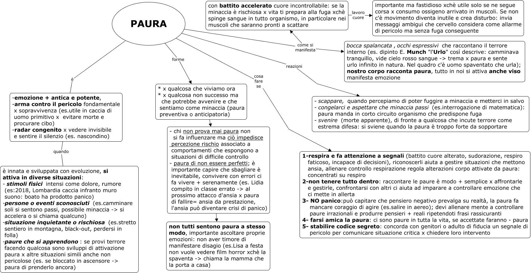 Questa Cmap, creata con IHMC CmapTools, contiene informazioni relative a: PAURA, PAURA è -emozione + antica e potente, -arma contro il pericolo fondamentale x sopravvivenza (es.utile in caccia di uomo primitivo x evitare morte e procurare cibo) -radar congenito x vedere invisibile e sentire il silenzio (es. nascondino), con battito accelerato cuore incontrollabile: se la minaccia è rischiosa x vita ti prepara alla fuga xchè spinge sangue in tutto organismo, in particolare nei muscoli che saranno pronti a scattare lavoro cuore importante ma fastidioso xchè utile solo se ne segue corsa x consumo ossigeno arrivato in muscoli. Se non c'è movimento diventa inutile e crea disturbo: invia messaggi ambigui che cervello considera come allarme di pericolo ma senza fuga conseguente, * x qualcosa che viviamo ora * x qualcosa non successo ma che potrebbe avvenire e che sentiamo come minaccia (paura preventiva o anticipatoria) ???? - chi non prova mai paura non si fa influenzare ma ciò impedisce percezione rischio associato a comportamenti che espongono a situazioni di difficile controllo - paura di non essere perfetti; è importante capire che sbagliare è inevitabile, convivere con errori ci fa vivere + serenamente (es. Lidia compito in classe errato -> al prossimo attacco d'ansia x paura di fallire= ansia da prestazione, l'ansia può diventare crisi di panico), PAURA cosa fare se 1-respira e fa attenzione a segnali (battito cuore alterato, sudorazione, respiro faticoso, incapace di decisioni), riconoscerli aiuta a gestire situazioni che mettono ansia, allenare controllo respirazione regola alterazioni corpo attivate da paura: concentrati su respiro 2-non tenere tutto dentro: raccontare le paure è modo + semplice x affrontarle e gestirle, confrontarsi con altri ci aiuta ad imparare a controllare emozione che ci mette in allerta 3- NO panico:può capitare che pensiero negativo prevalga su realtà, la paura fa mancare coraggio di agire (es.salire in aereo); devi allenare mente a controllare paure irrazionali e produrre pensieri + reali ripetendoti frasi rassicuranti 4- farsi amica la paura: ci sono paure in tutta la vita, se accettate faranno - paura 5- stabilire codice segreto: concorda con genitori o adulto di fiducia un segnale di pericolo per comunicare situazione critica x chiedere loro intervento, PAURA reazioni - scappare, quando percepiamo di poter fuggire a minaccia e metterci in salvo - congelarci e aspettare che minaccia passi (es.interrogazione di matematica): paura manda in corto circuito organismo che predispone fuga - svenire (morte apparente), di fronte a qualcosa che incute terrore come estrema difesa: si sviene quando la paura è troppo forte da sopportare, PAURA come si manifesta bocca spalancata, occhi espressivi che raccontano il terrore interno (es. dipinto E. Munch "l'Urlo" così descrive: camminava tranquillo, vide cielo rosso sangue -> trema x paura e sente urlo infinito in natura. Nel quadro c'è uomo spaventato che urla); nostro corpo racconta paura, tutto in noi si attiva anche viso manifesta emozione, -emozione + antica e potente, -arma contro il pericolo fondamentale x sopravvivenza (es.utile in caccia di uomo primitivo x evitare morte e procurare cibo) -radar congenito x vedere invisibile e sentire il silenzio (es. nascondino) quando è innata e sviluppata con evoluzione, si attiva in diverse situazioni: - stimoli fisici intensi come dolore, rumore (es:2018, Lombardia caccia infranto muro suono: boato ha prodotto panico) -persone o eventi sconosciuti (es.camminare soli si sentono passi, possibile minaccia -> si accelera o si chiama qualcuno) -situazione inquietante o rischiosa (es.stretto sentiero in montagna, black-out, perdersi in folla) -paure che si apprendono: se provi terrore facendo qualcosa sono sviluppi di attivazione paura x altre situazioni simili anche non pericolose (es. se bloccato in ascensore -> paura di prenderlo ancora), PAURA come si manifesta con battito accelerato cuore incontrollabile: se la minaccia è rischiosa x vita ti prepara alla fuga xchè spinge sangue in tutto organismo, in particolare nei muscoli che saranno pronti a scattare, - chi non prova mai paura non si fa influenzare ma ciò impedisce percezione rischio associato a comportamenti che espongono a situazioni di difficile controllo - paura di non essere perfetti; è importante capire che sbagliare è inevitabile, convivere con errori ci fa vivere + serenamente (es. Lidia compito in classe errato -> al prossimo attacco d'ansia x paura di fallire= ansia da prestazione, l'ansia può diventare crisi di panico) ???? non tutti sentono paura a stesso modo, importante ascoltare proprie emozioni: non aver timore di manifestare disagio (es.Lisa a festa non vuole vedere film horror xchè la spaventa -> chiama la mamma che la porta a casa), PAURA forme * x qualcosa che viviamo ora * x qualcosa non successo ma che potrebbe avvenire e che sentiamo come minaccia (paura preventiva o anticipatoria)