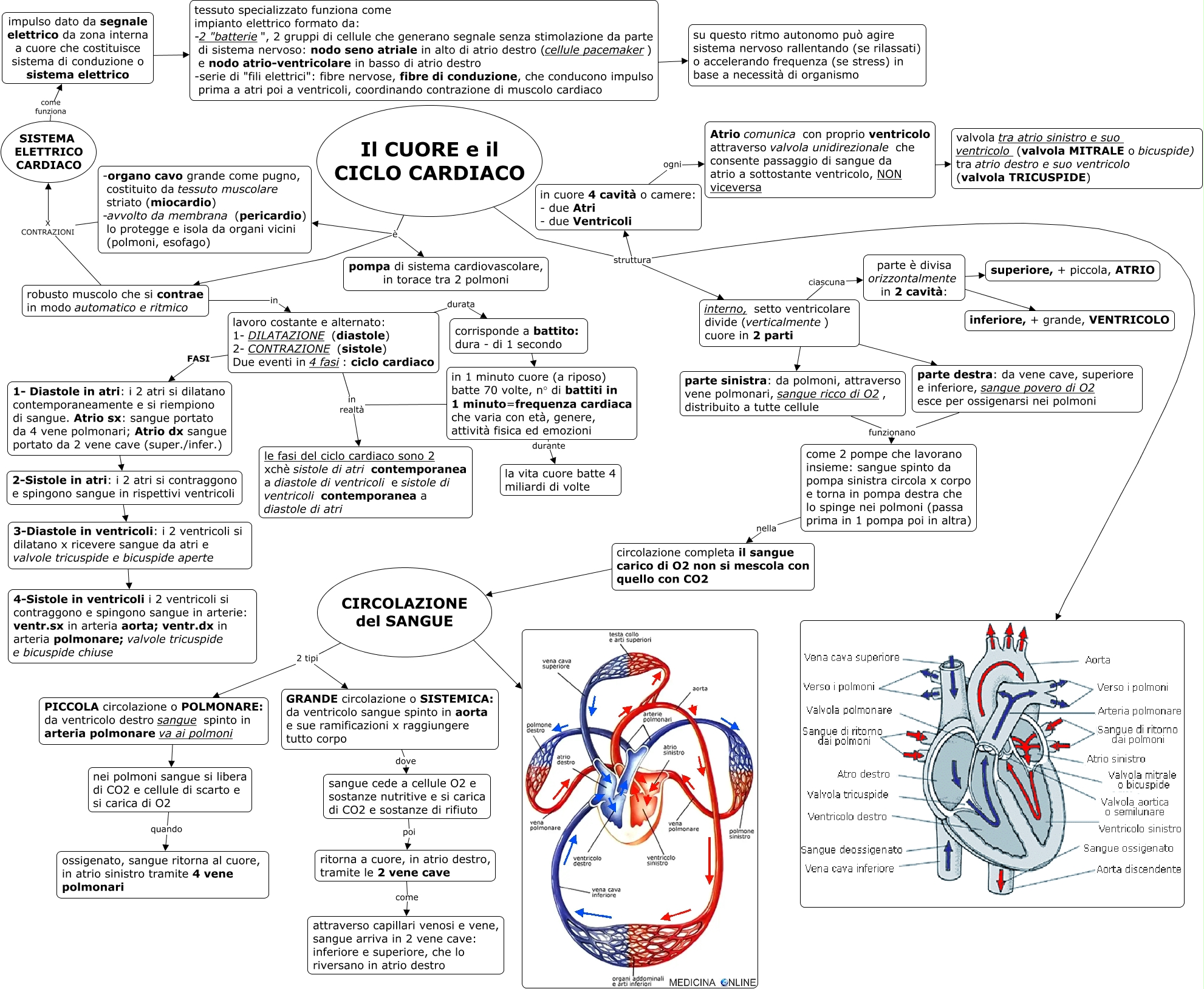 Questa Cmap, creata con IHMC CmapTools, contiene informazioni relative a: CUORE_ciclo cardiaco, 3-Diastole in ventricoli: i 2 ventricoli si dilatano x ricevere sangue da atri e valvole tricuspide e bicuspide aperte ???? 4-Sistole in ventricoli i 2 ventricoli si contraggono e spingono sangue in arterie: ventr.sx in arteria aorta; ventr.dx in arteria polmonare; valvole tricuspide e bicuspide chiuse, robusto muscolo che si contrae in modo automatico e ritmico in lavoro costante e alternato: 1- DILATAZIONE (diastole) 2- CONTRAZIONE (sistole) Due eventi in 4 fasi: ciclo cardiaco, parte è divisa orizzontalmente in 2 cavità: ???? inferiore, + grande, VENTRICOLO, GRANDE circolazione o SISTEMICA: da ventricolo sangue spinto in aorta e sue ramificazioni x raggiungere tutto corpo dove sangue cede a cellule O2 e sostanze nutritive e si carica di CO2 e sostanze di rifiuto, nei polmoni sangue si libera di CO2 e cellule di scarto e si carica di O2 quando ossigenato, sangue ritorna al cuore, in atrio sinistro tramite 4 vene polmonari, impulso dato da segnale elettrico da zona interna a cuore che costituisce sistema di conduzione o sistema elettrico ???? tessuto specializzato funziona come impianto elettrico formato da: -2 "batterie", 2 gruppi di cellule che generano segnale senza stimolazione da parte di sistema nervoso: nodo seno atriale in alto di atrio destro (cellule pacemaker) e nodo atrio-ventricolare in basso di atrio destro -serie di "fili elettrici": fibre nervose, fibre di conduzione, che conducono impulso prima a atri poi a ventricoli, coordinando contrazione di muscolo cardiaco, robusto muscolo che si contrae in modo automatico e ritmico X CONTRAZIONI SISTEMA ELETTRICO CARDIACO, CIRCOLAZIONE del SANGUE 2 tipi GRANDE circolazione o SISTEMICA: da ventricolo sangue spinto in aorta e sue ramificazioni x raggiungere tutto corpo, parte è divisa orizzontalmente in 2 cavità: ???? superiore, + piccola, ATRIO, ritorna a cuore, in atrio destro, tramite le 2 vene cave come attraverso capillari venosi e vene, sangue arriva in 2 vene cave: inferiore e superiore, che lo riversano in atrio destro, SISTEMA ELETTRICO CARDIACO come funziona impulso dato da segnale elettrico da zona interna a cuore che costituisce sistema di conduzione o sistema elettrico, Il CUORE e il CICLO CARDIACO struttura interno, setto ventricolare divide (verticalmente) cuore in 2 parti, interno, setto ventricolare divide (verticalmente) cuore in 2 parti ???? parte sinistra: da polmoni, attraverso vene polmonari, sangue ricco di O2, distribuito a tutte cellule, lavoro costante e alternato: 1- DILATAZIONE (diastole) 2- CONTRAZIONE (sistole) Due eventi in 4 fasi: ciclo cardiaco in realtà le fasi del ciclo cardiaco sono 2 xchè sistole di atri contemporanea a diastole di ventricoli e sistole di ventricoli contemporanea a diastole di atri, 2-Sistole in atri: i 2 atri si contraggono e spingono sangue in rispettivi ventricoli ???? 3-Diastole in ventricoli: i 2 ventricoli si dilatano x ricevere sangue da atri e valvole tricuspide e bicuspide aperte, -organo cavo grande come pugno, costituito da tessuto muscolare striato (miocardio) -avvolto da membrana (pericardio) lo protegge e isola da organi vicini (polmoni, esofago) X CONTRAZIONI SISTEMA ELETTRICO CARDIACO, Il CUORE e il CICLO CARDIACO struttura, in cuore 4 cavità o camere: - due Atri - due Ventricoli ogni Atrio comunica con proprio ventricolo attraverso valvola unidirezionale che consente passaggio di sangue da atrio a sottostante ventricolo, NON viceversa, PICCOLA circolazione o POLMONARE: da ventricolo destro sangue spinto in arteria polmonare va ai polmoni ???? nei polmoni sangue si libera di CO2 e cellule di scarto e si carica di O2, 1- Diastole in atri: i 2 atri si dilatano contemporaneamente e si riempiono di sangue. Atrio sx: sangue portato da 4 vene polmonari; Atrio dx sangue portato da 2 vene cave (super./infer.) ???? 2-Sistole in atri: i 2 atri si contraggono e spingono sangue in rispettivi ventricoli