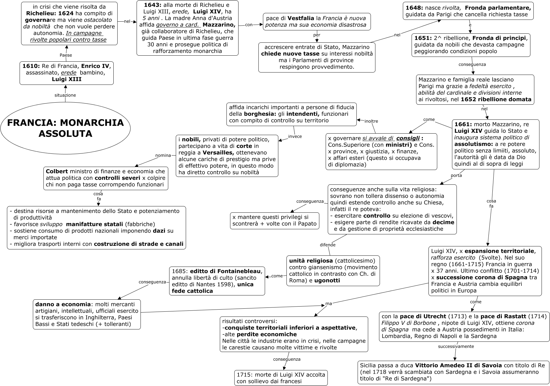 Questa Cmap, creata con IHMC CmapTools, contiene informazioni relative a: FRANCIA_monarchia assoluta, in crisi che viene risolta da Richelieu: 1624 ha compito di governare ma viene ostacolato da nobiltà che non vuole perdere autonomia. In campagne rivolte popolari contro tasse nel 1643: alla morte di Richelieu e Luigi XIII, erede, Luigi XIV, ha 5 anni. La madre Anna d'Austria affida governo a card. Mazzarino, già collaboratore di Richelieu, che guida Paese in ultima fase guerra 30 anni e prosegue politica di rafforzamento monarchia, risultati controversi: -conquiste territoriali inferiori a aspettative, -alte perdite economiche Nelle città le industrie erano in crisi, nelle campagne le carestie causano molte vittime e rivolte conseguenza 1715: morte di Luigi XIV accolta con sollievo dai francesi, 1648: nasce rivolta, Fronda parlamentare, guidata da Parigi che cancella richiesta tasse e 1651: 2^ ribellione, Fronda di principi, guidata da nobili che devasta campagne peggiorando condizioni popolo, Mazzarino e famiglia reale lasciano Parigi ma grazie a fedeltà esercito, abilità del cardinale e divisioni interne ai rivoltosi, nel 1652 ribellione domata nel 1661: morto Mazzarino, re Luigi XIV guida lo Stato e inaugura sistema politico di assolutismo: a re potere politico senza limiiti, assoluto, l'autorità gli è data da Dio quindi al di sopra di leggi, Luigi XIV, x espansione territoriale, rafforza esercito (5volte). Nel suo regno (1661-1715) Francia in guerra x 37 anni. Ultimo conflitto (1701-1714) x successione corona di Spagna tra Francia e Austria cambia equilibri politici in Europa ma risultati controversi: -conquiste territoriali inferiori a aspettative, -alte perdite economiche Nelle città le industrie erano in crisi, nelle campagne le carestie causano molte vittime e rivolte, pace di Vestfalia la Francia è nuova potenza ma sua economia disastrosa per accrescere entrate di Stato, Mazzarino chiede nuove tasse su interessi nobiltà ma i Parlamenti di province respingono provvedimento., 1643: alla morte di Richelieu e Luigi XIII, erede, Luigi XIV, ha 5 anni. La madre Anna d'Austria affida governo a card. Mazzarino, già collaboratore di Richelieu, che guida Paese in ultima fase guerra 30 anni e prosegue politica di rafforzamento monarchia con pace di Vestfalia la Francia è nuova potenza ma sua economia disastrosa, conseguenze anche sulla vita religiosa: sovrano non tollera dissenso o autonomia quindi estende controllo anche su Chiesa, infatti il re poteva: - esercitare controllo su elezione di vescovi, - esigere parte di rendite ricavate da decime e da gestione di proprietà ecclesiastiche difende unità religiosa (cattolicesimo) contro giansenismo (movimento cattolico in contrasto con Ch. di Roma) e ugonotti, 1661: morto Mazzarino, re Luigi XIV guida lo Stato e inaugura sistema politico di assolutismo: a re potere politico senza limiiti, assoluto, l'autorità gli è data da Dio quindi al di sopra di leggi come x governare si avvale di consigli: Cons.Superiore (con ministri) e Cons. x province, x giustizia, x finanze, x affari esteri (questo si occupava di diplomazia), danno a economia: molti mercanti artigiani, intellettuali, ufficiali esercito si trasferiscono in Inghilterra, Paesi Bassi e Stati tedeschi (+ tolleranti) ma risultati controversi: -conquiste territoriali inferiori a aspettative, -alte perdite economiche Nelle città le industrie erano in crisi, nelle campagne le carestie causano molte vittime e rivolte, 1685: editto di Fontainebleau, annulla libertà di culto (sancito editto di Nantes 1598), unica fede cattolica conseguenza danno a economia: molti mercanti artigiani, intellettuali, ufficiali esercito si trasferiscono in Inghilterra, Paesi Bassi e Stati tedeschi (+ tolleranti), 1661: morto Mazzarino, re Luigi XIV guida lo Stato e inaugura sistema politico di assolutismo: a re potere politico senza limiiti, assoluto, l'autorità gli è data da Dio quindi al di sopra di leggi porta conseguenze anche sulla vita religiosa: sovrano non tollera dissenso o autonomia quindi estende controllo anche su Chiesa, infatti il re poteva: - esercitare controllo su elezione di vescovi, - esigere parte di rendite ricavate da decime e da gestione di proprietà ecclesiastiche, 1610: Re di Francia, Enrico IV, assassinato, erede bambino, Luigi XIII Paese in crisi che viene risolta da Richelieu: 1624 ha compito di governare ma viene ostacolato da nobiltà che non vuole perdere autonomia. In campagne rivolte popolari contro tasse, Luigi XIV, x espansione territoriale, rafforza esercito (5volte). Nel suo regno (1661-1715) Francia in guerra x 37 anni. Ultimo conflitto (1701-1714) x successione corona di Spagna tra Francia e Austria cambia equilibri politici in Europa come con la pace di Utrecht (1713) e la pace di Rastatt (1714) Filippo V di Borbone, nipote di Luigi XIV, ottiene corona di Spagna ma cede a Austria possedimenti in Italia: Lombardia, Regno di Napoli e la Sardegna, x governare si avvale di consigli: Cons.Superiore (con ministri) e Cons. x province, x giustizia, x finanze, x affari esteri (questo si occupava di diplomazia) inoltre affida incarichi importanti a persone di fiducia della borghesia: gli intendenti, funzionari con compito di controllo su territorio, accrescere entrate di Stato, Mazzarino chiede nuove tasse su interessi nobiltà ma i Parlamenti di province respingono provvedimento. nel 1648: nasce rivolta, Fronda parlamentare, guidata da Parigi che cancella richiesta tasse, i nobili, privati di potere politico, partecipano a vita di corte in reggia a Versailles, ottenevano alcune cariche di prestigio ma prive di effettivo potere, in questo modo ha diretto controllo su nobiltà nomina Colbert ministro di finanze e economia che attua politica con controlli severi x colpire chi non paga tasse corrompendo funzionari, conseguenze anche sulla vita religiosa: sovrano non tollera dissenso o autonomia quindi estende controllo anche su Chiesa, infatti il re poteva: - esercitare 