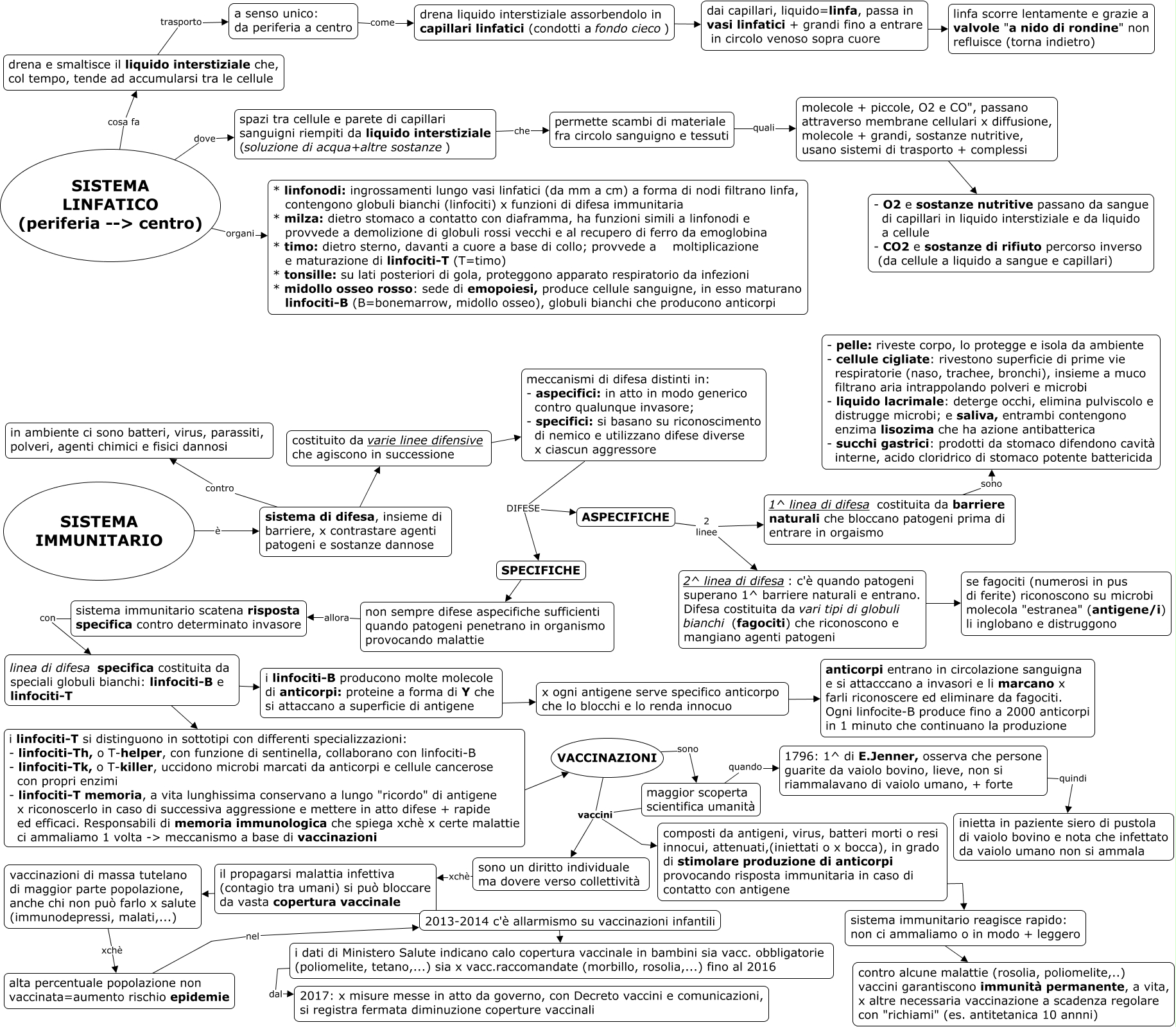 Questa Cmap, creata con IHMC CmapTools, contiene informazioni relative a: Sist_Linfatico-Immunitario, meccanismi di difesa distinti in: - aspecifici: in atto in modo generico contro qualunque invasore; - specifici: si basano su riconoscimento di nemico e utilizzano difese diverse x ciascun aggressore DIFESE SPECIFICHE, meccanismi di difesa distinti in: - aspecifici: in atto in modo generico contro qualunque invasore; - specifici: si basano su riconoscimento di nemico e utilizzano difese diverse x ciascun aggressore DIFESE ASPECIFICHE, SISTEMA IMMUNITARIO è sistema di difesa, insieme di barriere, x contrastare agenti patogeni e sostanze dannose, vaccinazioni di massa tutelano di maggior parte popolazione, anche chi non può farlo x salute (immunodepressi, malati,...) xchè alta percentuale popolazione non vaccinata=aumento rischio epidemie, costituito da varie linee difensive che agiscono in successione ???? meccanismi di difesa distinti in: - aspecifici: in atto in modo generico contro qualunque invasore; - specifici: si basano su riconoscimento di nemico e utilizzano difese diverse x ciascun aggressore, VACCINAZIONI vaccini composti da antigeni, virus, batteri morti o resi innocui, attenuati,(iniettati o x bocca), in grado di stimolare produzione di anticorpi provocando risposta immunitaria in caso di contatto con antigene, sistema di difesa, insieme di barriere, x contrastare agenti patogeni e sostanze dannose ???? costituito da varie linee difensive che agiscono in successione, permette scambi di materiale fra circolo sanguigno e tessuti quali molecole + piccole, O2 e CO", passano attraverso membrane cellulari x diffusione, molecole + grandi, sostanze nutritive, usano sistemi di trasporto + complessi, 2013-2014 c'è allarmismo su vaccinazioni infantili ???? i dati di Ministero Salute indicano calo copertura vaccinale in bambini sia vacc. obbligatorie (poliomelite, tetano,...) sia x vacc.raccomandate (morbillo, rosolia,...) fino al 2016, VACCINAZIONI sono maggior scoperta scientifica umanità, maggior scoperta scientifica umanità vaccini sono un diritto individuale ma dovere verso collettività, composti da antigeni, virus, batteri morti o resi innocui, attenuati,(iniettati o x bocca), in grado di stimolare produzione di anticorpi provocando risposta immunitaria in caso di contatto con antigene ???? sistema immunitario reagisce rapido: non ci ammaliamo o in modo + leggero, drena liquido interstiziale assorbendolo in capillari linfatici (condotti a fondo cieco) ???? dai capillari, liquido=linfa, passa in vasi linfatici + grandi fino a entrare in circolo venoso sopra cuore, sono un diritto individuale ma dovere verso collettività xchè il propagarsi malattia infettiva (contagio tra umani) si può bloccare da vasta copertura vaccinale, x ogni antigene serve specifico anticorpo che lo blocchi e lo renda innocuo ???? anticorpi entrano in circolazione sanguigna e si attacccano a invasori e li marcano x farli riconoscere ed eliminare da fagociti. Ogni linfocite-B produce fino a 2000 anticorpi in 1 minuto che continuano la produzione, ASPECIFICHE 2 linee 1^ linea di difesa costituita da barriere naturali che bloccano patogeni prima di entrare in orgaismo, sistema immunitario reagisce rapido: non ci ammaliamo o in modo + leggero ???? contro alcune malattie (rosolia, poliomelite,..) vaccini garantiscono immunità permanente, a vita, x altre necessaria vaccinazione a scadenza regolare con "richiami" (es. antitetanica 10 annni), il propagarsi malattia infettiva (contagio tra umani) si può bloccare da vasta copertura vaccinale ???? vaccinazioni di massa tutelano di maggior parte popolazione, anche chi non può farlo x salute (immunodepressi, malati,...), ASPECIFICHE 2 linee 2^ linea di difesa: c'è quando patogeni superano 1^ barriere naturali e entrano. Difesa costituita da vari tipi di globuli bianchi (fagociti) che riconoscono e mangiano agenti patogeni, alta percentuale popolazione non vaccinata=aumento rischio epidemie nel 2013-2014 c'è allarmismo su vaccinazioni infantili