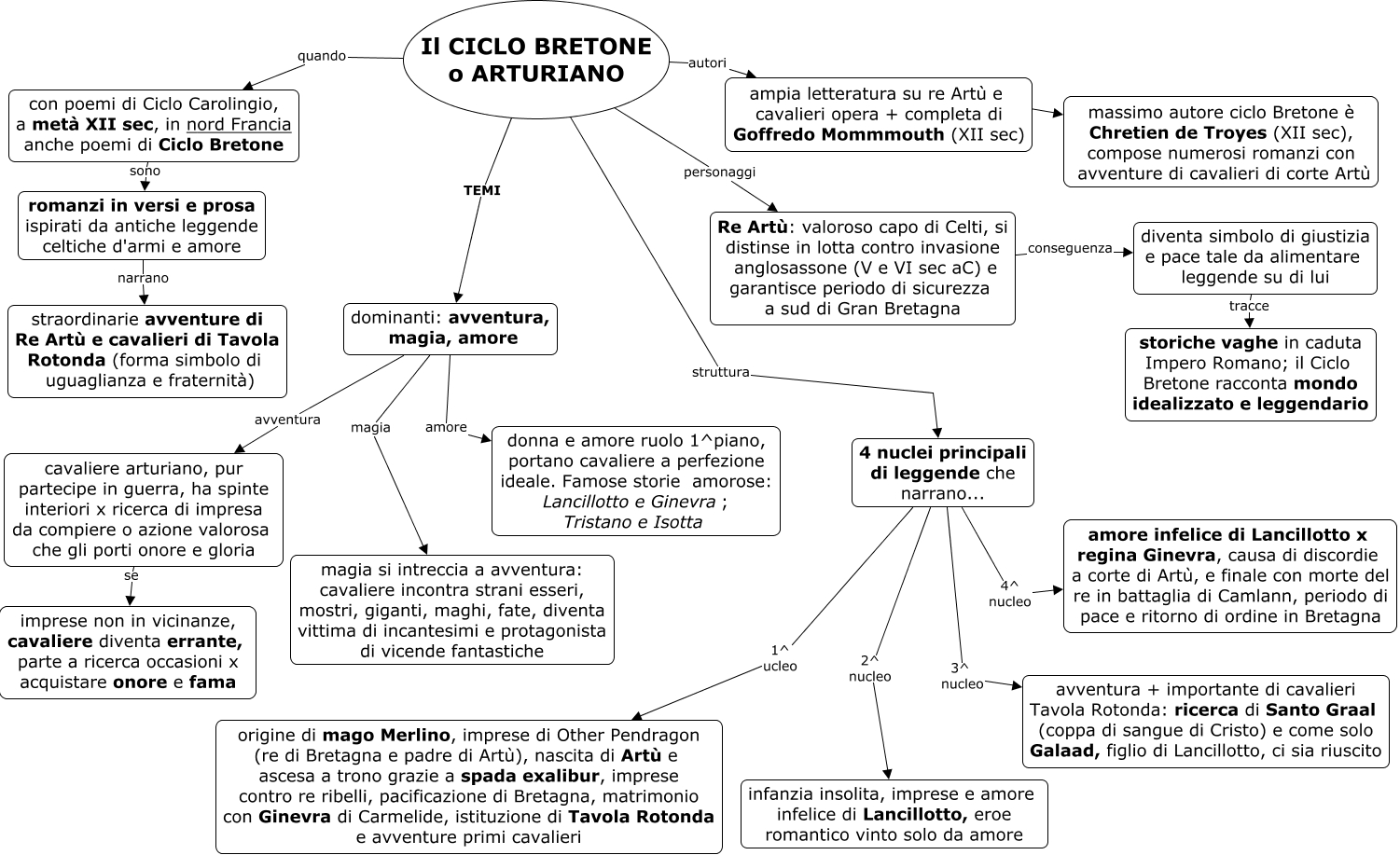 Questa Cmap, creata con IHMC CmapTools, contiene informazioni relative a: Ciclo Bretone, 4 nuclei principali di leggende che narrano... 1^ ucleo origine di mago Merlino, imprese di Other Pendragon (re di Bretagna e padre di Artù), nascita di Artù e ascesa a trono grazie a spada exalibur, imprese contro re ribelli, pacificazione di Bretagna, matrimonio con Ginevra di Carmelide, istituzione di Tavola Rotonda e avventure primi cavalieri, dominanti: avventura, magia, amore avventura cavaliere arturiano, pur partecipe in guerra, ha spinte interiori x ricerca di impresa da compiere o azione valorosa che gli porti onore e gloria, 4 nuclei principali di leggende che narrano... 3^ nucleo avventura + importante di cavalieri Tavola Rotonda: ricerca di Santo Graal (coppa di sangue di Cristo) e come solo Galaad, figlio di Lancillotto, ci sia riuscito, Il CICLO BRETONE o ARTURIANO quando con poemi di Ciclo Carolingio, a metà XII sec, in nord Francia anche poemi di Ciclo Bretone, Il CICLO BRETONE o ARTURIANO autori ampia letteratura su re Artù e cavalieri opera + completa di Goffredo Mommmouth (XII sec), 4 nuclei principali di leggende che narrano... 4^ nucleo amore infelice di Lancillotto x regina Ginevra, causa di discordie a corte di Artù, e finale con morte del re in battaglia di Camlann, periodo di pace e ritorno di ordine in Bretagna, Re Artù: valoroso capo di Celti, si distinse in lotta contro invasione anglosassone (V e VI sec aC) e garantisce periodo di sicurezza a sud di Gran Bretagna conseguenza diventa simbolo di giustizia e pace tale da alimentare leggende su di lui, romanzi in versi e prosa ispirati da antiche leggende celtiche d'armi e amore narrano straordinarie avventure di Re Artù e cavalieri di Tavola Rotonda (forma simbolo di uguaglianza e fraternità), ampia letteratura su re Artù e cavalieri opera + completa di Goffredo Mommmouth (XII sec) ???? massimo autore ciclo Bretone è Chretien de Troyes (XII sec), compose numerosi romanzi con avventure di cavalieri di corte Artù, Il CICLO BRETONE o ARTURIANO struttura 4 nuclei principali di leggende che narrano..., con poemi di Ciclo Carolingio, a metà XII sec, in nord Francia anche poemi di Ciclo Bretone sono romanzi in versi e prosa ispirati da antiche leggende celtiche d'armi e amore, Il CICLO BRETONE o ARTURIANO TEMI dominanti: avventura, magia, amore, dominanti: avventura, magia, amore amore donna e amore ruolo 1^piano, portano cavaliere a perfezione ideale. Famose storie amorose: Lancillotto e Ginevra; Tristano e Isotta, dominanti: avventura, magia, amore magia magia si intreccia a avventura: cavaliere incontra strani esseri, mostri, giganti, maghi, fate, diventa vittima di incantesimi e protagonista di vicende fantastiche, 4 nuclei principali di leggende che narrano... 2^ nucleo infanzia insolita, imprese e amore infelice di Lancillotto, eroe romantico vinto solo da amore, Il CICLO BRETONE o ARTURIANO personaggi Re Artù: valoroso capo di Celti, si distinse in lotta contro invasione anglosassone (V e VI sec aC) e garantisce periodo di sicurezza a sud di Gran Bretagna, diventa simbolo di giustizia e pace tale da alimentare leggende su di lui tracce storiche vaghe in caduta Impero Romano; il Ciclo Bretone racconta mondo idealizzato e leggendario, cavaliere arturiano, pur partecipe in guerra, ha spinte interiori x ricerca di impresa da compiere o azione valorosa che gli porti onore e gloria se imprese non in vicinanze, cavaliere diventa errante, parte a ricerca occasioni x acquistare onore e fama