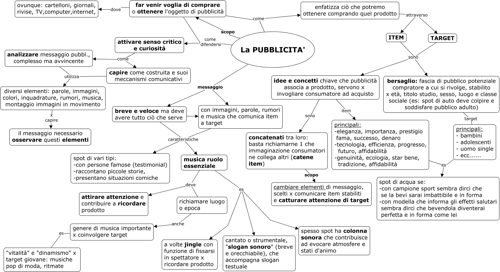 Questa Cmap, creata con IHMC CmapTools, contiene informazioni relative a: La PUBBLICITA', principali: -eleganza, importanza, prestigio fama, successo, denaro -tecnologia, efficienza, progresso, futuro, affidabilità -genuinità, ecologia, star bene, tradizione, affidabilità es spot di acqua se: -con campione sport sembra dirci che se la bevi sarai imbattibile e in forma -con modella che informa gli effetti salutari sembra dirci che bevendola diventerai perfetta e in forma come lei, diversi elementi: parole, immagini, colori, inquadrature, rumori, musica, montaggio immagini in movimento x capire il messaggio necessario osservare questi elementi, far venir voglia di comprare o ottenere l'oggetto di pubblicità come difendersi attivare senso critico e curiosità, breve e veloce ma deve avere tutto ciò che serve caratteristiche musica ruolo essenziale, bersaglio: fascia di pubblico potenziale compratore a cui si rivolge, stabilito x età, titolo studio, sesso, luogo e classe sociale (es: spot di auto deve colpire e soddisfare pubblico adulto) target principali: - bambini - adolescenti - uomo single - ecc......, attivare senso critico e curiosità come analizzare messaggio pubbl., complesso ma avvincente, La PUBBLICITA' come difendersi attivare senso critico e curiosità, breve e veloce ma deve avere tutto ciò che serve caratteristiche spot di vari tipi: -con persone famose (testimonial) -raccontano piccole storie, -presentano situazioni comiche, con immagini, parole, rumori e musica che comunica item a target caratteristiche musica ruolo essenziale, La PUBBLICITA' messaggio con immagini, parole, rumori e musica che comunica item a target, La PUBBLICITA' scopo far venir voglia di comprare o ottenere l'oggetto di pubblicità, idee e concetti chiave che pubblicità associa a prodotto, servono x invogliare consumatore ad acquisto item principali: -eleganza, importanza, prestigio fama, successo, denaro -tecnologia, efficienza, progresso, futuro, affidabilità -genuinità, ecologia, star bene, tradizione, affidabilità, enfatizza ciò che potremo ottenere comprando quel prodotto attraverso ITEM, TARGET sono bersaglio: fascia di pubblico potenziale compratore a cui si rivolge, stabilito x età, titolo studio, sesso, luogo e classe sociale (es: spot di auto deve colpire e soddisfare pubblico adulto), con immagini, parole, rumori e musica che comunica item a target caratteristiche spot di vari tipi: -con persone famose (testimonial) -raccontano piccole storie, -presentano situazioni comiche, idee e concetti chiave che pubblicità associa a prodotto, servono x invogliare consumatore ad acquisto sono concatenati tra loro: basta richiamarne 1 che immaginazione consumatori ne collega altri (catene item), far venir voglia di comprare o ottenere l'oggetto di pubblicità dove ovunque: cartelloni, giornali, rivise, TV,computer,internet,, breve e veloce ma deve avere tutto ciò che serve ???? con immagini, parole, rumori e musica che comunica item a target, attivare senso critico e curiosità come capire come costruita e suoi meccanismi comunicativi, musica ruolo essenziale es a volte jingle con funzione di fissarsi in spettatore x ricordare prodotto