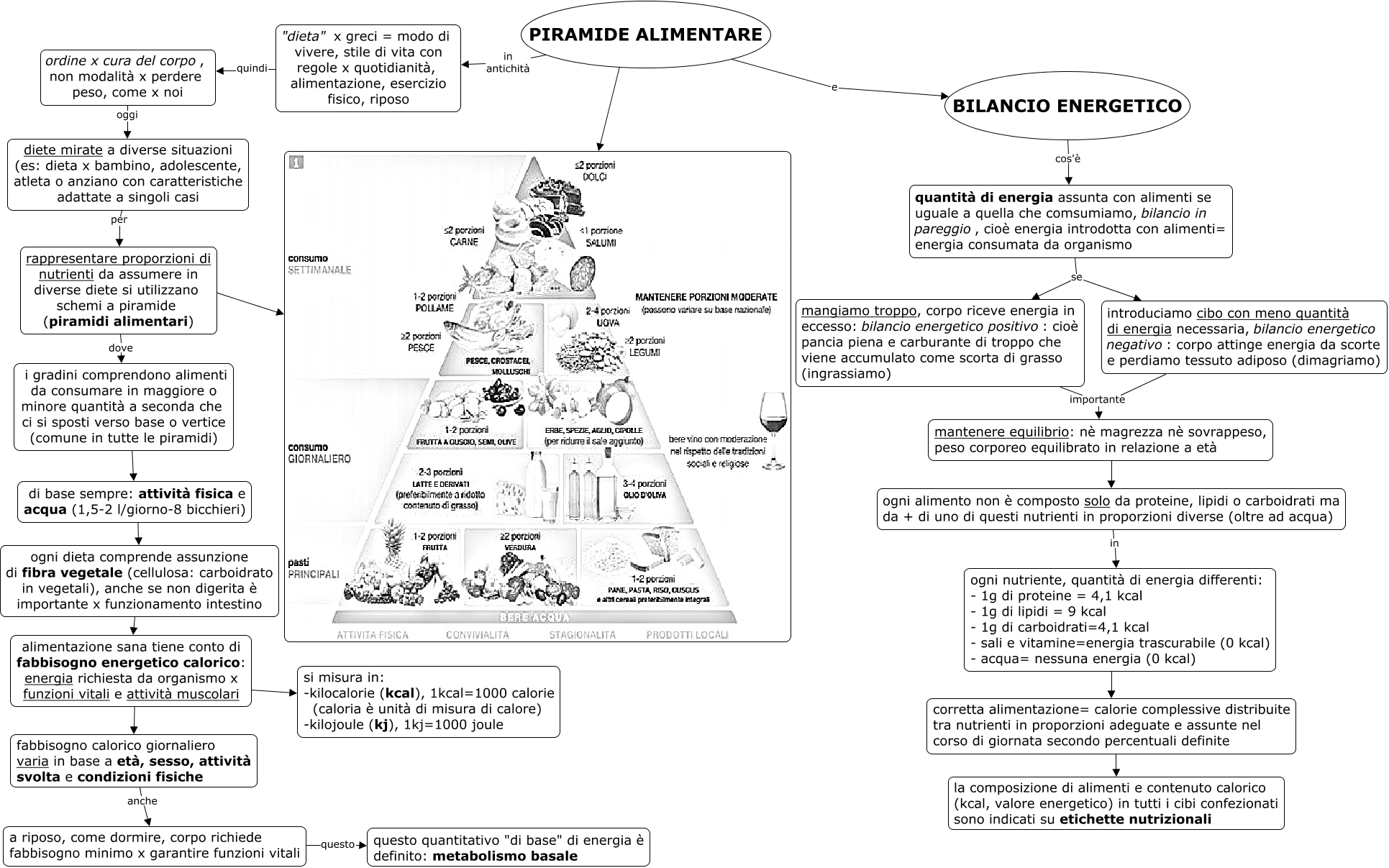 Questa Cmap, creata con IHMC CmapTools, contiene informazioni relative a: Piramide alimentare_bilancio energetico, PIRAMIDE ALIMENTARE e BILANCIO ENERGETICO, ordine x cura del corpo, non modalità x perdere peso, come x noi oggi diete mirate a diverse situazioni (es: dieta x bambino, adolescente, atleta o anziano con caratteristiche adattate a singoli casi, mantenere equilibrio: nè magrezza nè sovrappeso, peso corporeo equilibrato in relazione a età ???? ogni alimento non è composto solo da proteine, lipidi o carboidrati ma da + di uno di questi nutrienti in proporzioni diverse (oltre ad acqua), a riposo, come dormire, corpo richiede fabbisogno minimo x garantire funzioni vitali questo questo quantitativo "di base" di energia è definito: metabolismo basale, "dieta" x greci = modo di vivere, stile di vita con regole x quotidianità, alimentazione, esercizio fisico, riposo quindi ordine x cura del corpo, non modalità x perdere peso, come x noi, fabbisogno calorico giornaliero varia in base a età, sesso, attività svolta e condizioni fisiche anche a riposo, come dormire, corpo richiede fabbisogno minimo x garantire funzioni vitali, ogni dieta comprende assunzione di fibra vegetale (cellulosa: carboidrato in vegetali), anche se non digerita è importante x funzionamento intestino ???? alimentazione sana tiene conto di fabbisogno energetico calorico: energia richiesta da organismo x funzioni vitali e attività muscolari, mangiamo troppo, corpo riceve energia in eccesso: bilancio energetico positivo: cioè pancia piena e carburante di troppo che viene accumulato come scorta di grasso (ingrassiamo) importante mantenere equilibrio: nè magrezza nè sovrappeso, peso corporeo equilibrato in relazione a età, quantità di energia assunta con alimenti se uguale a quella che comsumiamo, bilancio in pareggio, cioè energia introdotta con alimenti= energia consumata da organismo se mangiamo troppo, corpo riceve energia in eccesso: bilancio energetico positivo: cioè pancia piena e carburante di troppo che viene accumulato come scorta di grasso (ingrassiamo), alimentazione sana tiene conto di fabbisogno energetico calorico: energia richiesta da organismo x funzioni vitali e attività muscolari ???? fabbisogno calorico giornaliero varia in base a età, sesso, attività svolta e condizioni fisiche, ogni alimento non è composto solo da proteine, lipidi o carboidrati ma da + di uno di questi nutrienti in proporzioni diverse (oltre ad acqua) in ogni nutriente, quantità di energia differenti: - 1g di proteine = 4,1 kcal - 1g di lipidi = 9 kcal - 1g di carboidrati=4,1 kcal - sali e vitamine=energia trascurabile (0 kcal) - acqua= nessuna energia (0 kcal), diete mirate a diverse situazioni (es: dieta x bambino, adolescente, atleta o anziano con caratteristiche adattate a singoli casi per rappresentare proporzioni di nutrienti da assumere in diverse diete si utilizzano schemi a piramide (piramidi alimentari), PIRAMIDE ALIMENTARE in antichità "dieta" x greci = modo di vivere, stile di vita con regole x quotidianità, alimentazione, esercizio fisico, riposo, rappresentare proporzioni di nutrienti da assumere in diverse diete si utilizzano schemi a piramide (piramidi alimentari) ????, rappresentare proporzioni di nutrienti da assumere in diverse diete si utilizzano schemi a piramide (piramidi alimentari) dove i gradini comprendono alimenti da consumare in maggiore o minore quantità a seconda che ci si sposti verso base o vertice (comune in tutte le piramidi), quantità di energia assunta con alimenti se uguale a quella che comsumiamo, bilancio in pareggio, cioè energia introdotta con alimenti= energia consumata da organismo se introduciamo cibo con meno quantità di energia necessaria, bilancio energetico negativo: corpo attinge energia da scorte e perdiamo tessuto adiposo (dimagriamo), ogni nutriente, quantità di energia differenti: - 1g di proteine = 4,1 kcal - 1g di lipidi = 9 kcal - 1g di carboidrati=4,1 kcal - sali e vitamine=energia trascurabile (0 kcal) - acqua= nessuna energia (0 kcal) ???? corretta alimentazione= calorie complessive distribuite tra nutrienti in proporzioni adeguate e assunte nel corso di giornata secondo percentuali definite, alimentazione sana tiene conto di fabbisogno energetico calorico: energia richiesta da organismo x funzioni vitali e attività muscolari ???? si misura in: -kilocalorie (kcal), 1kcal=1000 calorie (caloria è unità di misura di calore) -kilojoule (kj), 1kj=1000 joule, i gradini comprendono alimenti da consumare in maggiore o minore quantità a seconda che ci si sposti verso base o vertice (comune in tutte le piramidi) ???? di base sempre: attività fisica e acqua (1,5-2 l/giorno-8 bicchieri), BILANCIO ENERGETICO cos'è quantità di energia assunta con alimenti se uguale a quella che comsumiamo, bilancio in pareggio, cioè energia introdotta con alimenti= energia consumata da organismo
