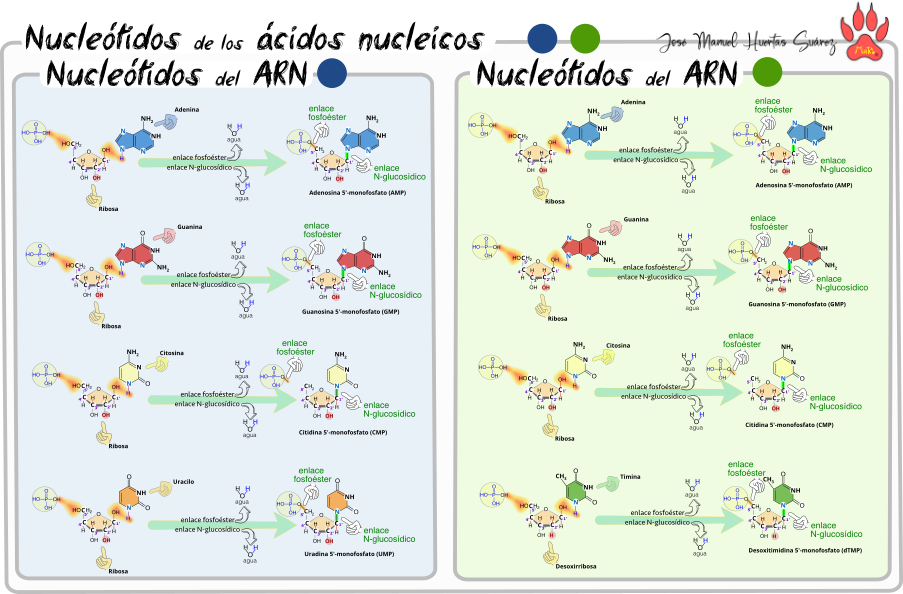 Recursos Tema 04 Ácidos nucleicos Enlace fosfoéster y N-glucosídico.png Esquema del ácido nucleico.png Esquema de un nucleótido.png Formación de nucleósidos de desoxirribosa.png Formación de nucleósidos de ribosa.png Nucleótidos de los ácidos nucleicos.png Unión de nucleótidos.png