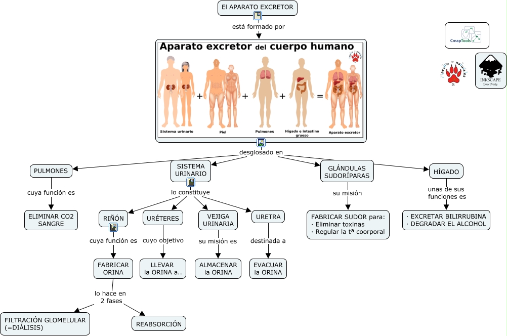 Este Cmap, tiene información relacionada con: 4.5 El aparato excretor, desglosado en GLÁNDULAS SUDORÍPARAS, SISTEMA URINARIO lo constituye VEJIGA URINARIA, RIÑÓN cuya función es FABRICAR ORINA, URÉTERES cuyo objetivo LLEVAR la ORINA a.., SISTEMA URINARIO lo constituye URETRA, HÍGADO unas de sus funciones es · EXCRETAR BILIRRUBINA · DEGRADAR EL ALCOHOL, desglosado en HÍGADO, desglosado en PULMONES, FABRICAR ORINA lo hace en 2 fases FILTRACIÓN GLOMELULAR (=DIÁLISIS), El APARATO EXCRETOR está formado por, FABRICAR ORINA lo hace en 2 fases REABSORCIÓN, VEJIGA URINARIA su misión es ALMACENAR la ORINA, SISTEMA URINARIO lo constituye RIÑÓN, PULMONES cuya función es ELIMINAR CO2 SANGRE, desglosado en SISTEMA URINARIO, URETRA destinada a EVACUAR la ORINA, SISTEMA URINARIO lo constituye URÉTERES, GLÁNDULAS SUDORÍPARAS su misión FABRICAR SUDOR para: · Eliminar toxinas · Regular la tª coorporal