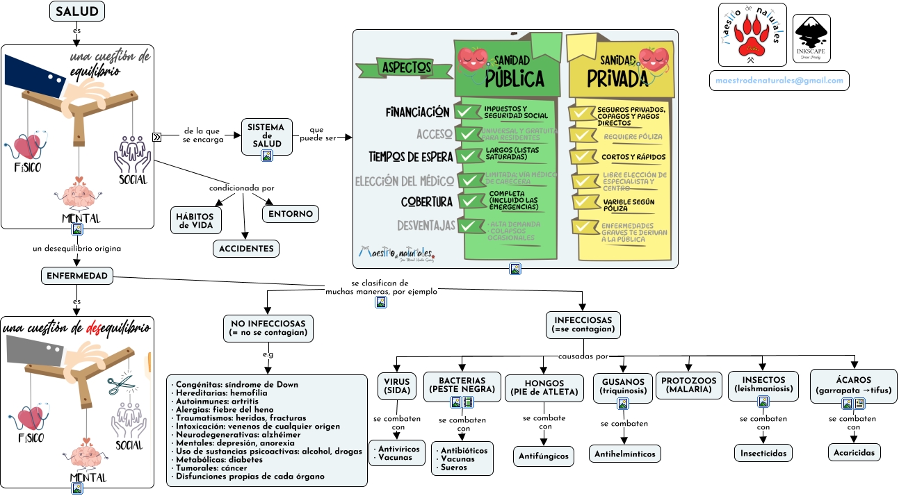 Este Cmap, tiene información relacionada con: Tema 10.04 Resumen salud y enfermedad, ENFERMEDAD se clasifican de muchas maneras, por ejemplo NO INFECCIOSAS (= no se contagian), ENFERMEDAD es, INFECCIOSAS (=se contagian) causadas por INSECTOS (leishmaniosis), ENFERMEDAD se clasifican de muchas maneras, por ejemplo INFECCIOSAS (=se contagian), un desequilibrio origina ENFERMEDAD, INFECCIOSAS (=se contagian) causadas por VIRUS (SIDA), INFECCIOSAS (=se contagian) causadas por ÁCAROS (garrapata →tifus), condicionada por ACCIDENTES, HONGOS (PIE de ATLETA) se combate con Antifúngicos, INSECTOS (leishmaniosis) se combaten con Insecticidas, condicionada por ENTORNO, INFECCIOSAS (=se contagian) causadas por BACTERIAS (PESTE NEGRA), NO INFECCIOSAS (= no se contagian) e.g · Congénitas: síndrome de Down · Hereditarias: hemofilia · Autoinmunes: artritis · Alergias: fiebre del heno · Traumatismos: heridas, fracturas · Intoxicación: venenos de cualquier origen · Neurodegenerativas: alzhéimer · Mentales: depresión, anorexia · Uso de sustancias psicoactivas: alcohol, drogas · Metabólicas: diabetes · Tumorales: cáncer · Disfunciones propias de cada órgano, INFECCIOSAS (=se contagian) causadas por HONGOS (PIE de ATLETA), condicionada por HÁBITOS de VIDA, ESTADO COMPLETO BIENESTAR formado por la triada BIENESTAR SOCIAL, GUSANOS (triquinosis) se combaten Antihelmínticos, ESTADO COMPLETO BIENESTAR formado por la triada BIENESTAR MENTAL, BACTERIAS (PESTE NEGRA) se combaten con · Antibióticos · Vacunas · Sueros, ESTADO COMPLETO BIENESTAR formado por la triada BIENESTAR FÍSICO