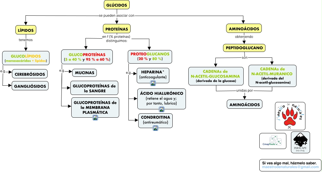 Este Cmap, tiene información relacionada con: 2.6.0 Heteroglúcidos, PEPTIDOGLUCANO son CADENAs de N-ACETIL-GLUCOSAMINA (derivado de la glucosa), PROTEOGLUCANOS (20 % y 80 %) e.g CONDROITINA (antireumático), GLUCOLÍPIDOS (monosacáridos + lípidos) e.g GANGLIÓSIDOS, AMINOÁCIDOS obteniendo PEPTIDOGLUCANO, GLÚCIDOS se pueden asociar con AMINOÁCIDOS, CADENAs de N-ACETIL-GLUCOSAMINA (derivado de la glucosa) unidas por AMINOÁCIDOS, GLÚCIDOS se pueden asociar con PROTEÍNAS, CADENAs de N-ACETIL-MURANICO (derivado del N-acetil-glucosamina) unidas por AMINOÁCIDOS, LÍPIDOS tenemos GLUCOLÍPIDOS (monosacáridos + lípidos), GLÚCIDOS se pueden asociar con LÍPIDOS, GLUCOPROTEÍNAS (5 a 40 % y 95 % a 60 %) e.g GLUCOPROTEÍNAS de la MEMBRANA PLASMÁTICA, PROTEOGLUCANOS (20 % y 80 %) e.g ÁCIDO HIALURÓNICO (retiene el agua y; por tanto, lubrica), GLUCOLÍPIDOS (monosacáridos + lípidos) e.g CEREBRÓSIDOS, PEPTIDOGLUCANO son CADENAs de N-ACETIL-MURANICO (derivado del N-acetil-glucosamina), PROTEÍNAS en f (% proteínas) distinguimos: PROTEOGLUCANOS (20 % y 80 %), GLUCOPROTEÍNAS (5 a 40 % y 95 % a 60 %) e.g MUCINAS, PROTEOGLUCANOS (20 % y 80 %) e.g HEPARINA* (anticoagulante), PROTEÍNAS en f (% proteínas) distinguimos: GLUCOPROTEÍNAS (5 a 40 % y 95 % a 60 %), GLUCOPROTEÍNAS (5 a 40 % y 95 % a 60 %) e.g GLUCOPROTEÍNAS de la SANGRE