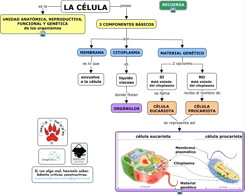 Este Cmap, tiene información relacionada con: Tema 01.06.00 Componentes celulares, MEMBRANA es lo que envuelve a la célula, 3 COMPONENTES BÁSICOS son CITOPLASMA, LA CÉLULA es la UNIDAD ANATÓMICA, REPRODUCTIVA, FUNCIONAL Y GENÉTICA de los organismos, SI está aislada del citoplasma se llama CÉLULA EUCARIOTA, 3 COMPONENTES BÁSICOS son MATERIAL GENÉTICO, LA CÉLULA posee 3 COMPONENTES BÁSICOS, MATERIAL GENÉTICO 2 opciones SI está aislada del citoplasma, NO está aislada del citoplasma recibe el nombre de CÉLULA PROCARIOTA, 3 COMPONENTES BÁSICOS son MEMBRANA, CÉLULA EUCARIOTA se representa así, líquido viscoso donde flotan ORGÁNULOS, CITOPLASMA es líquido viscoso, CÉLULA PROCARIOTA se representa así, MATERIAL GENÉTICO 2 opciones NO está aislada del citoplasma