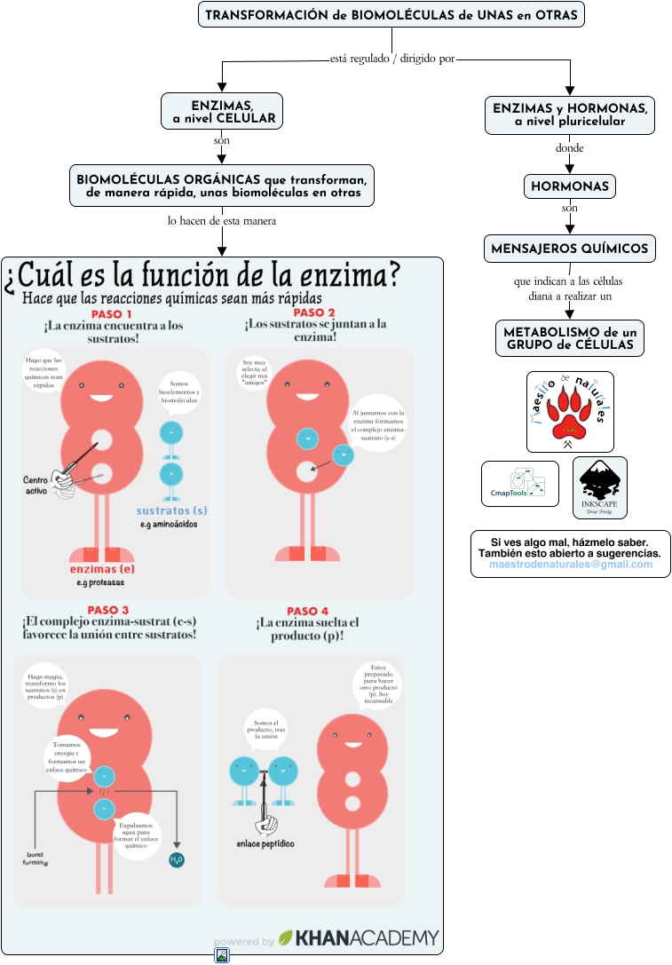 Este Cmap, tiene información relacionada con: Tema 08.01.02 Quién regula las reacciones metabólicas, TRANSFORMACIÓN de BIOMOLÉCULAS de UNAS en OTRAS está regulado / dirigido por ENZIMAS, a nivel CELULAR, ENZIMAS, a nivel CELULAR son BIOMOLÉCULAS ORGÁNICAS que transforman, de manera rápida, unas biomoléculas en otras, ENZIMAS y HORMONAS, a nivel pluricelular donde HORMONAS, HORMONAS son MENSAJEROS QUÍMICOS, TRANSFORMACIÓN de BIOMOLÉCULAS de UNAS en OTRAS está regulado / dirigido por ENZIMAS y HORMONAS, a nivel pluricelular, MENSAJEROS QUÍMICOS que indican a las células diana a realizar un METABOLISMO de un GRUPO de CÉLULAS, BIOMOLÉCULAS ORGÁNICAS que transforman, de manera rápida, unas biomoléculas en otras lo hacen de esta manera