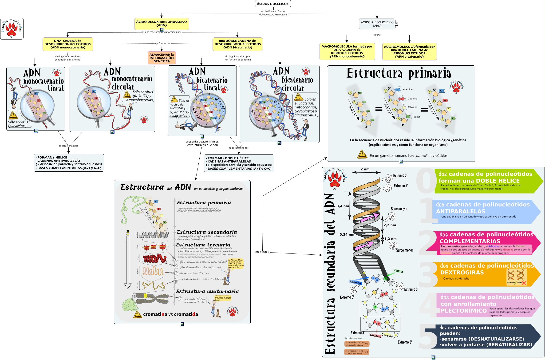 Este Cmap, tiene información relacionada con: 04.05.01 ADN, su función y su estructura primaria y secundaria, ÁCIDO RIBONUCLEICO (ARN) es una DOBLE CADENA de RIBONUCLEOTIDOS (ARN bicatenario), una DOBLE CADENA de DESOXIRRIBONUCLEOTIDOS (ADN bicatenario) distinguimos dos tipos en función de su forma, se caracteriza por · FORMAR 1 DOBLE HÉLICE · CADENAS ANTIPARALELAS (= disposición paralela y sentido opuestos) · BASES COMPLEMENTARIAS (A=T y G≡C), en detalle, se caracteriza por · FORMAR 1 HÉLICE · BASES son A,U, G y C, una DOBLE CADENA de DESOXIRRIBONUCLEOTIDOS (ADN bicatenario) distinguimos dos tipos en función de su forma, en detalle, una DOBLE CADENA de DESOXIRRIBONUCLEOTIDOS (ADN bicatenario) cuya función es ALMACENAR la INFORMACIÓN GENÉTICA, una DOBLE CADENA de RIBONUCLEOTIDOS (ARN bicatenario) distinguimos dos tipos en función de su forma ????, UNA CADENA de RIBONUCLEOTIDOS (ARN monocatenario) distinguimos dos tipos en función de su forma, se caracteriza por · FORMAR 1 DOBLE HÉLICE · CADENAS ANTIPARALELAS (= disposición paralela y sentido opuestos) · BASES COMPLEMENTARIAS (A=T y G≡C), UNA CADENA de DESOXIRRIBONUCLEOTIDOS (ADN monocatenario) cuya función es ALMACENAR la INFORMACIÓN GENÉTICA, ÁCIDO RIBONUCLEICO (ARN) es una MACROMOLÉCULA formada por UNA CADENA de RIBONUCLEOTIDOS (ARN monocatenario), ÁCIDO DESOXIRRIBONUCLEICO (ADN) es una macromolécula formada por UNA CADENA de DESOXIRRIBONUCLEOTIDOS (ADN monocatenario), UNA CADENA de RIBONUCLEOTIDOS (ARN monocatenario) distinguimos dos tipos en función de su forma, se caracteriza por · FORMAR 1 HÉLICE · CADENAS ANTIPARALELAS (= disposición paralela y sentido opuestos) · BASES COMPLEMENTARIAS (A=T y G≡C), se caracteriza por · FORMAR 1 HÉLICE · BASES son A,U, G y C, se caracteriza por · FORMAR 1 HÉLICE · CADENAS ANTIPARALELAS (= disposición paralela y sentido opuestos) · BASES COMPLEMENTARIAS (A=T y G≡C), presenta cuatro niveles estructurales que son, UNA CADENA de RIBONUCLEOTIDOS (ARN monocatenario) con función ... · ALMACENAR INFORMACIÓN GENÉTICA BIOCATALIZADORA ·FABRICAR PROTEÍNAS