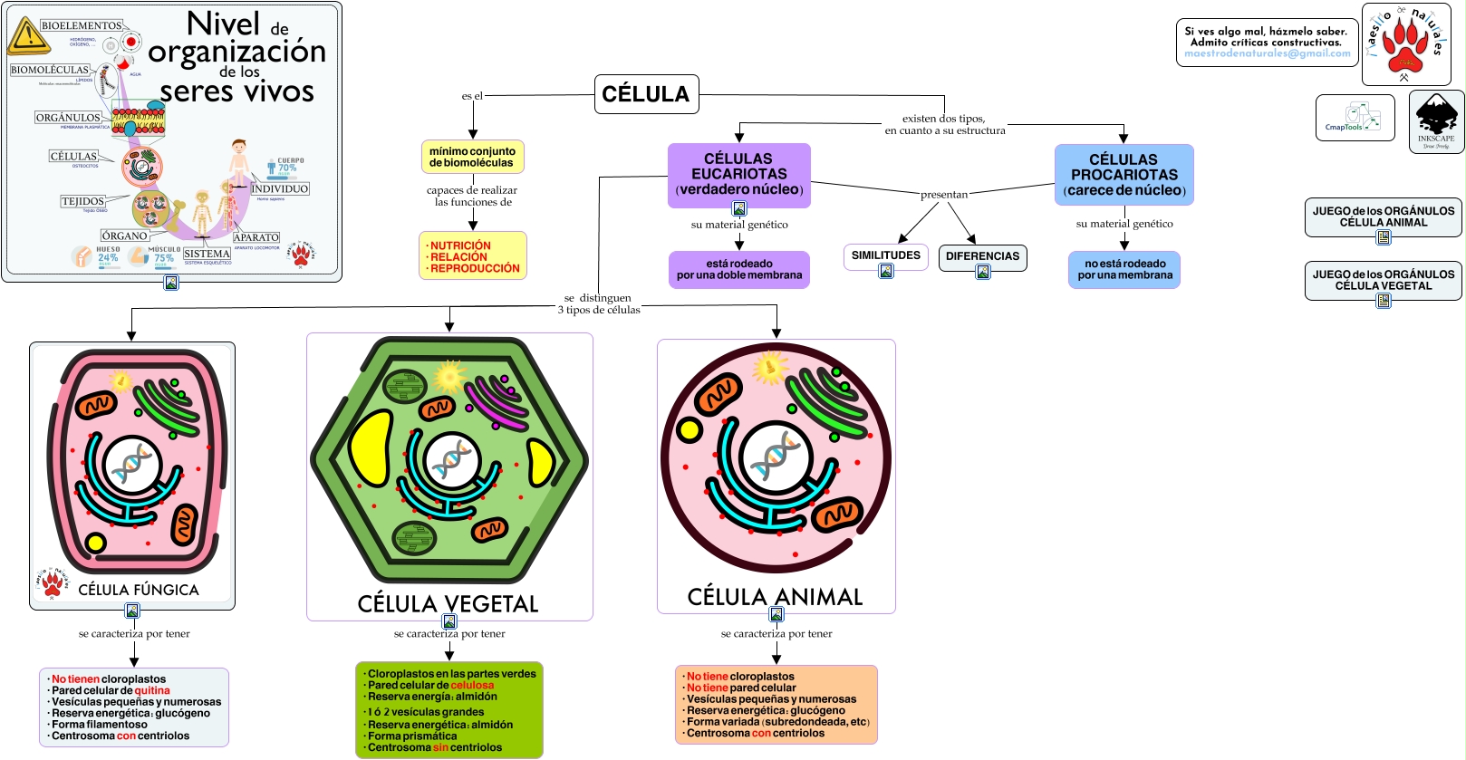 Este Cmap, tiene información relacionada con: Tema 01.05 La célula eucariota, CÉLULAS EUCARIOTAS (verdadero núcleo) se distinguen 3 tipos de células, se caracteriza por tener · Cloroplastos en las partes verdes · Pared celular de celulosa · Reserva energía: almidón · 1 ó 2 vesículas grandes · Reserva energética: almidón · Forma prismática · Centrosoma sin centriolos, CÉLULAS PROCARIOTAS (carece de núcleo) su material genético no está rodeado por una membrana, CÉLULAS PROCARIOTAS (carece de núcleo) presentan DIFERENCIAS, se caracteriza por tener · No tiene cloroplastos · No tiene pared celular · Vesículas pequeñas y numerosas · Reserva energética: glucógeno · Forma variada (subredondeada, etc) · Centrosoma con centriolos, CÉLULAS EUCARIOTAS (verdadero núcleo) se distinguen 3 tipos de células, CÉLULA es el mínimo conjunto de biomoléculas, CÉLULA existen dos tipos, en cuanto a su estructura CÉLULAS PROCARIOTAS (carece de núcleo), CÉLULA existen dos tipos, en cuanto a su estructura CÉLULAS EUCARIOTAS (verdadero núcleo), CÉLULAS EUCARIOTAS (verdadero núcleo) su material genético está rodeado por una doble membrana, CÉLULAS EUCARIOTAS (verdadero núcleo) presentan DIFERENCIAS, CÉLULAS PROCARIOTAS (carece de núcleo) presentan SIMILITUDES, mínimo conjunto de biomoléculas capaces de realizar las funciones de · NUTRICIÓN · RELACIÓN · REPRODUCCIÓN, CÉLULAS EUCARIOTAS (verdadero núcleo) presentan SIMILITUDES, CÉLULAS EUCARIOTAS (verdadero núcleo) se distinguen 3 tipos de células, se caracteriza por tener · No tienen cloroplastos · Pared celular de quitina · Vesículas pequeñas y numerosas · Reserva energética: glucógeno · Forma filamentoso · Centrosoma con centriolos
