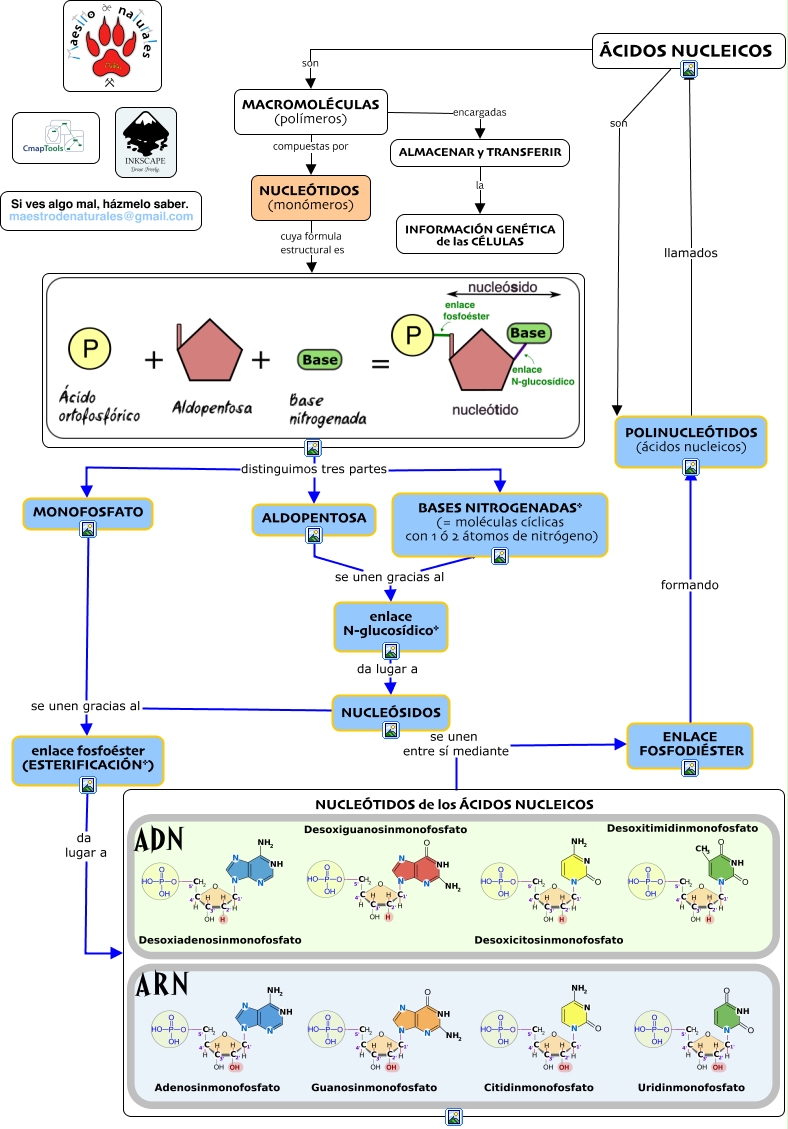 Este Cmap, tiene información relacionada con: 04.01 Qué son los ácidos nucleicos, NUCLEÓTIDOS (monómeros) cuya fórmula estructural es, MACROMOLÉCULAS (polímeros) encargadas ALMACENAR y TRANSFERIR, NUCLEÓTIDOS de los ÁCIDOS NUCLEICOS se unen entre sí mediante ENLACE FOSFODIÉSTER, MACROMOLÉCULAS (polímeros) compuestas por NUCLEÓTIDOS (monómeros), enlace N-glucosídico* da lugar a NUCLEÓSIDOS, distinguimos tres partes ALDOPENTOSA, ÁCIDOS NUCLEICOS son POLINUCLEÓTIDOS (ácidos nucleicos), ALDOPENTOSA se unen gracias al enlace N-glucosídico*, BASES NITROGENADAS* (= moléculas cíclicas con 1 ó 2 átomos de nitrógeno) se unen gracias al enlace N-glucosídico*, POLINUCLEÓTIDOS (ácidos nucleicos) llamados ÁCIDOS NUCLEICOS, ÁCIDOS NUCLEICOS son MACROMOLÉCULAS (polímeros), NUCLEÓSIDOS se unen gracias al enlace fosfoéster (ESTERIFICACIÓN*), enlace fosfoéster (ESTERIFICACIÓN*) da lugar a NUCLEÓTIDOS de los ÁCIDOS NUCLEICOS, ENLACE FOSFODIÉSTER formando POLINUCLEÓTIDOS (ácidos nucleicos), distinguimos tres partes MONOFOSFATO, distinguimos tres partes BASES NITROGENADAS* (= moléculas cíclicas con 1 ó 2 átomos de nitrógeno), MONOFOSFATO se unen gracias al enlace fosfoéster (ESTERIFICACIÓN*), ALMACENAR y TRANSFERIR la INFORMACIÓN GENÉTICA de las CÉLULAS