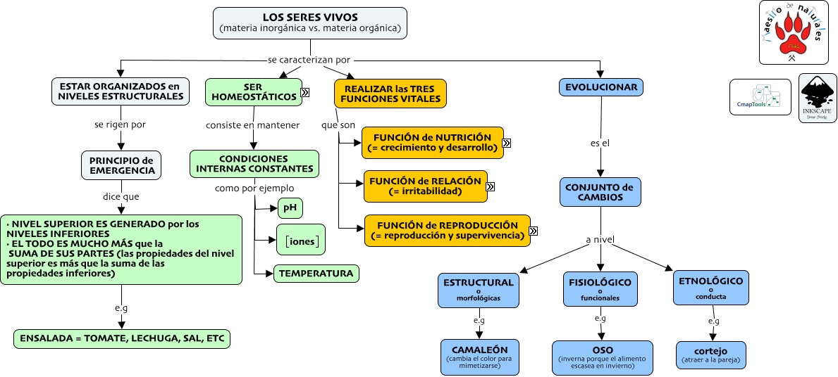 Este Cmap, tiene información relacionada con: 1.1 Los seres vivos, EVOLUCIONAR es el CONJUNTO de CAMBIOS, CAPTAR ESTIMULOS dichos estímulos pueden ser LUMINOSOS, 1º PERCIBIR/CAPTAR ESTÍMULOS EXTERNOS/INTERNOS 2º PROCESAR los ESTÍMULOS 3º RESPONDER a los ESTÍMULOS por eso los seres vivos tienen ÓRGANOS RECEPTORES, MATERIA si la materia la obtiene de... MATERIA INORGÁNICA, CONJUNTO de CAMBIOS a nivel FISIOLÓGICO o funcionales, MATERIA necesaria para CRECER, · NIVEL SUPERIOR ES GENERADO por los NIVELES INFERIORES · EL TODO ES MUCHO MÁS que la SUMA DE SUS PARTES (las propiedades del nivel superior es más que la suma de las propiedades inferiores) e.g ENSALADA = TOMATE, LECHUGA, SAL, ETC, QUÍMICOS como HORMONAS (= moléculas orgánicas del sistema endocrino), ESTRUCTURAL o morfológicas e.g CAMALEÓN (cambia el color para mimetizarse), SER HOMEOSTÁTICOS consiste en mantener CONDICIONES INTERNAS CONSTANTES, MANTENER CONSTANTE las VARIABLES del MEDIO INTERNO ¿cuáles son las variables? temperatura, REALIZAR las TRES FUNCIONES VITALES que son FUNCIÓN de REPRODUCCIÓN (= reproducción y supervivencia), LOS SERES VIVOS (materia inorgánica vs. materia orgánica) se caracterizan por EVOLUCIONAR, HORMONAS (= moléculas orgánicas del sistema endocrino) que al llegar MEMBRANA PLASMÁTICA de la CÉLULA DIANA, LOS SERES VIVOS (materia inorgánica vs. materia orgánica) se caracterizan por ESTAR ORGANIZADOS en NIVELES ESTRUCTURALES, FUNCIÓN NUTRICIÓN es la capacidad de obtener MATERIA, CAPTAR ESTIMULOS dichos estímulos pueden ser SONOROS, MANTENER CONSTANTE las VARIABLES del MEDIO INTERNO ¿cuáles son las variables? [CO2], HOMEOSTASIS conjunto de procesos cuyo objetivo es MANTENER CONSTANTE las VARIABLES del MEDIO INTERNO, REPRODUCCIÓN SEXUAL donde 2 INDIVIDUOS (♂♀) al fusionar sus gametos genera otro INDIVIDUO parecido a ambos.
