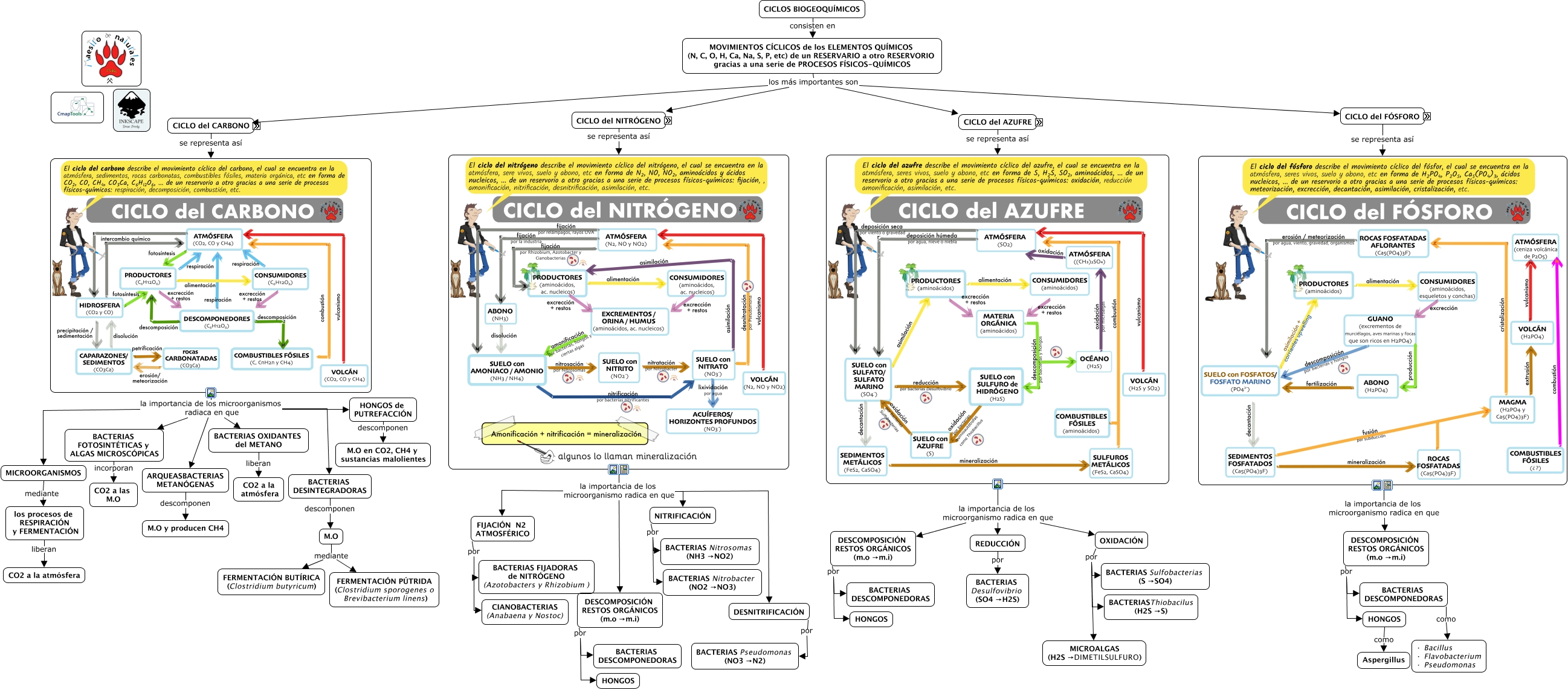 Este Cmap, tiene información relacionada con: Tema 17.6 Microorganismos y el ciclo de la materia, DISTINTOS RESERVORIOS del AZUFRE SUFRE una serie de TRANSFORMACIONES FÍSICO -QUÍMICAS que hace que AZUFRE se mueva entre la ATMÓSFERA, GEOSFERA, HIDROSFERA y BISOFERA ¿cuáles son esas transformaciones? REDUCCIÓN es la ganancia de electrones, MOVIMIENTOS CÍCLICOS de los ELEMENTOS QUÍMICOS (N, C, O, H, Ca, Na, S, P, etc) de un RESERVARIO a otro RESERVORIO gracias a una serie de PROCESOS FÍSICOS-QUÍMICOS los más importantes son CICLO del FÓSFORO, DISTINTOS RESERVORIOS del FÓSFORO SUFRE una serie de TRANSFORMACIONES FÍSICO -QUÍMICAS que hace que FÓSFORO se mueva entre la ATMÓSFERA, GEOSFERA, HIDROSFERA y BISOFERA ¿cuáles son esas transformaciones? ASIMILACIÓN: los plantas toman el fosfato y lo utilizan para fabricar ácidos nucleicos, M.O mediante FERMENTACIÓN BUTÍRICA (Clostridium butyricum), MOVIMIENTOS CÍCLICOS de los ELEMENTOS QUÍMICOS (N, C, O, H, Ca, Na, S, P, etc) de un RESERVARIO a otro RESERVORIO gracias a una serie de PROCESOS FÍSICOS-QUÍMICOS los más importantes son CICLO del AZUFRE, ARQUEASBACTERIAS METANÓGENAS descomponen M.O y producen CH4, OXIDACIÓN por BACTERIASThiobacilus (H2S →S), DISTINTOS RESERVORIOS del AZUFRE SUFRE una serie de TRANSFORMACIONES FÍSICO -QUÍMICAS que hace que AZUFRE se mueva entre la ATMÓSFERA, GEOSFERA, HIDROSFERA y BISOFERA ¿cuáles son esos reservorios? ATMÓSFERA: el azufre se encuentra en forma de gases como SO, SO2 y SO4, la importancia de los microorganismos radiaca en que ARQUEASBACTERIAS METANÓGENAS, CICLO del AZUFRE es el movimiento ciclico de los DISTINTOS RESERVORIOS del AZUFRE SUFRE una serie de TRANSFORMACIONES FÍSICO -QUÍMICAS que hace que AZUFRE se mueva entre la ATMÓSFERA, GEOSFERA, HIDROSFERA y BISOFERA, DISTINTOS RESERVORIOS del CARBONO SUFRE una serie de TRANSFORMACIONES FÍSICO -QUÍMICAS que hace que CARBONO se mueva entre la ATMÓSFERA, GEOSFERA, HIDROSFERA y BISOFERA ¿cuáles son esos reservorios? AGUA del MAR: el CO y CO2 se encuentra disuelto en el agua, DISTINTOS RESERVORIOS del NITRÓGENO SUFRE una serie de TRANSFORMACIONES FÍSICO -QUÍMICAS que hace que NITRÓGENO se mueva entre la ATMÓSFERA, GEOSFERA, HIDROSFERA y BISOFERA ¿cuáles son esas transformaciones? FIJACIÓN: proceso mediante el cual el ENZIMA NITROGENASA reduce el nitrógeno atmosférico, MOVIMIENTOS CÍCLICOS de los ELEMENTOS QUÍMICOS (N, C, O, H, Ca, Na, S, P, etc) de un RESERVARIO a otro RESERVORIO gracias a una serie de PROCESOS FÍSICOS-QUÍMICOS los más importantes son CICLO del CARBONO, OXIDACIÓN por BACTERIAS Sulfobacterias (S →SO4), DISTINTOS RESERVORIOS del CARBONO SUFRE una serie de TRANSFORMACIONES FÍSICO -QUÍMICAS que hace que CARBONO se mueva entre la ATMÓSFERA, GEOSFERA, HIDROSFERA y BISOFERA ¿cuáles son esas transformaciones? PRECIPITACIÓN: proceso mediante el cual el CARBONO cae como fina lluvia sobre caparazones y el fondo marino, DESCOMPOSICIÓN RESTOS ORGÁNICOS (m.o →m.i) por HONGOS, DISTINTOS RESERVORIOS del NITRÓGENO SUFRE una serie de TRANSFORMACIONES FÍSICO -QUÍMICAS que hace que NITRÓGENO se mueva entre la ATMÓSFERA, GEOSFERA, HIDROSFERA y BISOFERA ¿cuáles son esos reservorios? SUELOS con AMONIACO, AMONIO, NITRITOS y NITRATOS, DESCOMPOSICIÓN RESTOS ORGÁNICOS (m.o →m.i) por HONGOS, DISTINTOS RESERVORIOS del NITRÓGENO SUFRE una serie de TRANSFORMACIONES FÍSICO -QUÍMICAS que hace que NITRÓGENO se mueva entre la ATMÓSFERA, GEOSFERA, HIDROSFERA y BISOFERA ¿cuáles son esas transformaciones? DESNITRIFICACIÓN: transformación del nitrato en nitrógeno atmosférico (N2) por bacterias denitrificantes como Pseudomonas, DISTINTOS RESERVORIOS del CARBONO SUFRE una serie de TRANSFORMACIONES FÍSICO -QUÍMICAS que hace que CARBONO se mueva entre la ATMÓSFERA, GEOSFERA, HIDROSFERA y BISOFERA ¿cuáles son esas transformaciones? SEDIMENTACIÓN: proceso mediante el cual el CARBONO es se deposita en el fondo marino