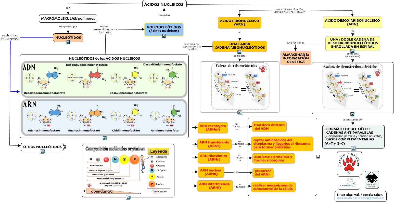Este Cmap, tiene información relacionada con: Tema 01.02.04 Ácidos nucleicos, ÁCIDO DESOXIRRIBONUCLEICO (ADN) es UNA / DOBLE CADENA DE DESOXIRRIBONUCLEÓTIDOS ENROLLADA EN ESPIRAL, ... que actúan como COENZIMAS e.g NADP, ... que actúan como COENZIMAS e.g CoA, NUCLEÓTIDOS son NADP, UNA / DOBLE CADENA DE DESOXIRRIBONUCLEÓTIDOS ENROLLADA EN ESPIRAL cuya función es ALMACENAR la INFORMACIÓN GENÉTICA, NUCLEÓTIDOS son CoA, NUCLEÓTIDOS se clasifican en dos grupos NUCLEÓTIDOS de los ÁCIDOS NUCLEICOS, NUCLEÓTIDOS son ATP ADP AMP, NUCLEÓTIDOS son FAD, se caracteriza por · FORMAR 1 DOBLE HÉLICE · CADENAS ANTIPARALELAS (= disposición paralela y sentido opuestos) · BASES COMPLEMENTARIAS (A=T y G≡C), NUCLEÓTIDOS sus funciones metabólicas ... ... dadores de energía: como los nucleótidos trifosfatos, ÁCIDOS NUCLEICOS son MACROMOLÉCULAS/ polímeros, NUCLEÓTIDOS se clasifican en dos grupos OTROS NUCLEÓTIDOS, UNA LARGA CADENA RIBONUCLEÓTIDOS cuya longitud depende del tipo de ARN ARN ribosómico (ARNr), ÁCIDOS NUCLEICOS se clasifican en función del tipo ALDOPENTOSA en ÁCIDO DESOXIRRIBONUCLEICO (ADN), ARN mensajero (ARNm) su fución es transferir órdenes del ADN, ÁCIDOS NUCLEICOS se clasifican en función del tipo ALDOPENTOSA en ÁCIDO RIBONUCLEICO (ARN), NUCLEÓTIDOS de los ÁCIDOS NUCLEICOS se unen entre sí mediante formando POLINUCLEÓTIDOS (ácidos nucleicos), ARN transferente (ARNt) su función es captar aminoácidos del citoplasma y llevarlos al ribosoma para formar proteínas, UNA LARGA CADENA RIBONUCLEÓTIDOS cuya longitud depende del tipo de ARN ARN transferente (ARNt)