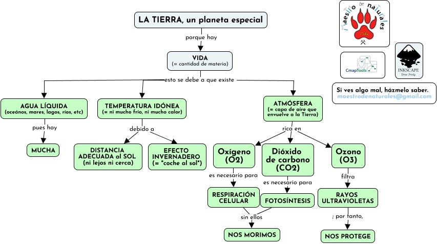 Este Cmap, tiene información relacionada con: Tema 04.01 La Tierra, un planeta especial, LA TIERRA, un planeta especial porque hay VIDA (= cantidad de materia), AGUA LÍQUIDA (oceános, mares, lagos, ríos, etc) pues hay MUCHA, VIDA (= cantidad de materia) esto se debe a que existe TEMPERATURA IDÓNEA (= ni mucho frío, ni mucho calor), TEMPERATURA IDÓNEA (= ni mucho frío, ni mucho calor) debido a DISTANCIA ADECUADA al SOL (ni lejos ni cerca), VIDA (= cantidad de materia) esto se debe a que existe AGUA LÍQUIDA (oceános, mares, lagos, ríos, etc), RESPIRACIÓN CELULAR sin ellos NOS MORIMOS, Dióxido de carbono (CO2) es necesario para FOTOSÍNTESIS, ATMÓSFERA (= capa de aire que envuelve a la Tierra) rica en Dióxido de carbono (CO2), VIDA (= cantidad de materia) esto se debe a que existe ATMÓSFERA (= capa de aire que envuelve a la Tierra), Ozono (O3) filtra RAYOS ULTRAVIOLETAS, TEMPERATURA IDÓNEA (= ni mucho frío, ni mucho calor) debido a EFECTO INVERNADERO (= "coche al sol"), Oxígeno (O2) es necesario para RESPIRACIÓN CELULAR, ATMÓSFERA (= capa de aire que envuelve a la Tierra) rica en Ozono (O3), FOTOSÍNTESIS sin ellos NOS MORIMOS, RAYOS ULTRAVIOLETAS ; por tanto, NOS PROTEGE, ATMÓSFERA (= capa de aire que envuelve a la Tierra) rica en Oxígeno (O2)