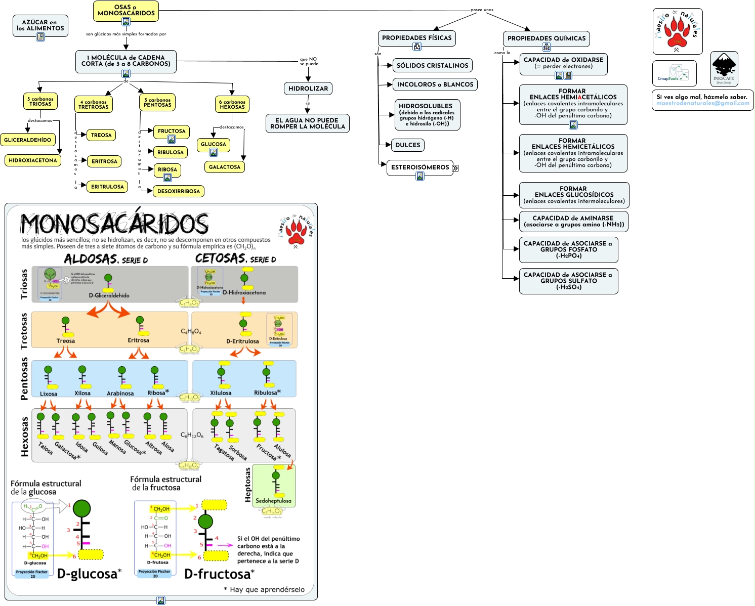 Este Cmap, tiene información relacionada con: 2.2.0 Monosacáridos, 5 carbonos PENTOSAS d e s t a c a m o s l a DESOXIRRIBOSA, OSAS o MONOSACÁRIDOS posee unas PROPIEDADES FÍSICAS, 3 carbonos TRIOSAS destacamos HIDROXIACETONA, PROPIEDADES FÍSICAS son INCOLOROS o BLANCOS, 6 carbonos HEXOSAS destacamos GALACTOSA, 5 carbonos PENTOSAS d e s t a c a m o s l a RIBOSA, MISMO ENLACES ENTRE SUS ÁTOMOS todo esto significa ISÓMERO *, PROPIEDADES QUÍMICAS como la CAPACIDAD de ASOCIARSE a GRUPOS FOSFATO (-H2PO4), PROPIEDADES FÍSICAS son SÓLIDOS CRISTALINOS, 1 MOLÉCULA de CADENA CORTA (de 3 a 8 CARBONOS) de 3 carbonos TRIOSAS, 1 MOLÉCULA de CADENA CORTA (de 3 a 8 CARBONOS) que NO se puede HIDROLIZAR, PROPIEDADES QUÍMICAS como la FORMAR ENLACES HEMICETÁLICOS (enlaces covalentes intramoleculares entre el grupo carbonilo y -OH del penúltimo carbono), MISMA SECUENCIA de ÁTOMOS ENLAZADOS todo esto significa ISÓMERO *, ISÓMERO * que tiene una MISMA SECUENCIA de ÁTOMOS ENLAZADOS, 3 carbonos TRIOSAS destacamos GLICERALDEHÍDO, 4 carbonos TRETROSAS d e s t a c a m o s l a TREOSA, PROPIEDADES QUÍMICAS como la CAPACIDAD de OXIDARSE (= perder electrones), ISÓMERO * que tiene una MISMO ENLACES ENTRE SUS ÁTOMOS, PROPIEDADES FÍSICAS son ESTEROISÓMEROS, 4 carbonos TRETROSAS d e s t a c a m o s l a ERITROSA