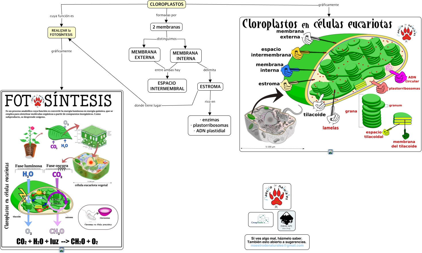 Este Cmap, tiene información relacionada con: Tema 06.10 Cloroplastos, CLOROPLASTOS gráficamente, ESTROMA rico en · enzimas · plastorribosomas · ADN plastidial, MEMBRANA INTERNA delimita ESTROMA, REALIZAR la FOTOSÍNTESIS gráficamente ????, 2 membranas distinguimos MEMBRANA EXTERNA, MEMBRANA EXTERNA entre ambas hay ESPACIO INTERMEMBRAL, 2 membranas distinguimos MEMBRANA INTERNA, MEMBRANA INTERNA entre ambas hay ESPACIO INTERMEMBRAL, ESTROMA donde tiene lugar REALIZAR la FOTOSÍNTESIS, CLOROPLASTOS cuya función es REALIZAR la FOTOSÍNTESIS, CLOROPLASTOS formadas por 2 membranas