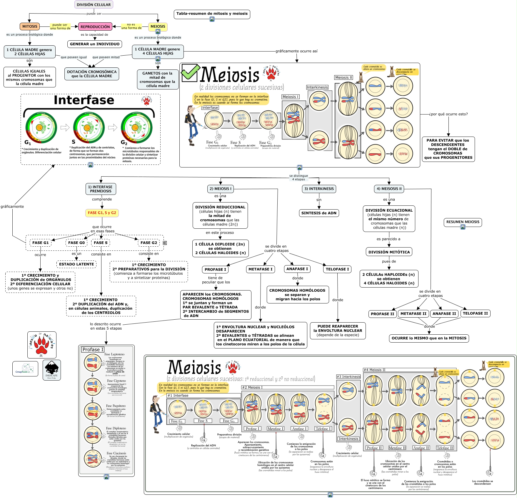 Este Cmap, tiene información relacionada con: Tema 02.06 Meiosis, PROFASE II donde OCURRE lo MISMO que en la MITOSIS, FASE G0 es un ESTADO LATENTE, 2) MEIOSIS I se divide en cuatro etapas METAFASE I, FASE S consiste en 1º CRECIMIENTO 2º DUPLICACIÓN del ADN y, en células animales, duplicación de los CENTRIOLOS, ???? gráficamente, FASE G2 consiste en 1º CRECIMIENTO 2º PREPARATIVOS para la DIVISIÓN (comienza a formarse los microtúbulos y a sintetizar proteínas), TELOFASE II donde OCURRE lo MISMO que en la MITOSIS, se distingue 4 etapas 4) MEISOSIS II, 4) MEISOSIS II se divide en cuatro etapas PROFASE II, TELOFASE I donde PUEDE REAPARECER la ENVOLTURA NUCLEAR (depende de la especie), 2) MEIOSIS I es una DIVISIÓN REDUCCIONAL (células hijas (n) tienen la mitad de cromosomas que las células madre (2n)), se distingue 4 etapas 3) INTERKINESIS, 1 CÉLULA MADRE genere 4 CÉLULAS HIJAS son GAMETOS con la mitad de cromosomas que la célula madre, 2) MEIOSIS I se divide en cuatro etapas TELOFASE I, FASE G1, S y G2 que ocurre en esas fases FASE G1, DIVISIÓN CELULAR puede ser MITOSIS, ¿por qué ocurre esto? PARA EVITAR que los DESCENDIENTES tengan el DOBLE de CROMOSOMAS que sus PROGENITORES, 4) MEISOSIS II se divide en cuatro etapas METAFASE II, 1 CÉLULA MADRE genera 2 CÉLULAS HIJAS son CÉLULAS IGUALES al PROGENITOR con los mismos cromosomas que la célula madre, DIVISIÓN ECUACIONAL (células hijas (n) tienen el mismo número de cromosomas que las células madre (n)) es parecido a DIVISIÓN MITÓTICA