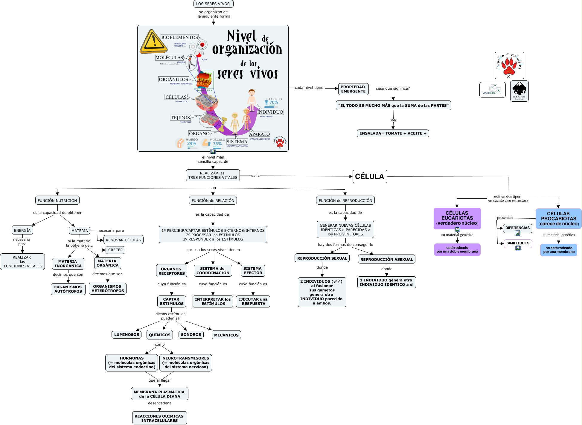 Este Cmap, tiene información relacionada con: Tema 07.12 Función de relación en la célula, SISTEMA EFECTOR cuya función es EJECUTAR una RESPUESTA, FUNCIÓN de REPRODUCCIÓN es la capacidad de GENERAR NUEVAS CÉLULAS IDÉNTICAS o PARECIDAS a los PROGENITORES, REALIZAR las TRES FUNCIONES VITALES son FUNCIÓN NUTRICIÓN, CÉLULAS PROCARIOTAS (carece de núcleo) presentan DIFERENCIAS, 1º PERCIBIR/CAPTAR ESTÍMULOS EXTERNOS/INTERNOS 2º PROCESAR los ESTÍMULOS 3º RESPONDER a los ESTÍMULOS por eso los seres vivos tienen SISTEMA EFECTOR, MATERIA INORGÁNICA decimos que son ORGANISMOS AUTÓTROFOS, FUNCIÓN NUTRICIÓN es la capacidad de obtener MATERIA, QUÍMICOS como NEUROTRANSMISORES (= moléculas orgánicas del sistema nervioso), REALIZAR las TRES FUNCIONES VITALES son FUNCIÓN de RELACIÓN, GENERAR NUEVAS CÉLULAS IDÉNTICAS o PARECIDAS a los PROGENITORES hay dos formas de conseguirlo REPRODUCCIÓN ASEXUAL, GENERAR NUEVAS CÉLULAS IDÉNTICAS o PARECIDAS a los PROGENITORES hay dos formas de conseguirlo REPRODUCCIÓN SEXUAL, REPRODUCCIÓN SEXUAL donde 2 INDIVIDUOS (♂♀) al fusionar sus gametos genera otro INDIVIDUO parecido a ambos., PROPIEDAD EMERGENTE ¿eso qué significa? "EL TODO ES MUCHO MÁS que la SUMA de las PARTES", FUNCIÓN NUTRICIÓN es la capacidad de obtener ENERGÍA, CAPTAR ESTIMULOS dichos estímulos pueden ser QUÍMICOS, MATERIA necesaria para CRECER, SISTEMA de COORDINACIÓN cuya función es INTERPRETAR los ESTÍMULOS, CÉLULA existen dos tipos, en cuanto a su estructura CÉLULAS PROCARIOTAS (carece de núcleo), cada nivel tiene PROPIEDAD EMERGENTE, CAPTAR ESTIMULOS dichos estímulos pueden ser MECÁNICOS