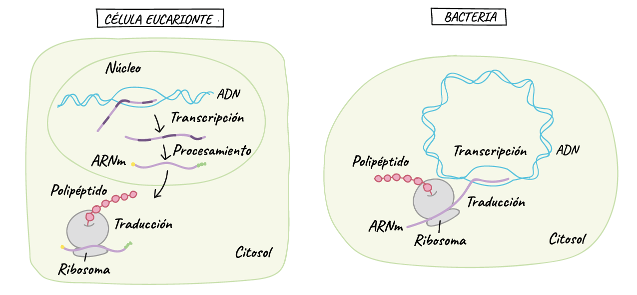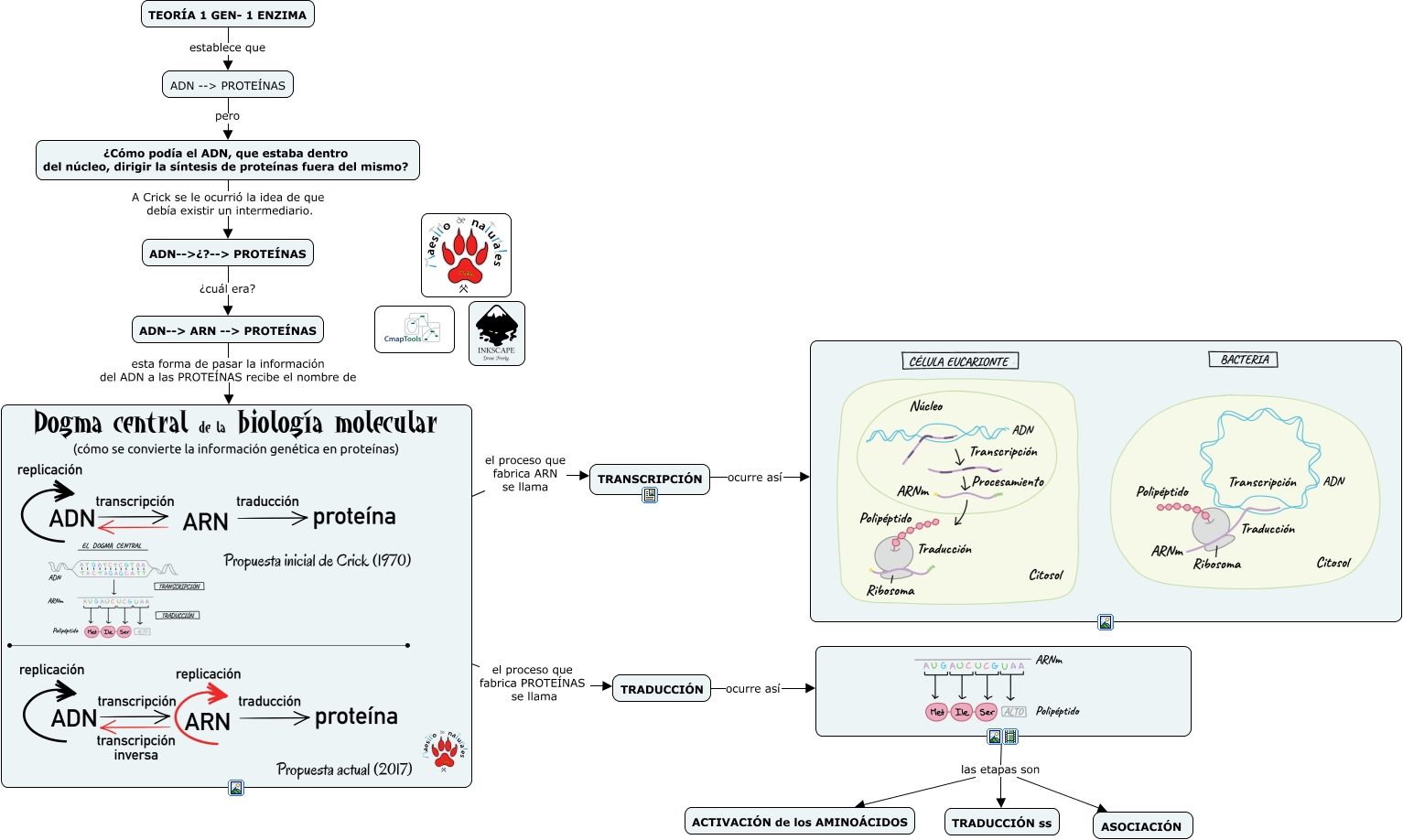 Este Cmap, tiene información relacionada con: Tema 14.6 Cómo se expresa la información genética, ADN-->¿?--> PROTEÍNAS ¿cuál era? ADN--> ARN --> PROTEÍNAS, TEORÍA 1 GEN- 1 ENZIMA establece que ADN --> PROTEÍNAS, TRADUCCIÓN ocurre así, las etapas son TRADUCCIÓN ss, ADN --> PROTEÍNAS pero ¿Cómo podía el ADN, que estaba dentro del núcleo, dirigir la síntesis de proteínas fuera del mismo?, ¿Cómo podía el ADN, que estaba dentro del núcleo, dirigir la síntesis de proteínas fuera del mismo? A Crick se le ocurrió la idea de que debía existir un intermediario. ADN-->¿?--> PROTEÍNAS, las etapas son ACTIVACIÓN de los AMINOÁCIDOS, el proceso que fabrica PROTEÍNAS se llama TRADUCCIÓN, el proceso que fabrica ARN se llama TRANSCRIPCIÓN, ADN--> ARN --> PROTEÍNAS esta forma de pasar la información del ADN a las PROTEÍNAS recibe el nombre de, TRANSCRIPCIÓN ocurre así, las etapas son ASOCIACIÓN