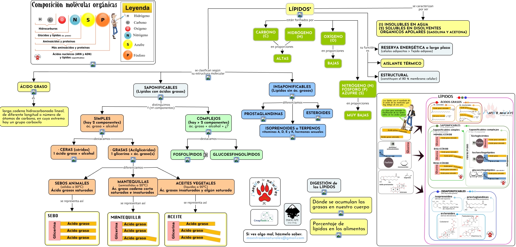 Este Cmap, tiene información relacionada con: Tema 01.02.02 Lípidos, · GRASAS (Acilglicéridos) 1 glicerina + ác. graso(s) diferenciamos MANTEQUILLAS (semisólidas a 20ºC) Ác. graso cadena corta saturados e insaturados, INSAPONIFICABLES (Lípidos sin ác. grasos) diferenciamos ISOPRENOIDES o TERPENOS vitaminas A, D, E y K, hormonas sexuales, COMPLEJOS (hay > 2 componentes) ác. graso + alcohol + ¿? destacamos GLUCOESFINGOLÍPIDOS, INSAPONIFICABLES (Lípidos sin ác. grasos) diferenciamos ESTEROIDES, SAPONIFICABLES (Lípidos con ácidos grasos) distinguimos f (nº componentes) SIMPLES (hay 2 componentes) ác. graso + alcohol, LÍPIDOS* su función es AISLANTE TÉRMICO, LÍPIDOS* su función es RESERVA ENERGÉTICA a largo plazo (células adipocitos > Tejido adiposo), ÁCIDO GRASO es larga cadena hidrocarbonada lineal, de diferente longitud o número de átomos de carbono, en cuyo extremo hay un grupo carboxilo, SAPONIFICABLES (Lípidos con ácidos grasos) distinguimos f (nº componentes) COMPLEJOS (hay > 2 componentes) ác. graso + alcohol + ¿?, LÍPIDOS* se clasifican según su estructura molecular SAPONIFICABLES (Lípidos con ácidos grasos), MANTEQUILLAS (semisólidas a 20ºC) Ác. graso cadena corta saturados e insaturados se representan así, SIMPLES (hay 2 componentes) ác. graso + alcohol destacamos · CERAS (céridos) 1 ácido graso + alcohol, CARBONO (C) en proporciones ALTAS, SEBOS ANIMALES (sólidas a 20ºC) Ácido grasos saturados se representa así, LÍPIDOS* su función es ESTRUCTURAL (constituyen el 80 % membrana celular), LÍPIDOS* se clasifican según su estructura molecular ÁCIDO GRASO, LÍPIDOS* se clasifican según su estructura molecular INSAPONIFICABLES (Lípidos sin ác. grasos), · GRASAS (Acilglicéridos) 1 glicerina + ác. graso(s) diferenciamos ACEITES VEGETALES (líquidas a 20ºC) Ác. grasos insaturados y algún saturado, LÍPIDOS* están formados por CARBONO (C), LÍPIDOS* se caracterizan por ser (1) INSOLUBLES EN AGUA (2) SOLUBLES EN DISOLVENTES ORGÁNICOS APOLARES (GASOLINA Y ACETONA)