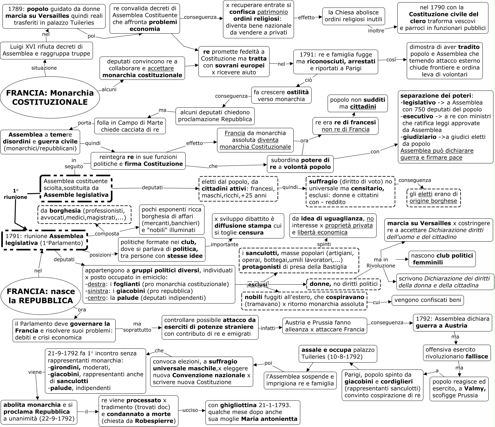 Questa Cmap, creata con IHMC CmapTools, contiene informazioni relative a: FRANCIA_monarchia Costituzionale, 1791: riunione Assemblea legislativa (1°Parlamento) posizioni politiche formate nei club, dove si parlava di politica, tra persone con stesse idee, eletti dal popolo, da cittadini attivi: francesi, maschi,ricchi,+25 anni quindi suffragio (diritto di voto) no universale ma censitario, esclusi: donne e cittatini con - reddito, re convalida decreti di Assemblea Costituente che affronta problemi economia conseguenza x recuperare entrate si confisca patrimonio ordini religiosi: diventa bene nazionale da vendere a privati, abolita monarchia e si proclama Repubblica a unanimità (22-9-1792) il re viene processato x tradimento (trovati doc) e condannato a morte (chiesta da Robespierre), Francia da monarchia assoluta diventa monarchia Costituzionale ora re era re di francesi non re di Francia, 1791: re e famiglia fugge ma riconosciuti, arrestati e riportati a Parigi ciò fa crescere ostilità verso monarchia, controllare possibile attacco da eserciti di potenze straniere con contributo di re e emigrati infatti Austria e Prussia fanno alleanza x attaccare Francia, il Parlamento deve governare la Francia e risolvere suoi problemi: debiti e crisi economica ma soprattutto controllare possibile attacco da eserciti di potenze straniere con contributo di re e emigrati, donne, no diritti politici ma in Rivoluzione nascono club politici femminili, donne, no diritti politici ma in Rivoluzione marcia su Versailles x costringere re a accettare Dichiarazione diritti dell'uomo e del cittadino, la Chiesa abolisce ordini religiosi inutili inoltre nel 1790 con la Costituzione civile del clero traforma vescovi e parroci in funzionari pubblici, deputati convincono re a collaborare e accettare monarchia costituzionale ???? re promette fedeltà a Costituzione ma tratta con sovrani europei x ricevere aiuto, 1791: riunione Assemblea legislativa (1°Parlamento) composta da borghesia (professionisti, avvocati,medici,magistrati,...), assale e occupa palazzo Tuileries (10-8-1792) ???? l'Assemblea sospende e imprigiona re e famiglia, 1791: riunione Assemblea legislativa (1°Parlamento) deputati appartengono a gruppi politici diversi, individuati x posto occupato in emiciclo: -destra: i foglianti (pro monarchia costituzionale) -sinistra: i giacobini (pro repubblica) -centro: la palude (deputati indipendenti), Assemblea a temere disordini e guerra civile (monarchici/repubblicani) quindi reintegra re in sue funzioni politiche e firma Costituzione, popolo reagisce ed esercito, a Valmy, scofigge Prussia a Parigi, popolo spinto da giacobini e cordiglieri (rappresentanti sanculotti) convinto cospirazione di re, FRANCIA: Monarchia COSTITUZIONALE situazione Luigi XVI rifiuta decreti di Assemblea e raggruppa truppe, reintegra re in sue funzioni politiche e firma Costituzione in seguito Assemblea costituente sciolta,sostituita da Assemble legislativa, convoca elezioni, a suffragio universale maschile,x eleggere nuova Convenzione nazionale x scrivere nuova Costituzione che 21-9-1792 fa 1° incontro senza rappresentanti monarchia: -girondini, moderati, -giacobini, rappresentanti anche di sanculotti -palude, indipendenti