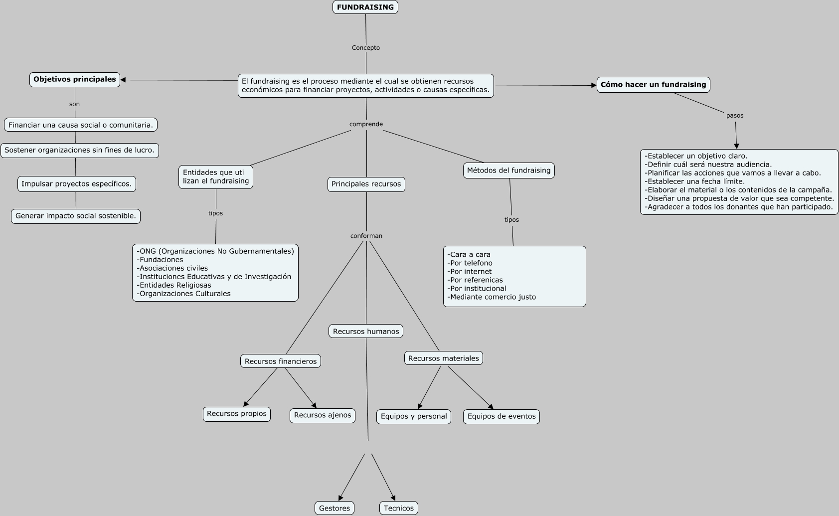 Este Cmap, tiene información relacionada con: Mapa conceptual Fundraising, Recursos materiales ???? Equipos de eventos, El fundraising es el proceso mediante el cual se obtienen recursos económicos para financiar proyectos, actividades o causas específicas. comprende Métodos del fundraising, Recursos financieros ???? Recursos ajenos, Objetivos principales son Generar impacto social sostenible., El fundraising es el proceso mediante el cual se obtienen recursos económicos para financiar proyectos, actividades o causas específicas. ???? Cómo hacer un fundraising, Cómo hacer un fundraising pasos -Establecer un objetivo claro. -Definir cuál será nuestra audiencia. -Planificar las acciones que vamos a llevar a cabo. -Establecer una fecha límite. -Elaborar el material o los contenidos de la campaña. -Diseñar una propuesta de valor que sea competente. -Agradecer a todos los donantes que han participado., El fundraising es el proceso mediante el cual se obtienen recursos económicos para financiar proyectos, actividades o causas específicas. comprende Principales recursos, El fundraising es el proceso mediante el cual se obtienen recursos económicos para financiar proyectos, actividades o causas específicas. ???? Objetivos principales, Recursos materiales ???? Equipos y personal, Principales recursos conforman Recursos materiales, Recursos humanos Gestores, Principales recursos conforman Recursos humanos, Entidades que uti lizan el fundraising tipos -ONG (Organizaciones No Gubernamentales) -Fundaciones -Asociaciones civiles -Instituciones Educativas y de Investigación -Entidades Religiosas -Organizaciones Culturales, FUNDRAISING Concepto El fundraising es el proceso mediante el cual se obtienen recursos económicos para financiar proyectos, actividades o causas específicas., Principales recursos conforman Recursos financieros, Recursos financieros ???? Recursos propios, Métodos del fundraising tipos -Cara a cara -Por telefono -Por internet -Por referenicas -Por institucional -Mediante comercio justo, Recursos humanos Tecnicos, El fundraising es el proceso mediante el cual se obtienen recursos económicos para financiar proyectos, actividades o causas específicas. comprende Entidades que uti lizan el fundraising