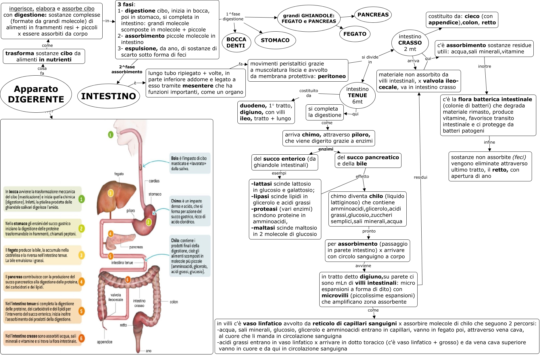 Questa Cmap, creata con IHMC CmapTools, contiene informazioni relative a: Apparato DIGERENTE_fasi2-3, in tratto detto digiuno,su parete ci sono mLn di villi intestinali: micro espansioni a forma di dito) con microvilli (piccolissime espansioni) che amplificano zona assorbente residui materiale non assorbito da villi intestinali, x valvola ileo- cecale, va in intestino crasso, movimenti peristaltici grazie a muscolatura liscia e avvolto da membrana protettiva: peritoneo si divide in intestino CRASSO 2 mt, intestino TENUE 6mt costituito da duodeno, 1° tratto, digiuno, con villi ileo, tratto + lungo, 3 fasi: 1- digestione cibo, inizia in bocca, poi in stomaco, si completa in intestino: grandi molecole scomposte in molecole + piccole 2- assorbimento piccole molecole in intestino 3- espulsione, da ano, di sostanze di scarto sotto forma di feci 1^fase digestione BOCCA DENTI, c'è la flora batterica intestinale (colonie di batteri) che degrada materiale rimasto, produce vitamine, favorisce transito intestinale e ci protegge da batteri patogeni infine sostanze non assorbite (feci) vengono eliminate attraverso ultimo tratto, il retto, con apertura di ano, materiale non assorbito da villi intestinali, x valvola ileo- cecale, va in intestino crasso qui c'è assorbimento sostanze residue utili: acqua,sali minerali,vitamine, per assorbimento (passaggio in parete intestino) x arrivare con circolo sanguigno a corpo avviene in tratto detto digiuno,su parete ci sono mLn di villi intestinali: micro espansioni a forma di dito) con microvilli (piccolissime espansioni) che amplificano zona assorbente, intestino CRASSO 2 mt qui c'è assorbimento sostanze residue utili: acqua,sali minerali,vitamine, ingerisce, elabora e assorbe cibo con digestione: sostanze complesse (formate da grandi molecole) di alimenti in frammenti resi + piccoli x essere assorbiti da corpo in 3 fasi: 1- digestione cibo, inizia in bocca, poi in stomaco, si completa in intestino: grandi molecole scomposte in molecole + piccole 2- assorbimento piccole molecole in intestino 3- espulsione, da ano, di sostanze di scarto sotto forma di feci, grandi GHIANDOLE: FEGATO e PANCREAS ???? FEGATO, INTESTINO è lungo tubo ripiegato + volte, in parte inferiore addome e legato a esso tramite mesentere che ha funzioni importanti, come un organo, intestino TENUE 6mt qui si completa la digestione, lungo tubo ripiegato + volte, in parte inferiore addome e legato a esso tramite mesentere che ha funzioni importanti, come un organo fa movimenti peristaltici grazie a muscolatura liscia e avvolto da membrana protettiva: peritoneo, grandi GHIANDOLE: FEGATO e PANCREAS ???? PANCREAS, del succo pancreatico e della bile effetto chimo diventa chilo (liquido lattiginoso) che contiene amminoacidi,glicerolo,acidi grassi,glucosio,zuccheri semplici,sali minerali,acqua, -lattasi scinde lattosio in glucosio e galattosio; -lipasi scinde lipidi in glicerolo e acidi grassi -proteasi (vari enzimi) scindono proteine in amminoacidi, -maltasi scinde maltosio in 2 molecole di glucosio effetto chimo diventa chilo (liquido lattiginoso) che contiene amminoacidi,glicerolo,acidi grassi,glucosio,zuccheri semplici,sali minerali,acqua, 3 fasi: 1- digestione cibo, inizia in bocca, poi in stomaco, si completa in intestino: grandi molecole scomposte in molecole + piccole 2- assorbimento piccole molecole in intestino 3- espulsione, da ano, di sostanze di scarto sotto forma di feci 1^fase digestione STOMACO, 3 fasi: 1- digestione cibo, inizia in bocca, poi in stomaco, si completa in intestino: grandi molecole scomposte in molecole + piccole 2- assorbimento piccole molecole in intestino 3- espulsione, da ano, di sostanze di scarto sotto forma di feci 2^fase assorbimento INTESTINO, c'è assorbimento sostanze residue utili: acqua,sali minerali,vitamine inoltre c'è la flora batterica intestinale (colonie di batteri) che degrada materiale rimasto, produce vitamine, favorisce transito intestinale e ci protegge da batteri patogeni, trasforma sostanze cibo da alimenti in nutrienti come ingerisce, elabora e assorbe cibo con digestione: sostanze complesse (formate da grandi molecole) di alimenti in frammenti resi + piccoli x essere assorbiti da corpo